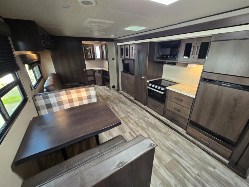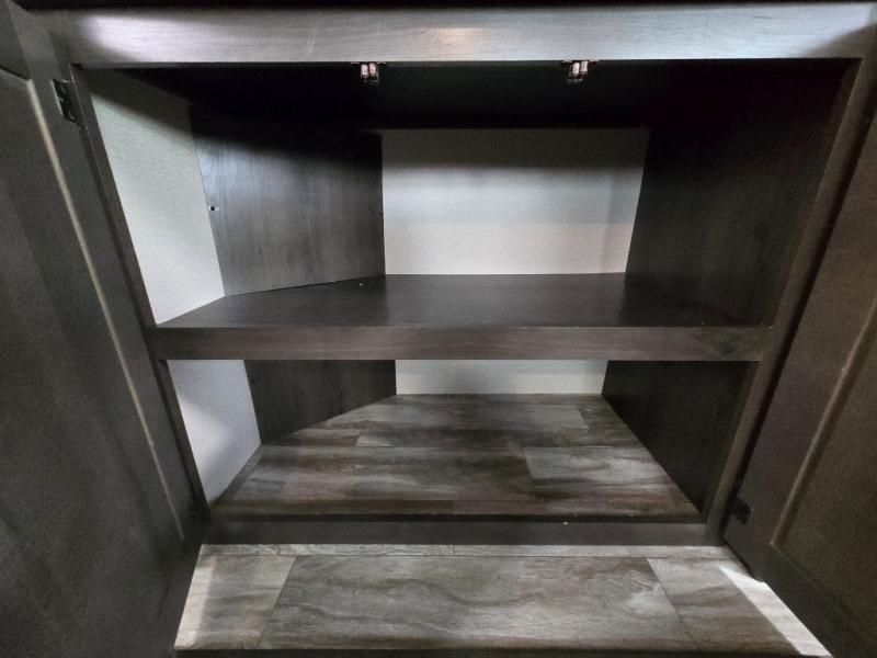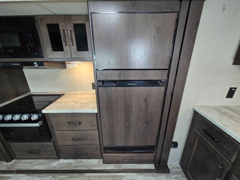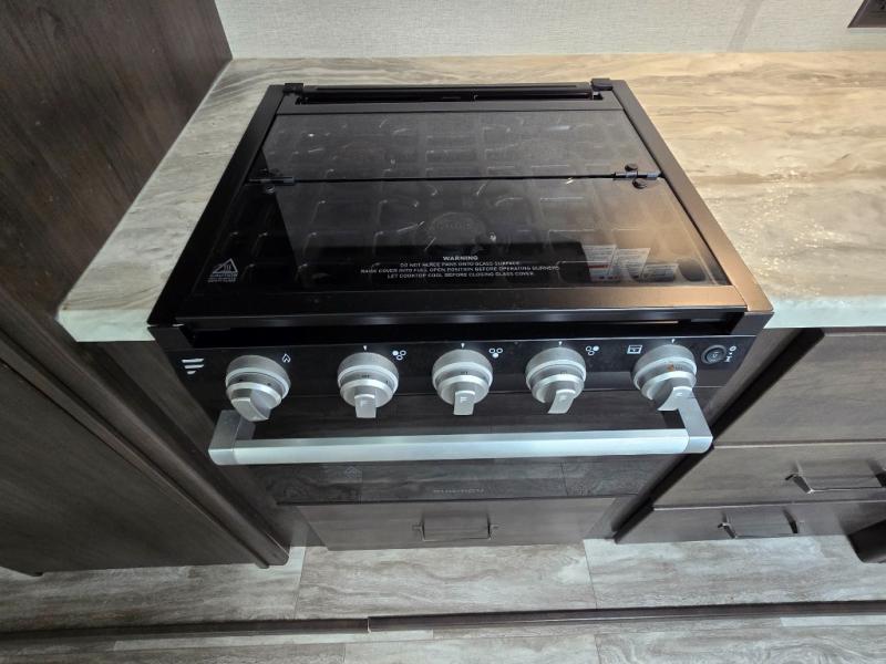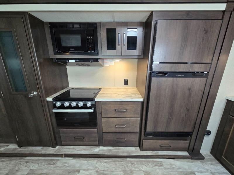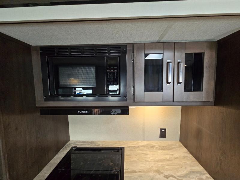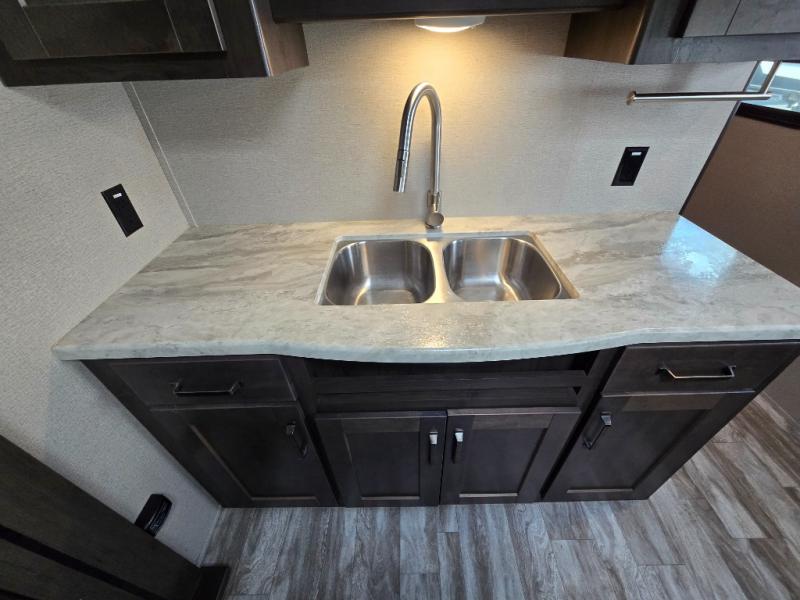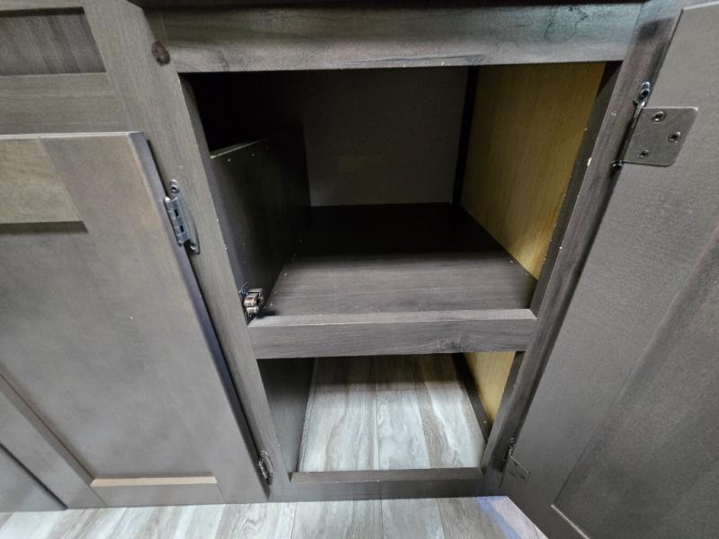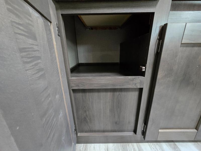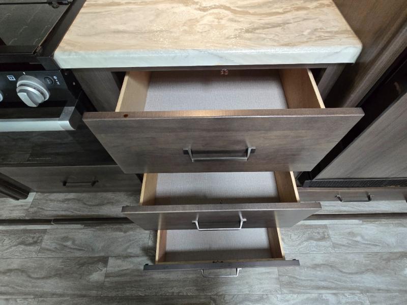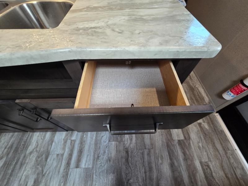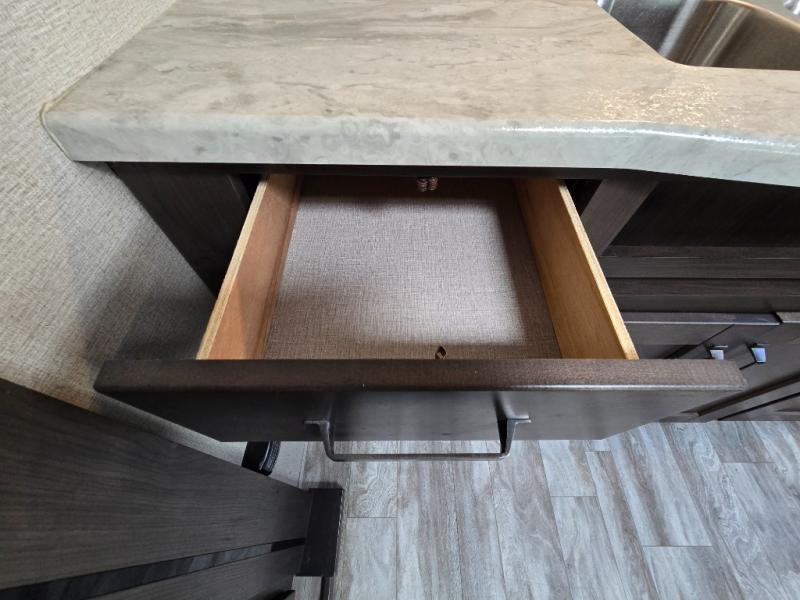 Designed with thoughtful touches like a built-in pet drawer, residential countertops, and upgraded furniture, this model makes you feel right at home. The microwave oven and ample counter space make meal prep easy, while the universal docking station simplifies hookups at any campsite.