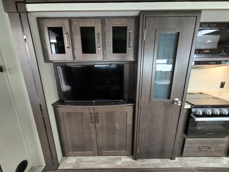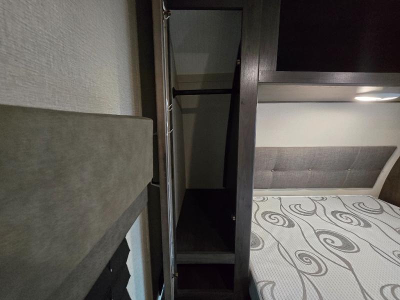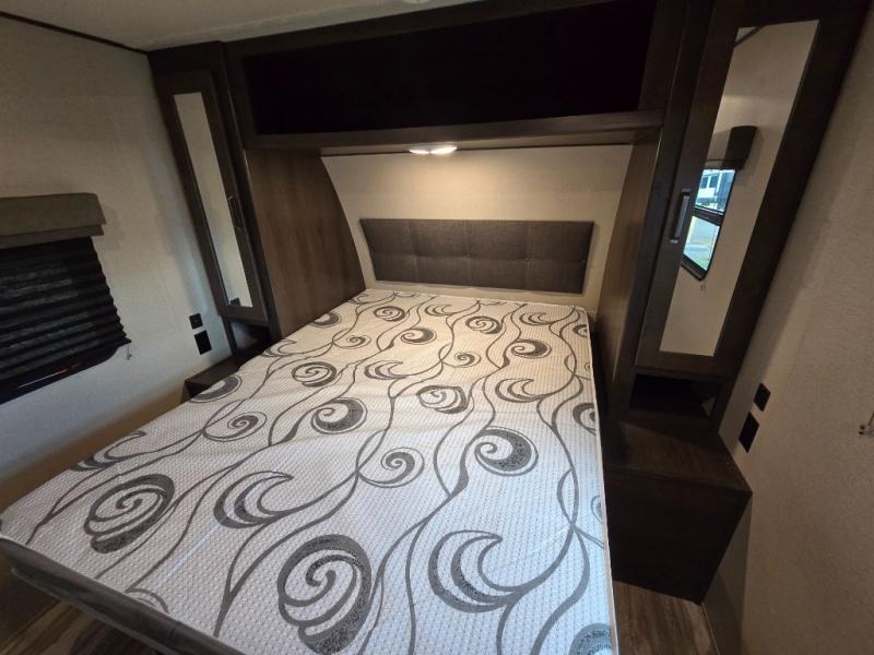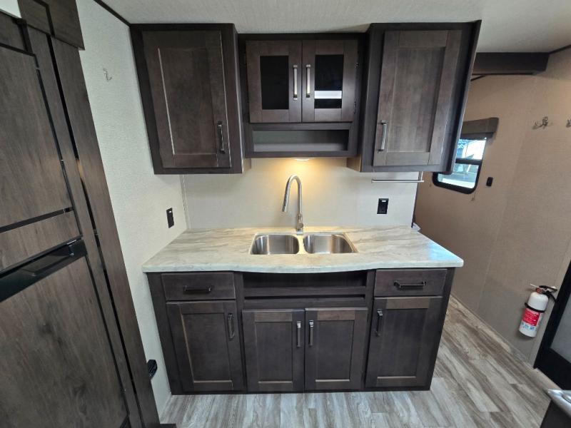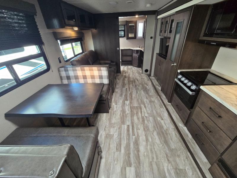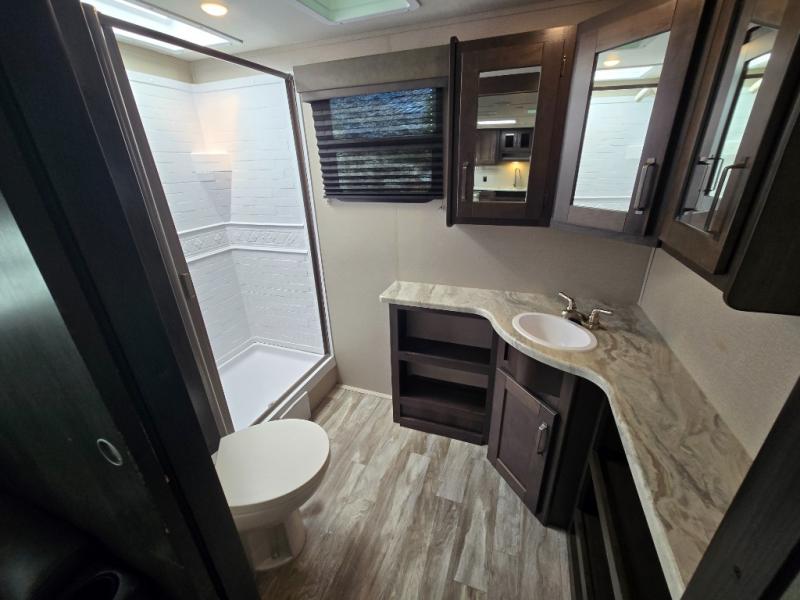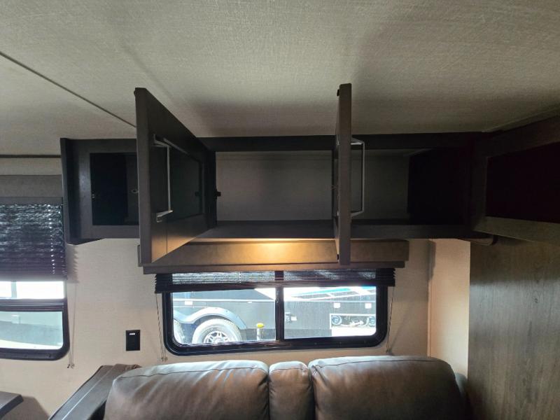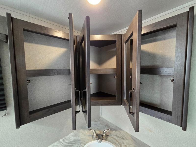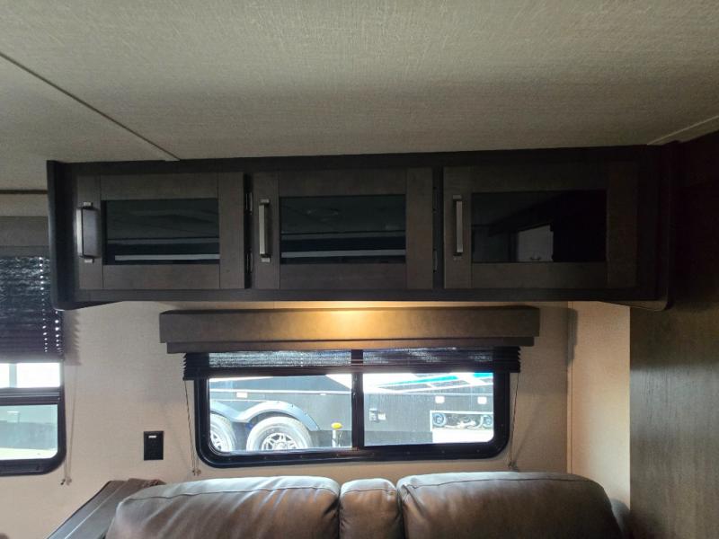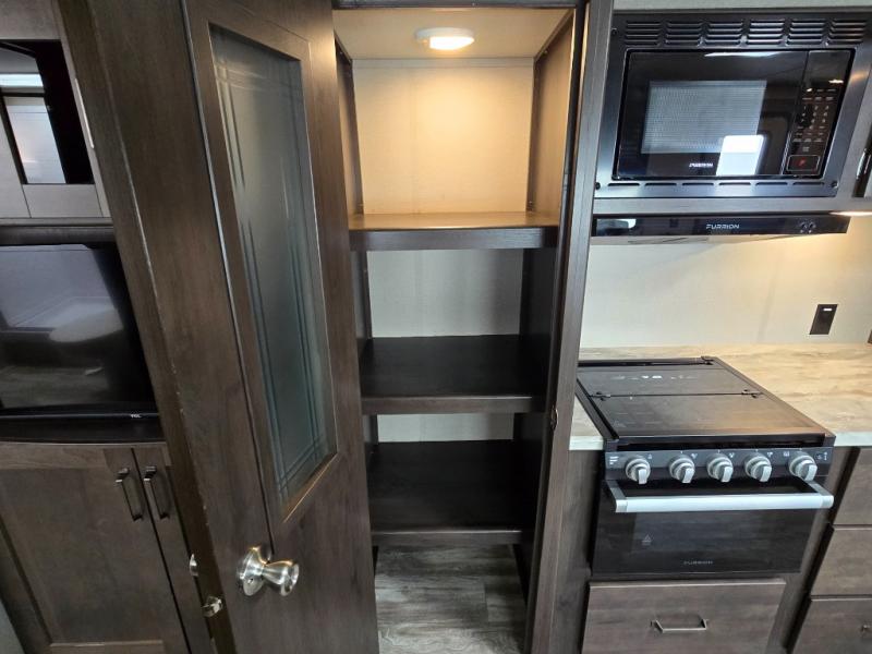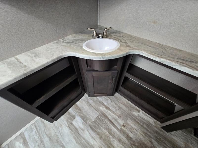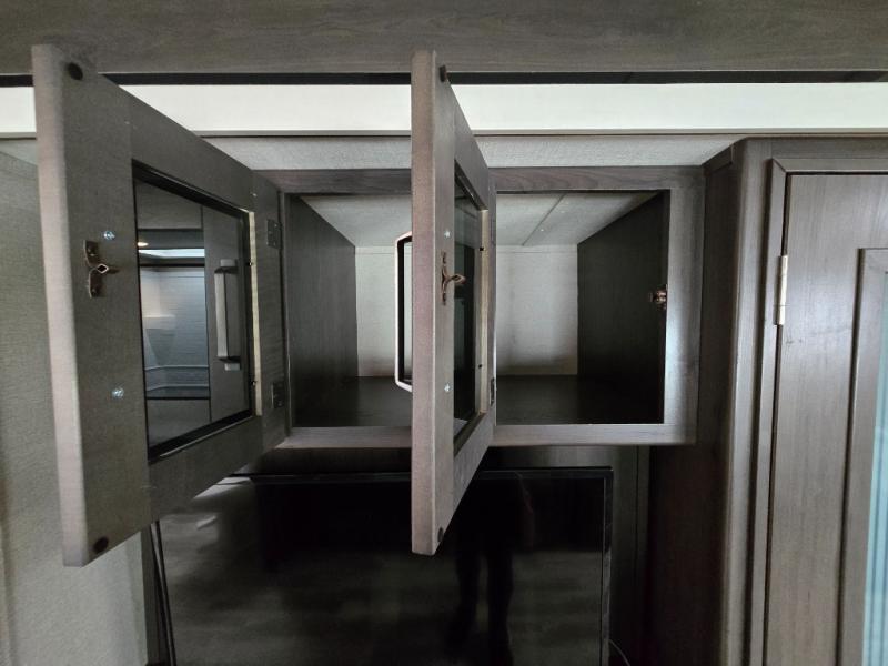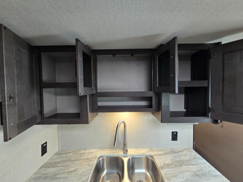 Designed with thoughtful touches like a built-in pet drawer, residential countertops, and upgraded furniture, this model makes you feel right at home. The microwave oven and ample counter space make meal prep easy, while the universal docking station simplifies hookups at any campsite.