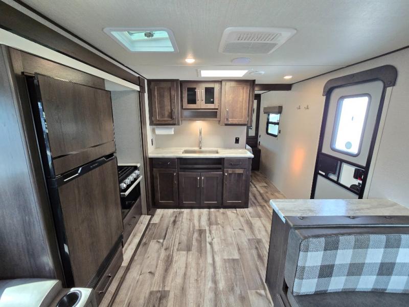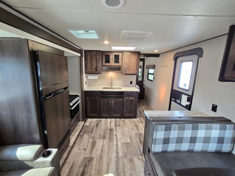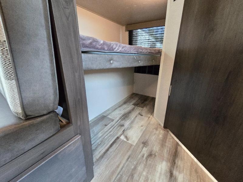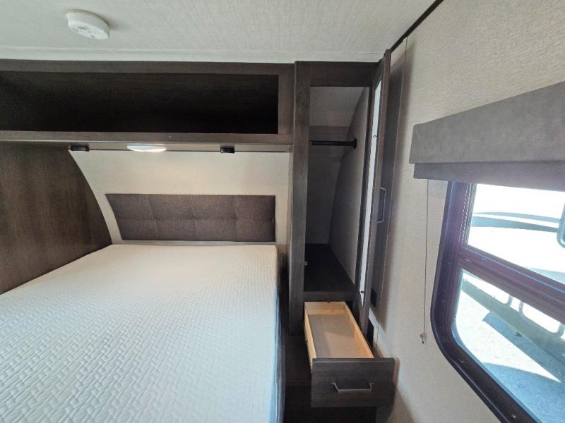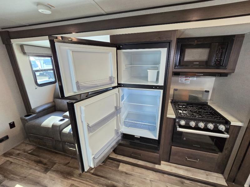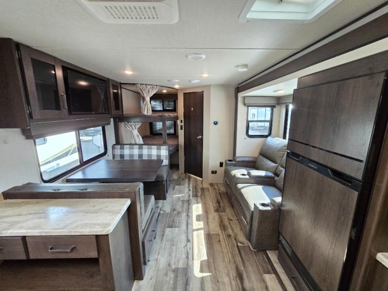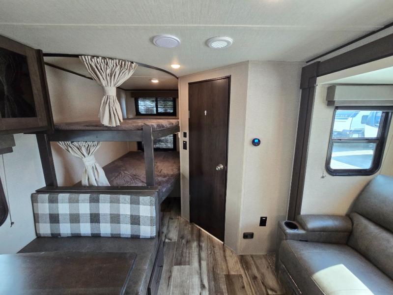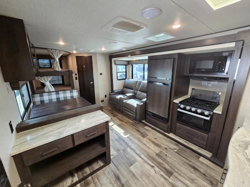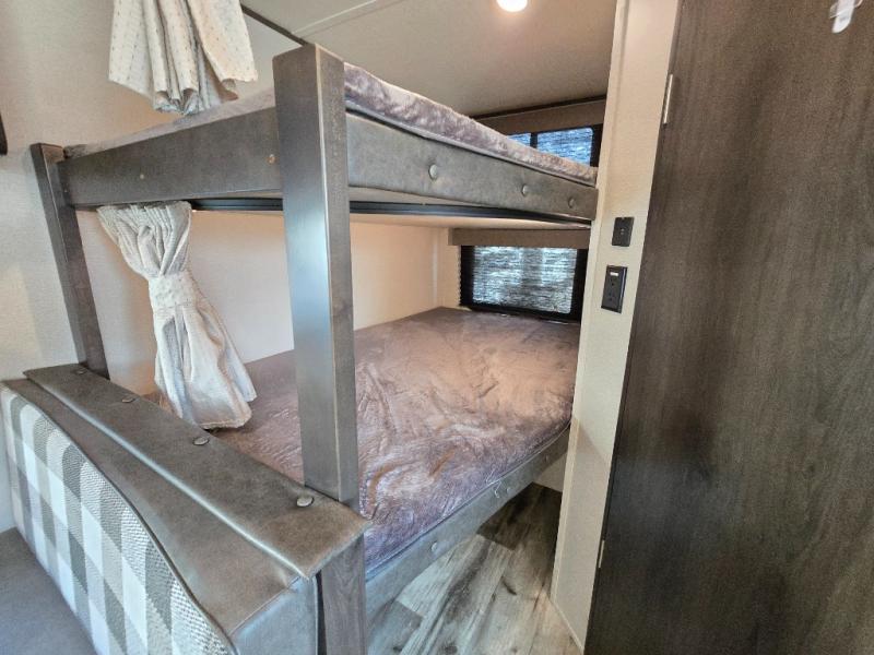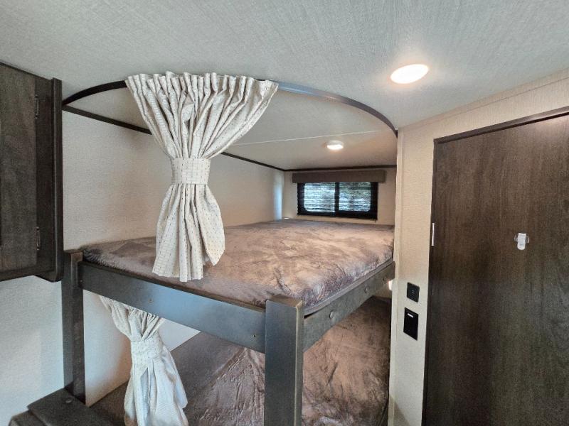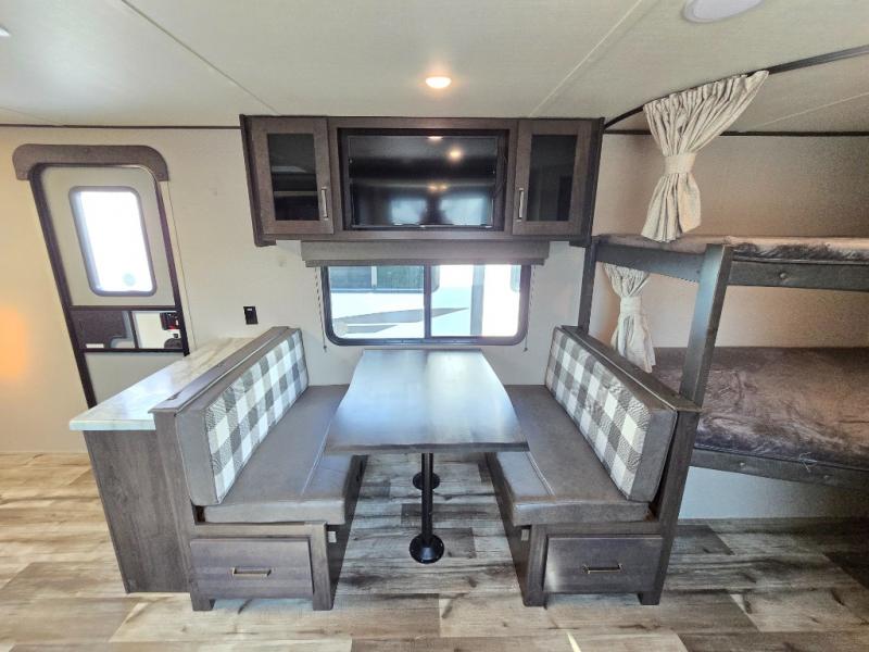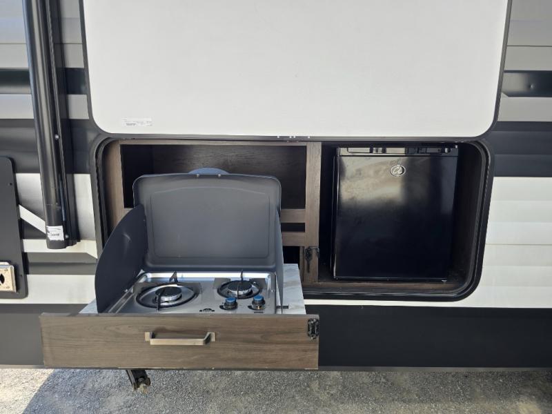 Camping with friends or family is easier than ever in this spacious travel trailer. You can easily sleep nine with the double-size bunks, the tri-fold sofa, and the queen bed in the front private bedroom. The booth dinette can even be used to sleep a guest or two little ones. Prepare your meals on the three-burner cooktop indoors or on the two-burner cooktop at the outside kitchen! You'll also find an exterior spray port, a drawer to store utensils, and a 1.6-cu. ft. outdoor refrigerator for drinks! It will be so easy to fill the dog's food bowl with the added pet drawer under the refrigerator, and the full bath in this model means you don't have to use the camp's facilities.