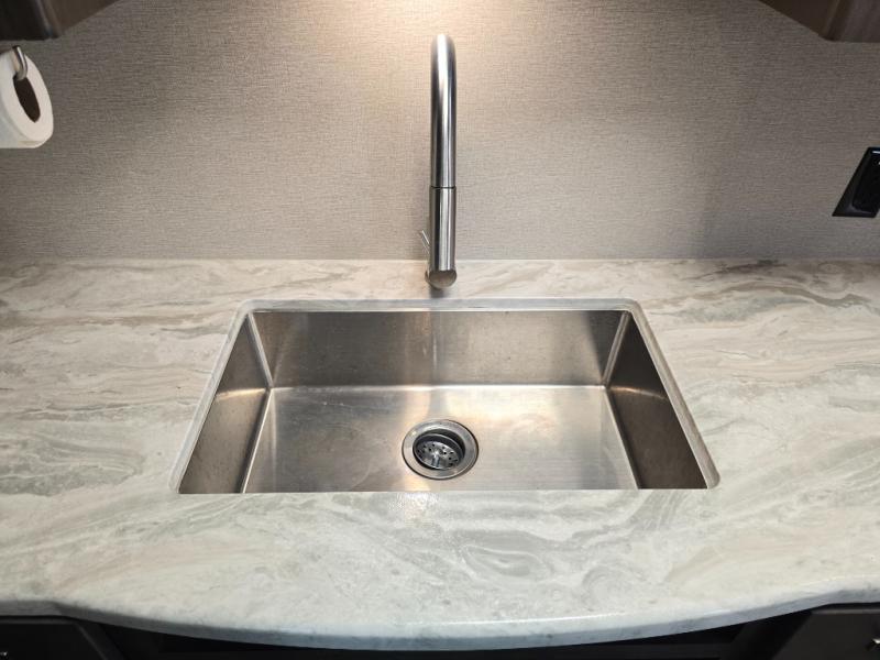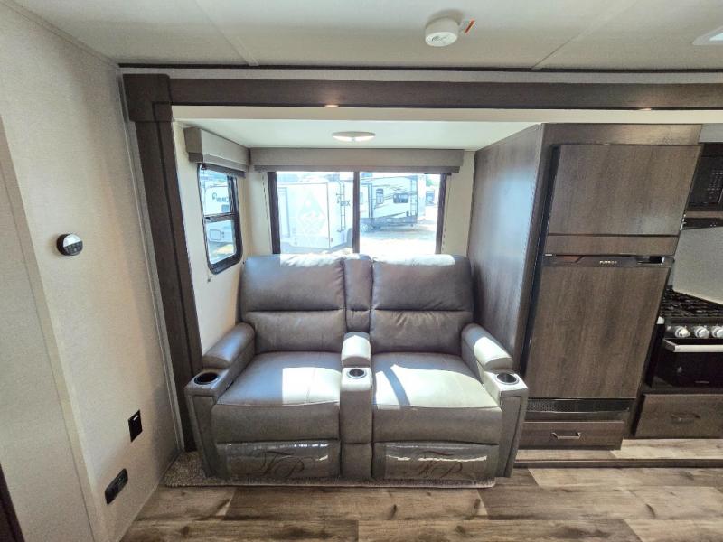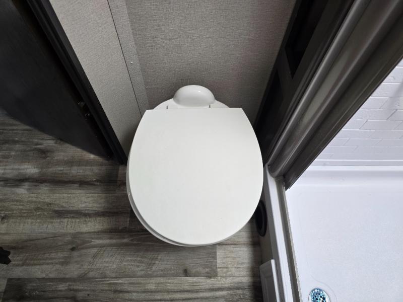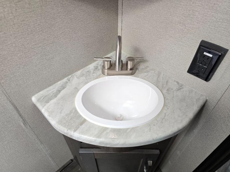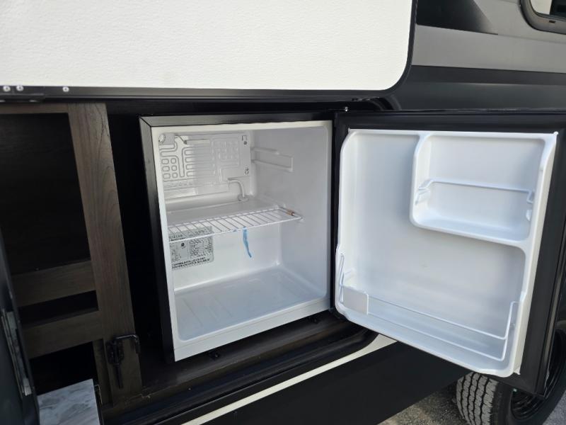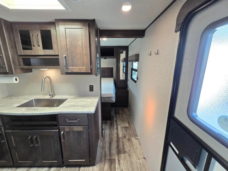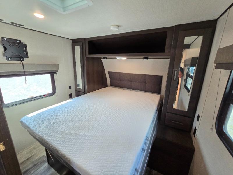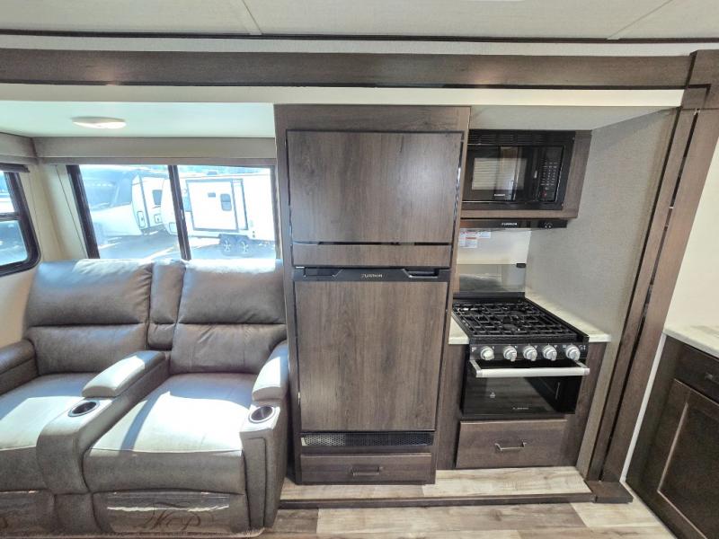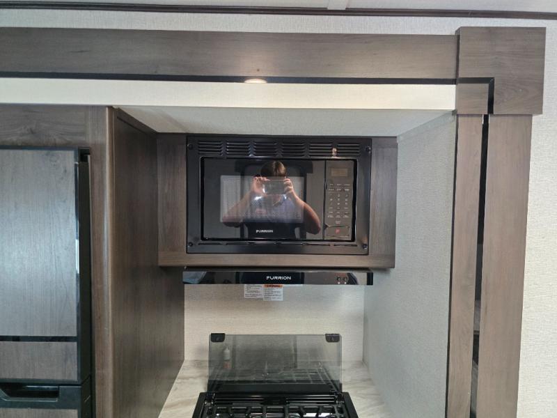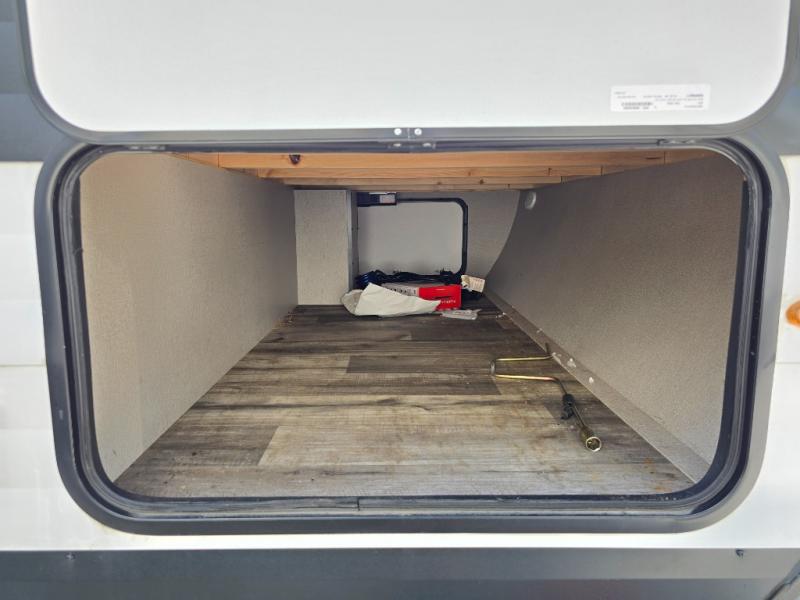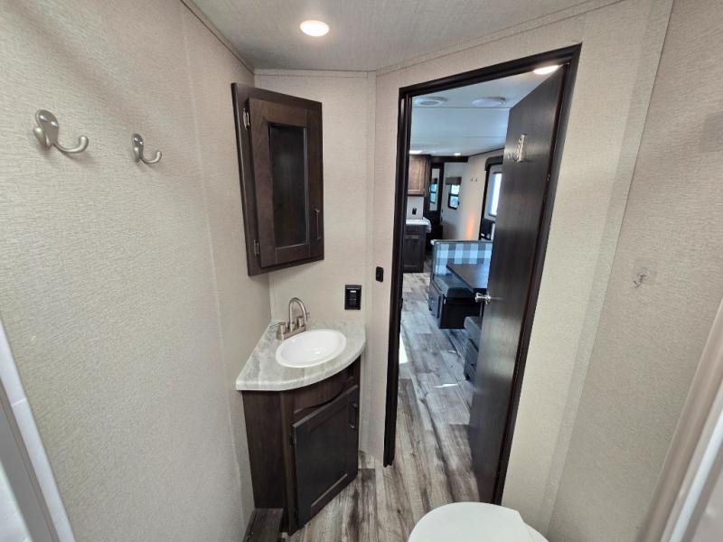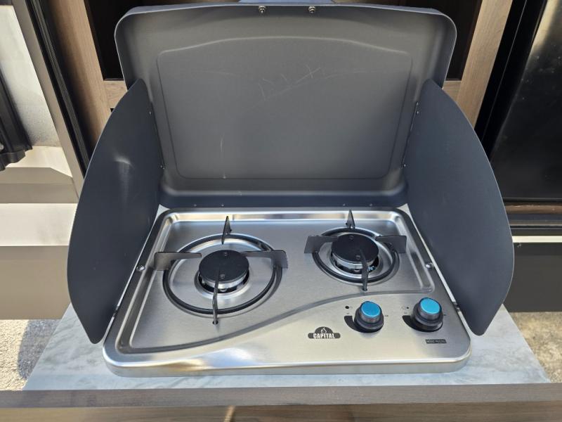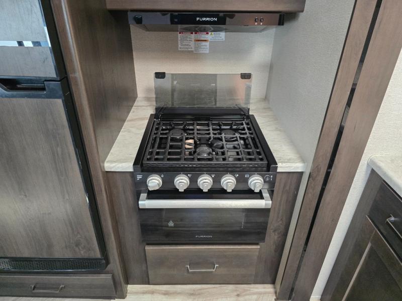 Camping with friends or family is easier than ever in this spacious travel trailer. You can easily sleep nine with the double-size bunks, the tri-fold sofa, and the queen bed in the front private bedroom. The booth dinette can even be used to sleep a guest or two little ones. Prepare your meals on the three-burner cooktop indoors or on the two-burner cooktop at the outside kitchen! You'll also find an exterior spray port, a drawer to store utensils, and a 1.6-cu. ft. outdoor refrigerator for drinks! It will be so easy to fill the dog's food bowl with the added pet drawer under the refrigerator, and the full bath in this model means you don't have to use the camp's facilities.