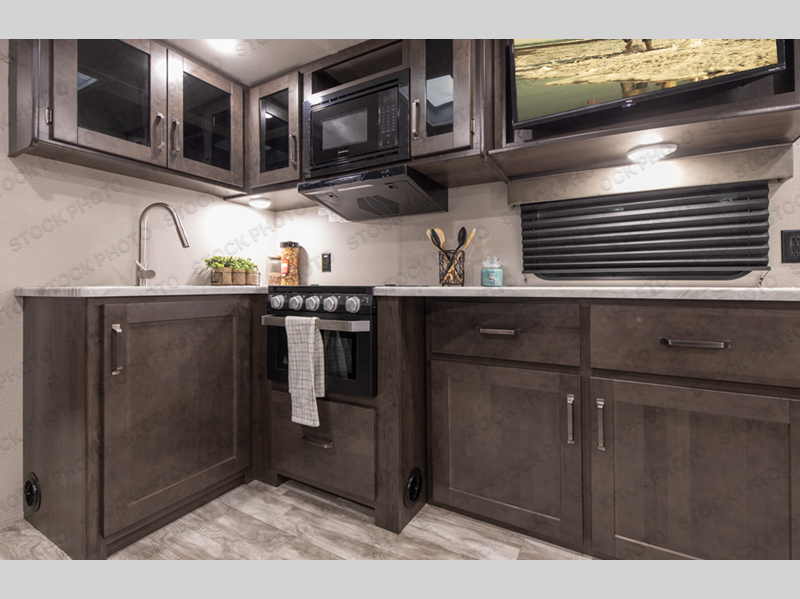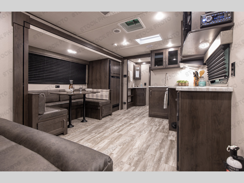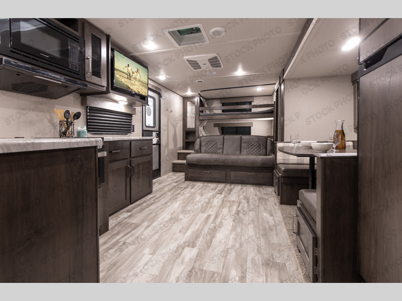 Are you ready to camp in comfort with your family or friends? This travel trailer allows you to do just that! There are double-size bunks in the back with two steps that have storage for books or board games. There is also a closet here to keep clothes wrinkle-free. The U-shaped dinette within the slide out can be switched out for the optional theatre seats, and the jackknife sofa will be the perfect spot to visit with your crew. This model features a walk-through bath that leads to the front master bedroom. You'll love the queen bed here, overhead storage, and your own exterior entry door for convenience.