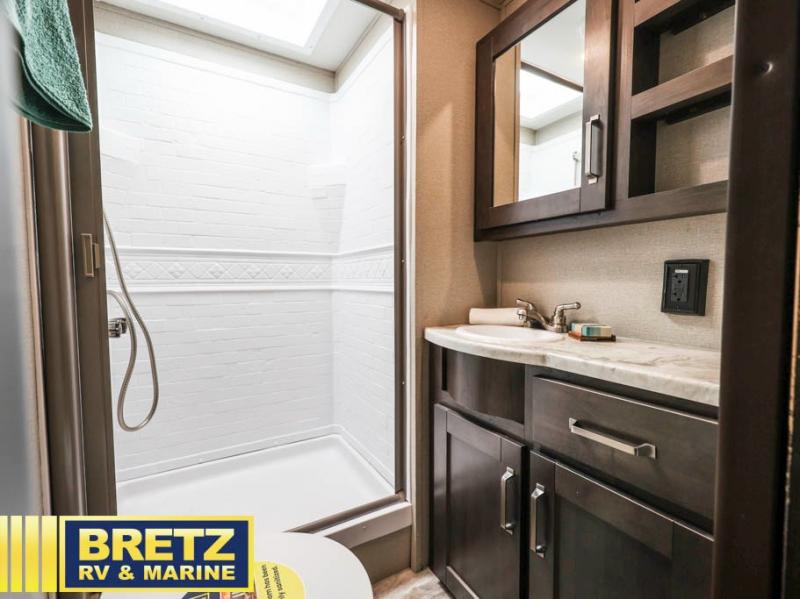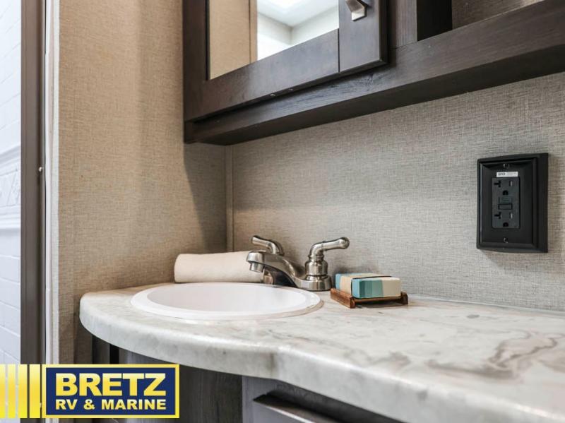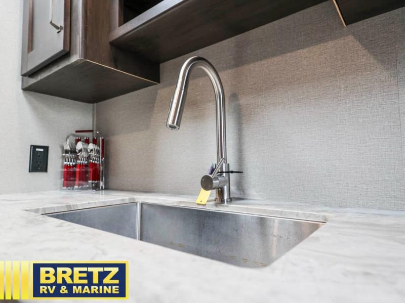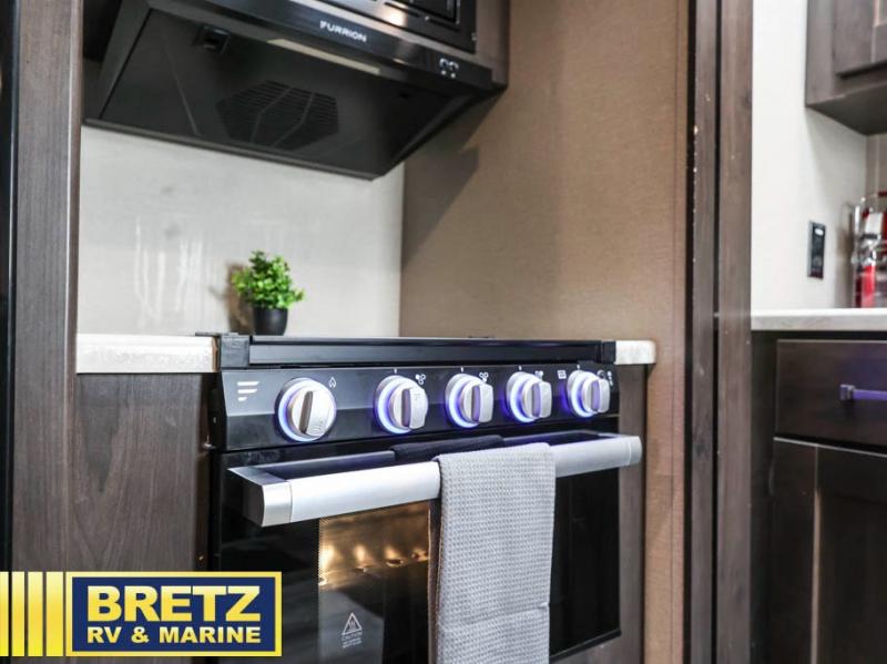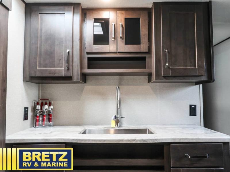 A rear private bunkhouse plus a front private bedroom make this the perfect family-friendly trailer. There are two bunks, a residential full bed, plus three dressers to store clothes in the bunkhouse. The 42" x 22" rear storage will be great for hiking gear or extra lawn chairs, and you'll find tons of interior storage throughout for all your belongings. Head to the main living area to relax on the tri-fold sofa or booth dinette, or you may just want to visit with the cook outside as they use the outdoor kitchen! There is an LP quick connect, an exterior spray port, a two-burner cooktop, plus a 1.6-cu. ft. exterior refrigerator. Now that's a convenient outdoor kitchen!
