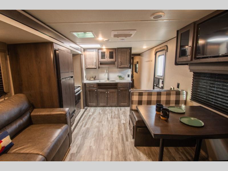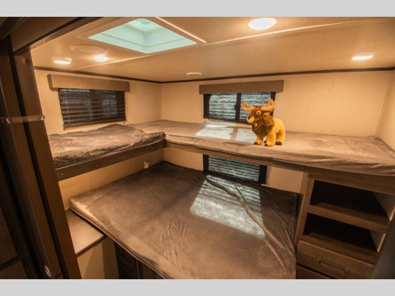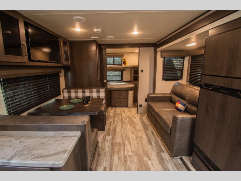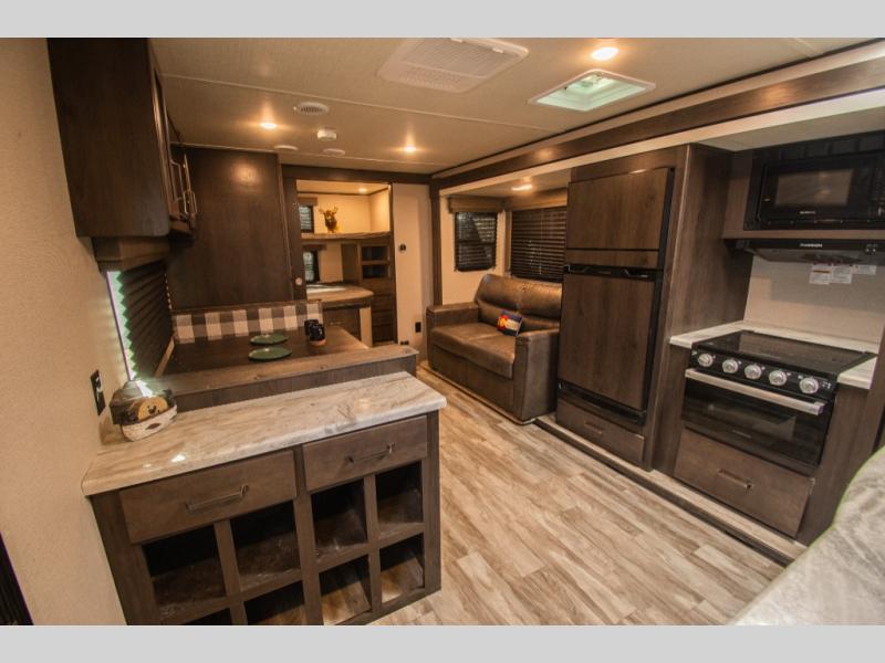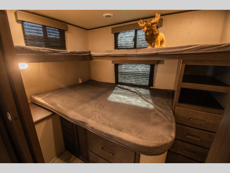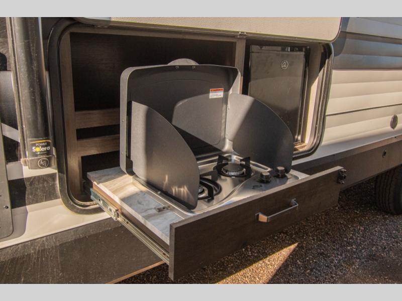 A rear private bunkhouse plus a front private bedroom make this the perfect family-friendly trailer. There are two bunks, a residential full bed, plus three dressers to store clothes in the bunkhouse. The 42" x 22" rear storage will be great for hiking gear or extra lawn chairs, and you'll find tons of interior storage throughout for all your belongings. Head to the main living area to relax on the tri-fold sofa or booth dinette, or you may just want to visit with the cook outside as they use the outdoor kitchen! There is an LP quick connect, an exterior spray port, a two-burner cooktop, plus a 1.6-cu. ft. exterior refrigerator. Now that's a convenient outdoor kitchen!