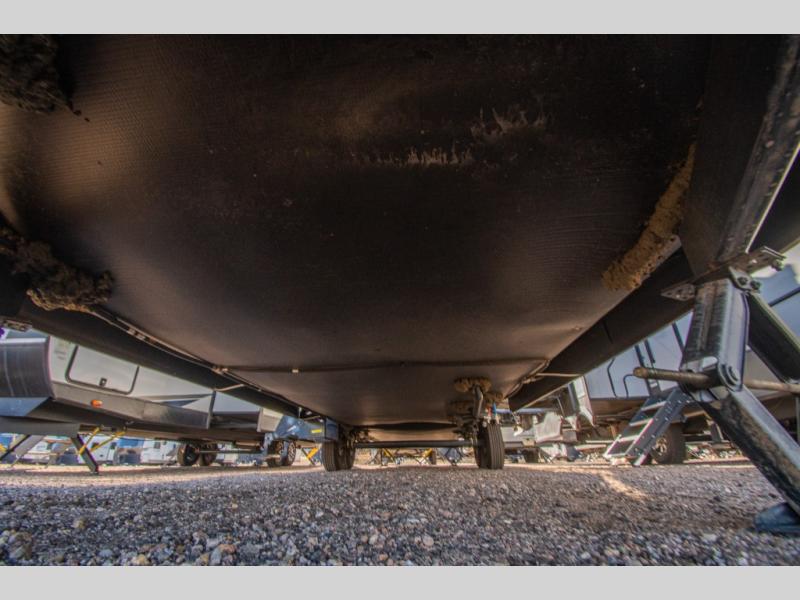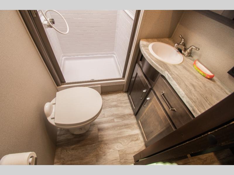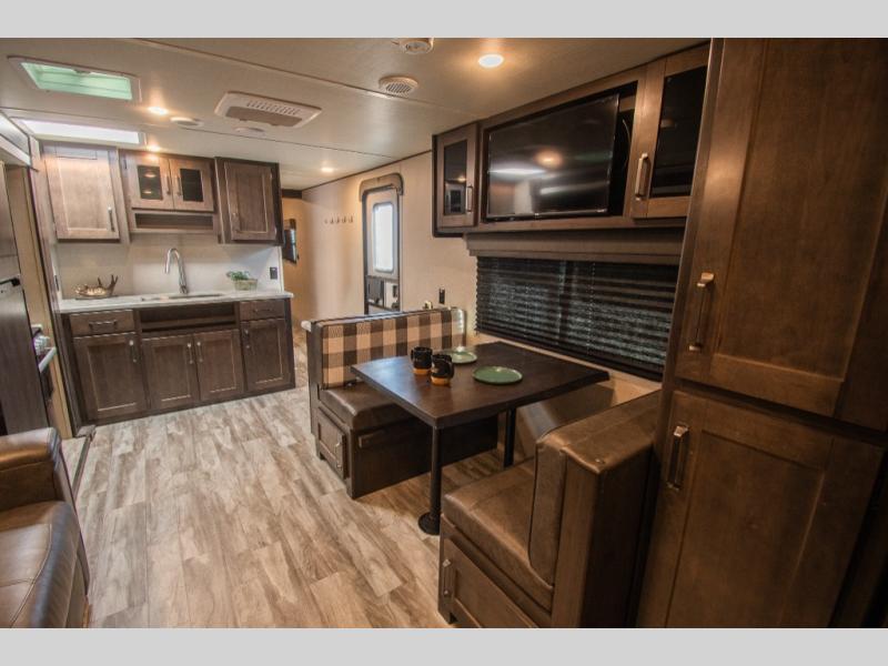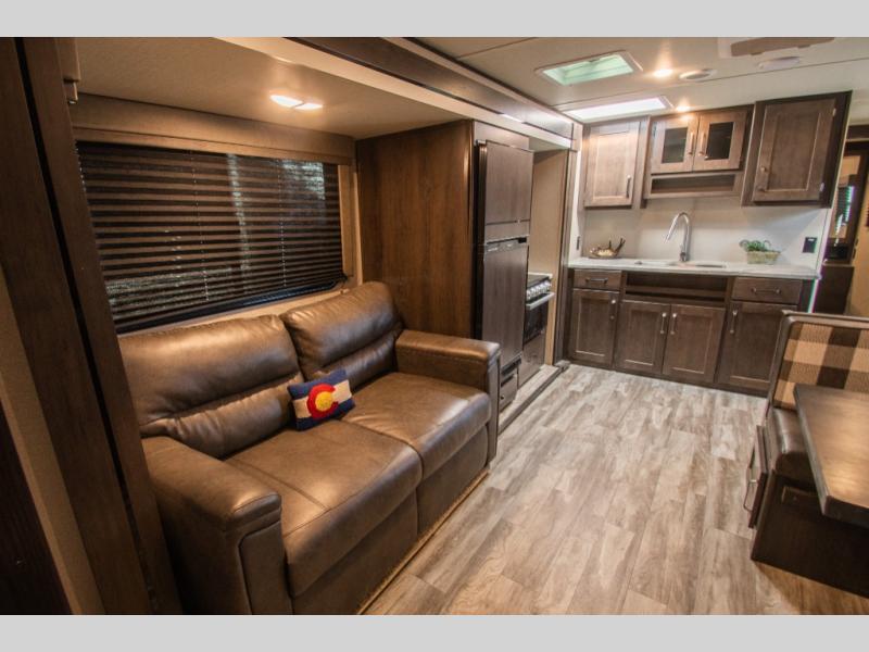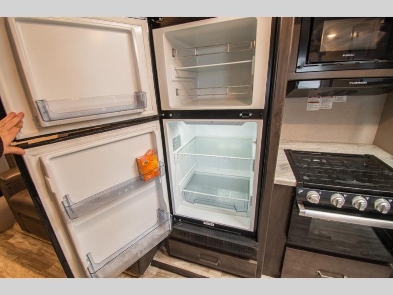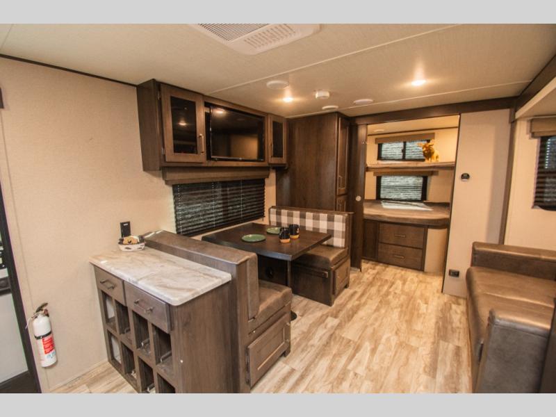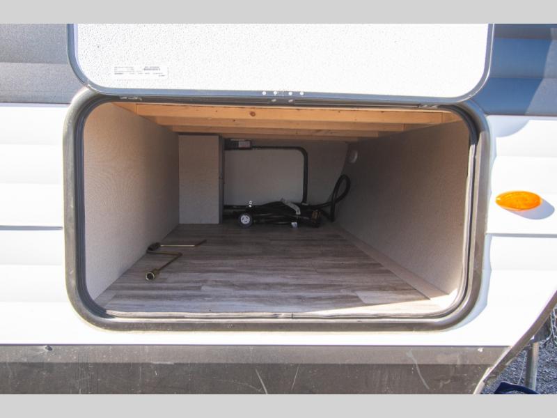 A rear private bunkhouse plus a front private bedroom make this the perfect family-friendly trailer. There are two bunks, a residential full bed, plus three dressers to store clothes in the bunkhouse. The 42" x 22" rear storage will be great for hiking gear or extra lawn chairs, and you'll find tons of interior storage throughout for all your belongings. Head to the main living area to relax on the tri-fold sofa or booth dinette, or you may just want to visit with the cook outside as they use the outdoor kitchen! There is an LP quick connect, an exterior spray port, a two-burner cooktop, plus a 1.6-cu. ft. exterior refrigerator. Now that's a convenient outdoor kitchen!