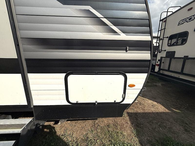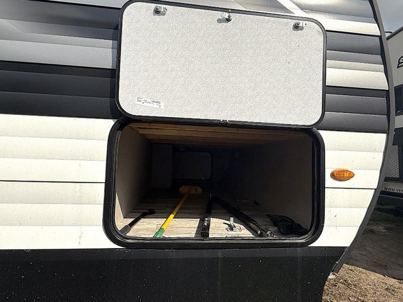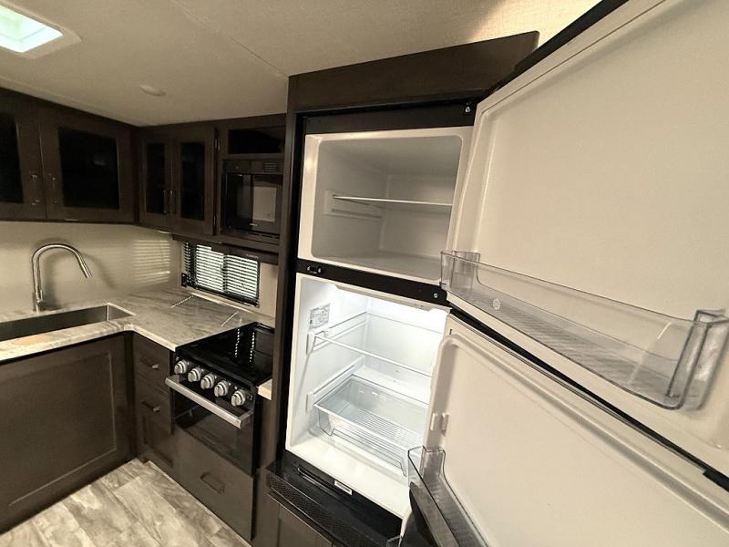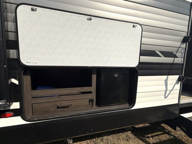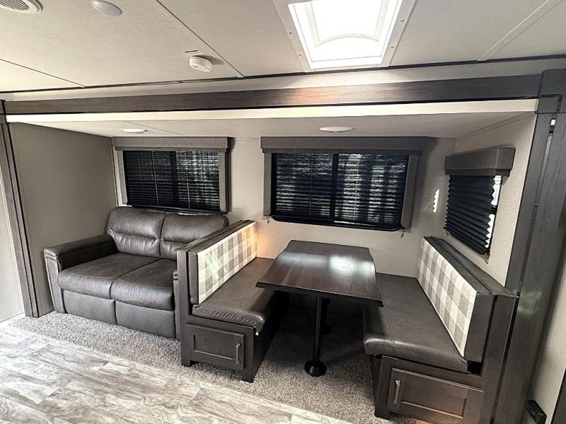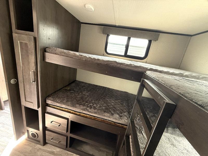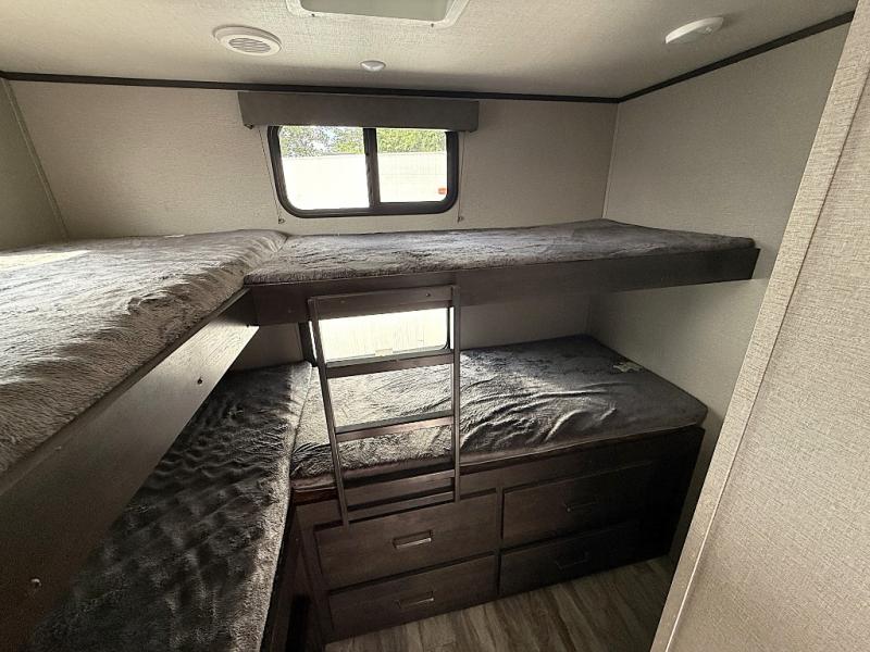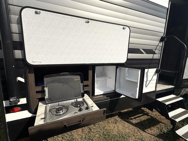 Head to the lake for unforgettable camping trips in this dual-entry travel trailer. The private bunkhouse suite includes four bunks, two drawers to store belongings, plus a half bath for convenience. Everyone will love to gather in the main living area that includes a tri-fold sofa or optional theatre seating, a booth dinette, plus a 32" LED HDTV on a swing arm for a perfect view. You'll find plenty of storage space, including a wardrobe/pantry, a broom closet, plus plenty of overhead compartments for your valuables. This model also includes a full indoor kitchen, as well as an outdoor kitchen with a two-burner cooktop, an exterior spray port, plus a 1.6-cu. ft. refrigerator for cold drinks.