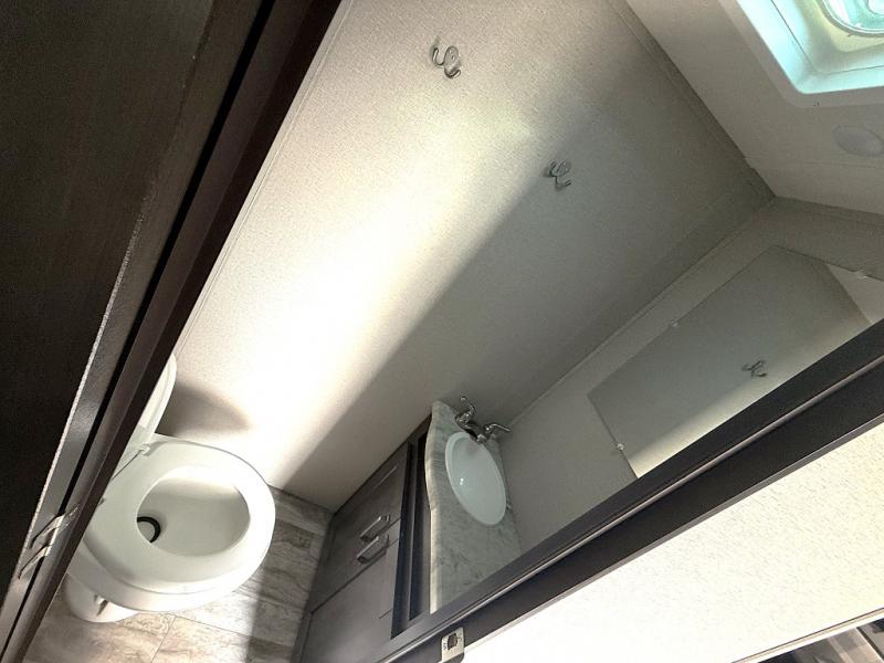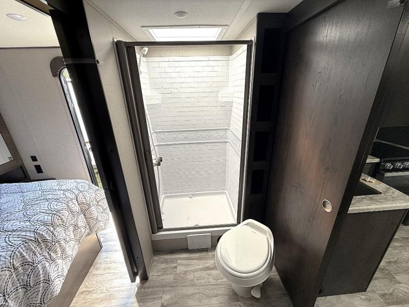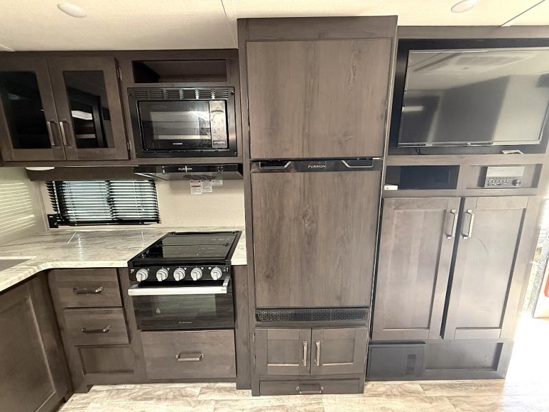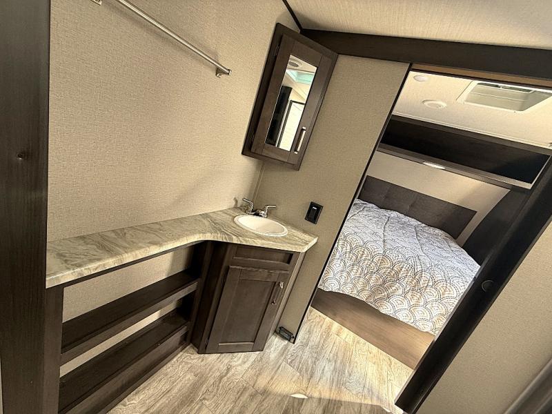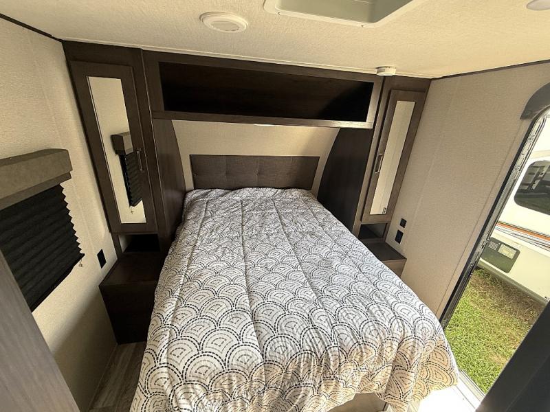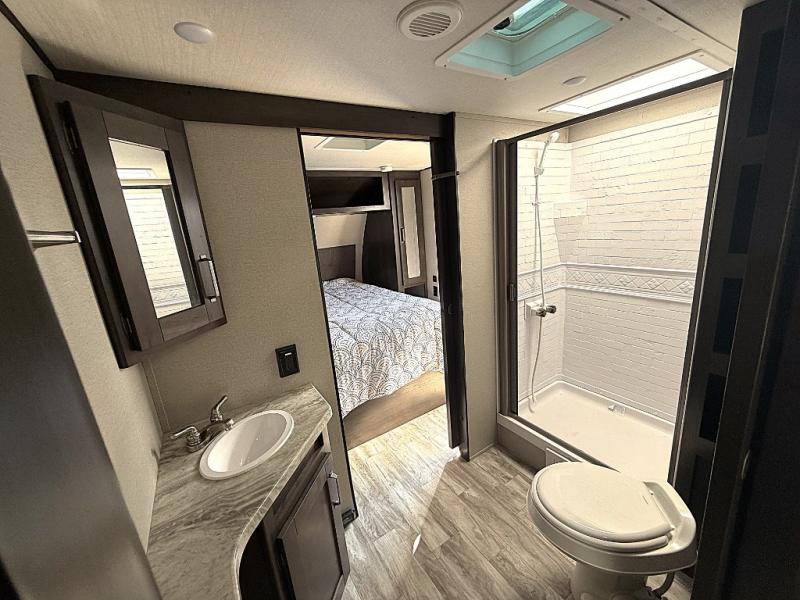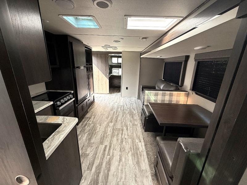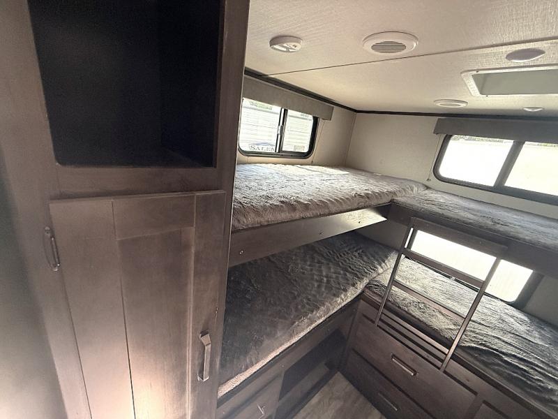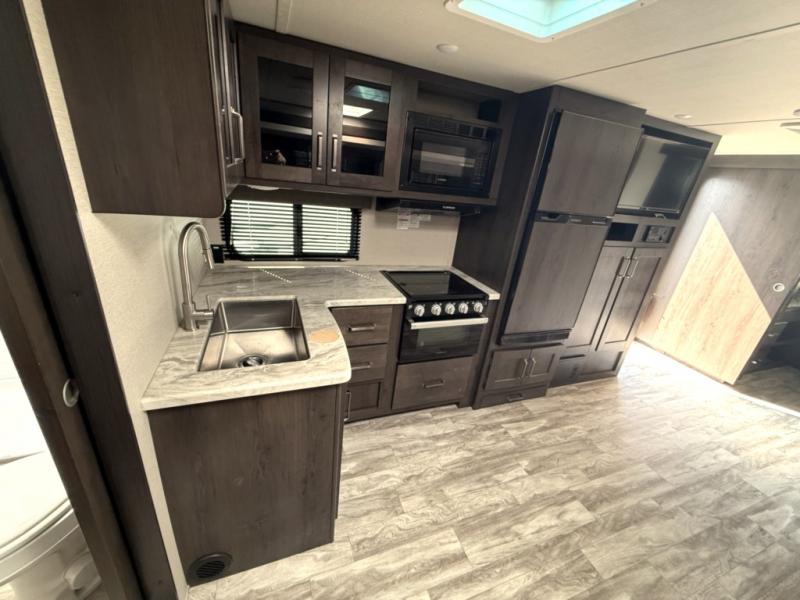 Head to the lake for unforgettable camping trips in this dual-entry travel trailer. The private bunkhouse suite includes four bunks, two drawers to store belongings, plus a half bath for convenience. Everyone will love to gather in the main living area that includes a tri-fold sofa or optional theatre seating, a booth dinette, plus a 32" LED HDTV on a swing arm for a perfect view. You'll find plenty of storage space, including a wardrobe/pantry, a broom closet, plus plenty of overhead compartments for your valuables. This model also includes a full indoor kitchen, as well as an outdoor kitchen with a two-burner cooktop, an exterior spray port, plus a 1.6-cu. ft. refrigerator for cold drinks.