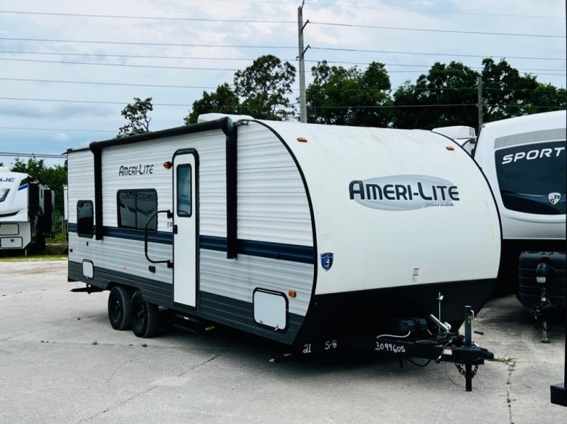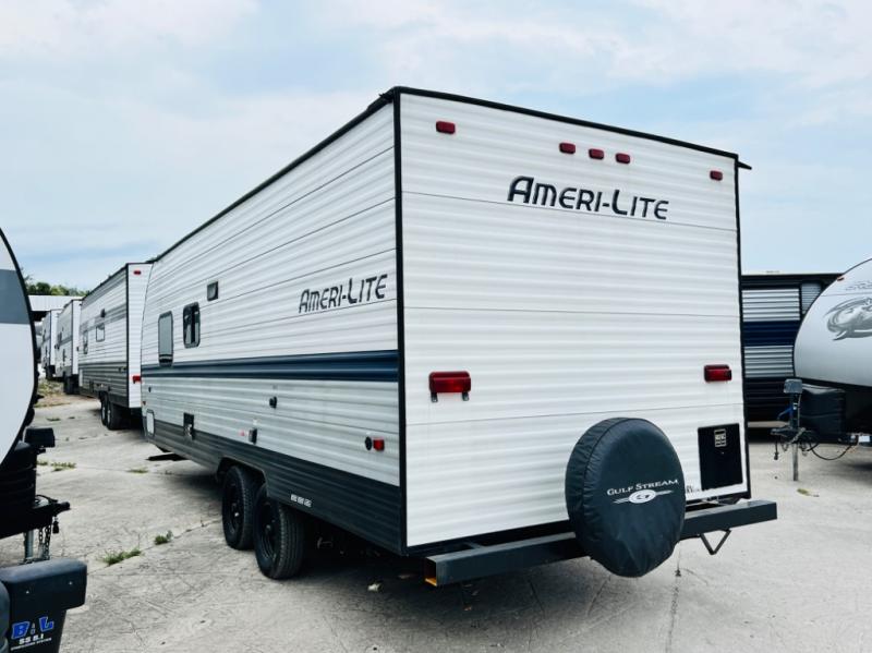 The Ameri-Lite Ultra Lite travel trailers by Gulf Stream are the perfect RV for families wanting to start their camping lifestyle, but not break the bank. These lightweight units include quality construction, such as a tubular steel cambered frame, strong wood roof decking, and full-width steel outriggers for maximum support. The front power hitch jack and four stabilizer jacks will make set-up hassle-free once you arrive at the campground, and you can put out the electric awning to rest in the shade when you're done. Each model includes convenient amenities, like the 13,500 BTU A/C, the 6 gallon DSI water heater, a central control panel, and multiple USB ports for your tablet, phone, and camera! The inside is designed to make you feel at home with radiant LED lighting, designer kitchen backsplash, pleated privacy shades, craft-made cabinetry, plus many more features. Start your RV lifestyle with an affordable, lightweight Ameri-Lite Ultra Lite travel trailer today!
