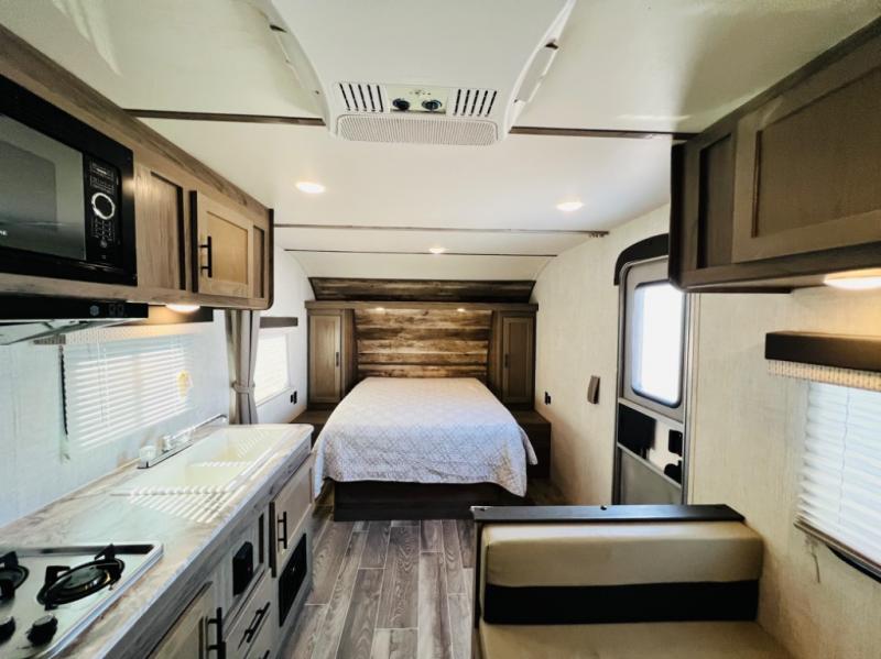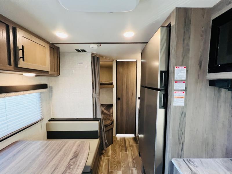 Invite more along with double-size bunks in this travel trailer! The private shower and toilet is close to the bunks if you're camping with little ones, and there is a sink just outside the door so two people can freshen up at once. You and your spouse will get comfortable on the front queen bed, or you can choose the optional Murphy bed to enjoy more seating space during the day. This model includes a booth dinette to dine at each day, or you can sit outside under the electric awning!