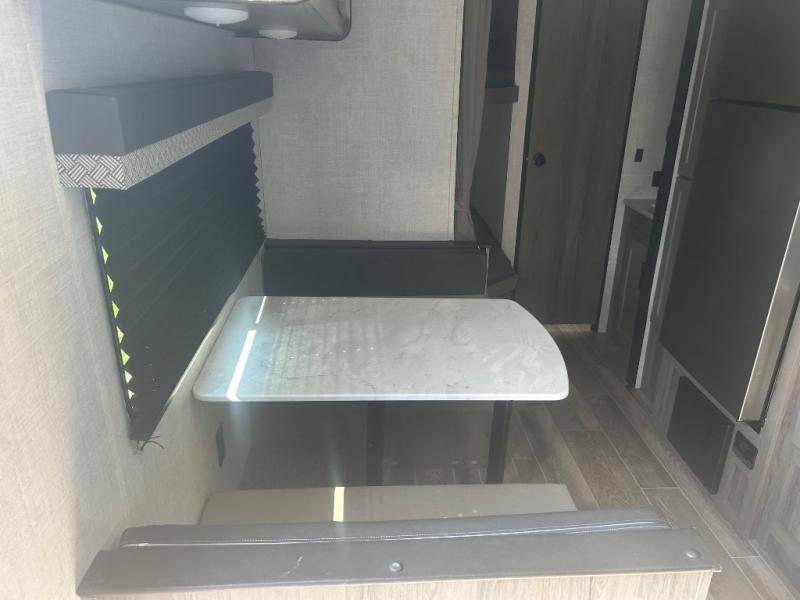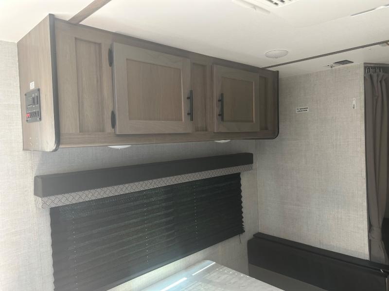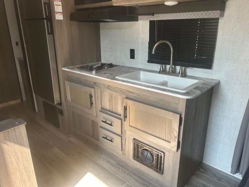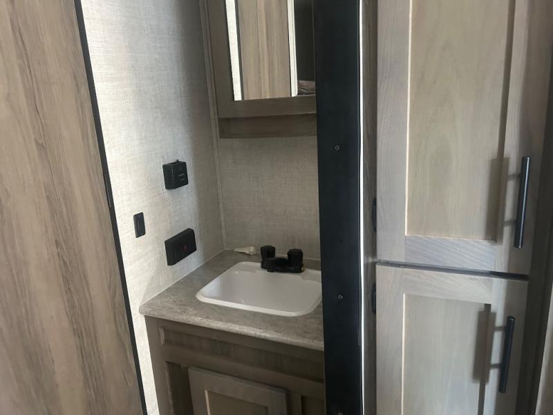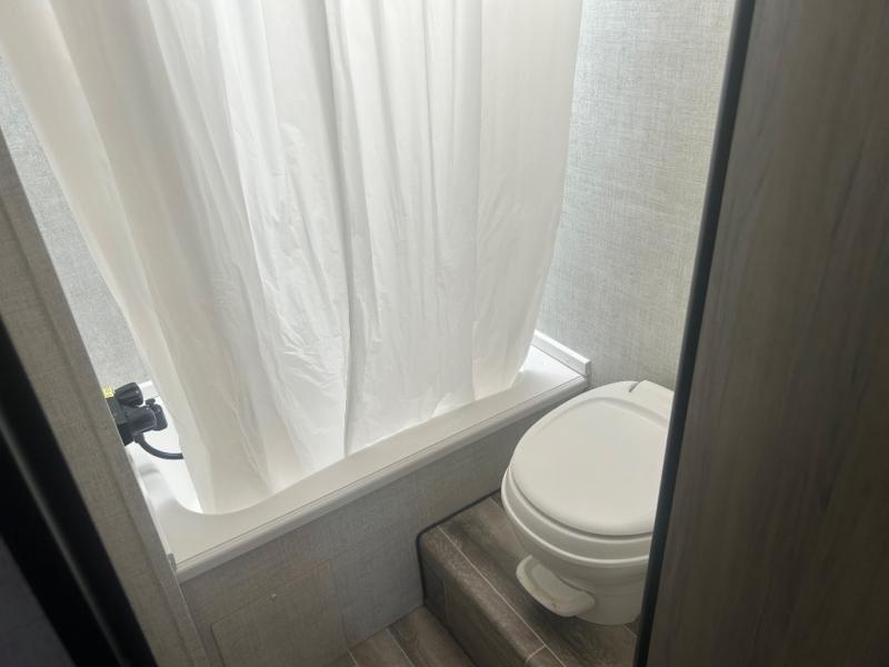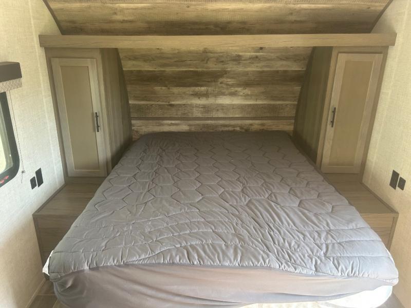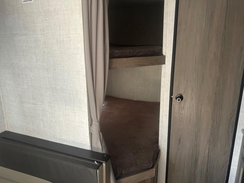 Invite more along with double-size bunks in this travel trailer! The private shower and toilet is close to the bunks if you're camping with little ones, and there is a sink just outside the door so two people can freshen up at once. You and your spouse will get comfortable on the front queen bed, or you can choose the optional Murphy bed to enjoy more seating space during the day. This model includes a booth dinette to dine at each day, or you can sit outside under the electric awning!