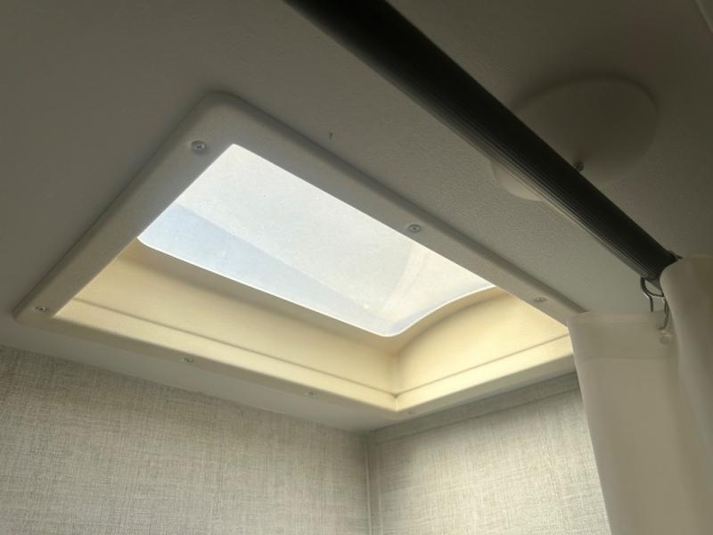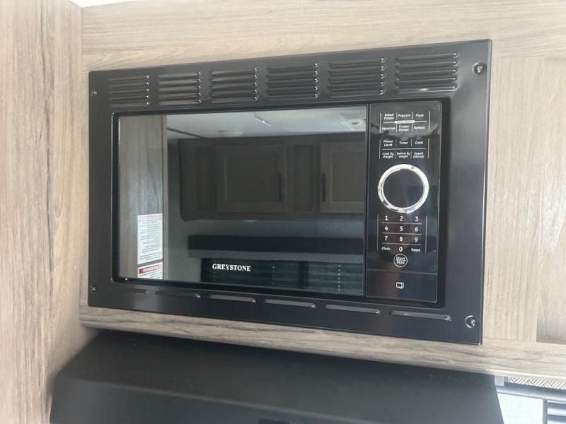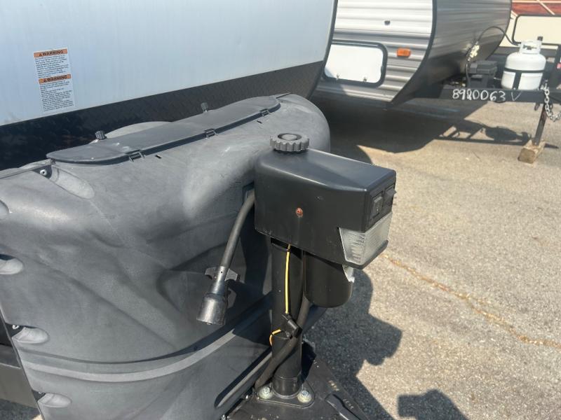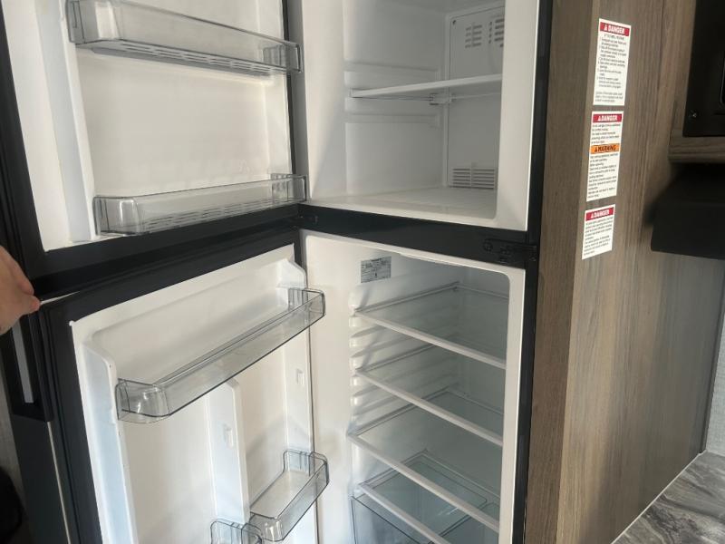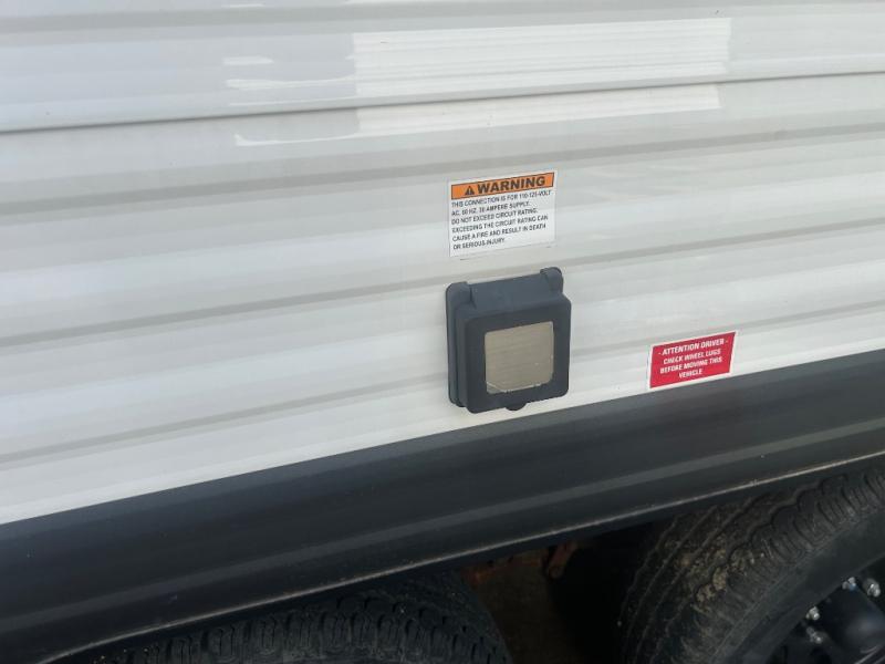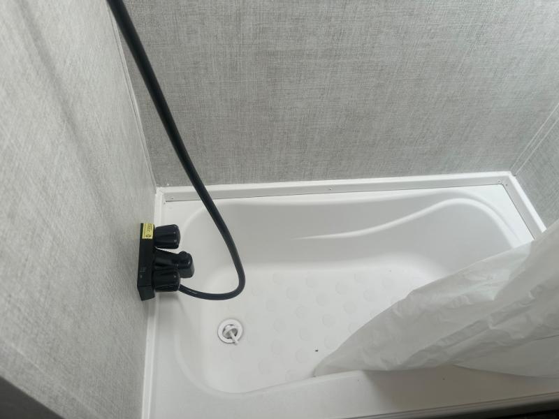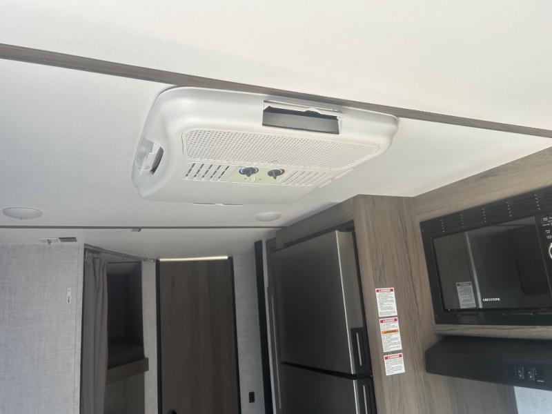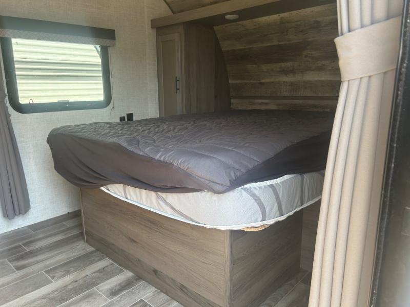 Invite more along with double-size bunks in this travel trailer! The private shower and toilet is close to the bunks if you're camping with little ones, and there is a sink just outside the door so two people can freshen up at once. You and your spouse will get comfortable on the front queen bed, or you can choose the optional Murphy bed to enjoy more seating space during the day. This model includes a booth dinette to dine at each day, or you can sit outside under the electric awning!