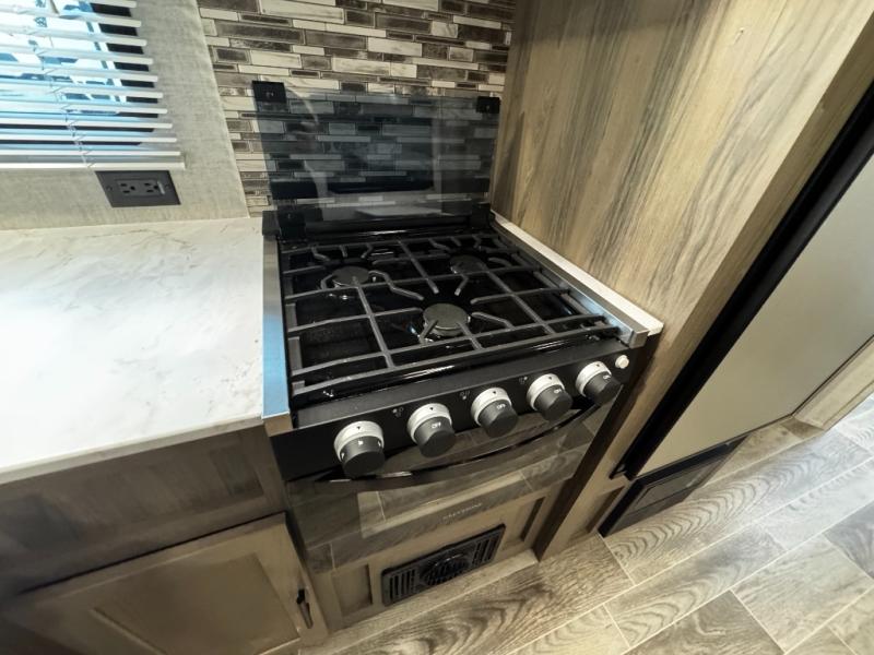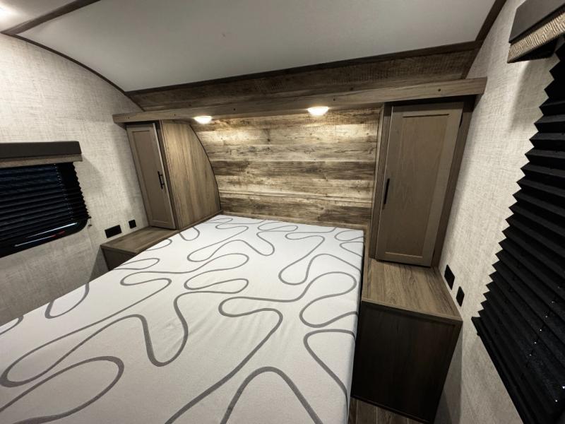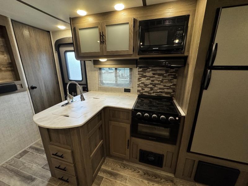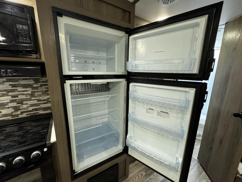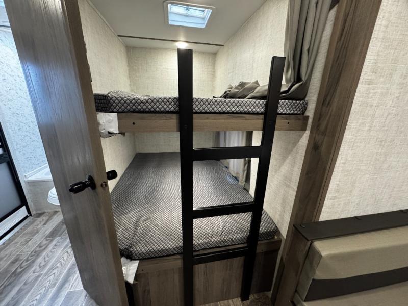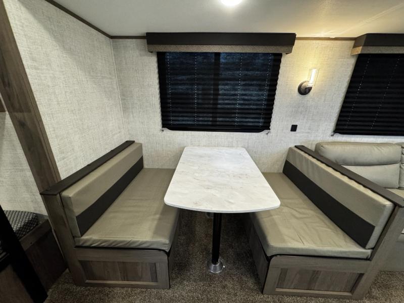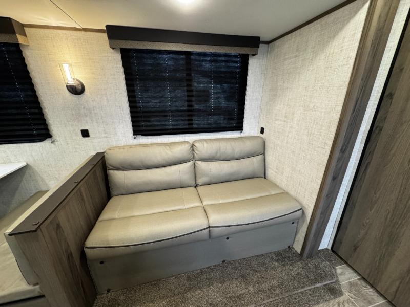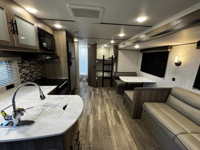 A trip to the lake or your favorite state park just got better in this comfortable travel trailer. Whether you're relaxing on the sofa or booth dinette, cooking in the spacious kitchen, or sitting outside under the electric awning with LED lights, you will enjoy every minute you camp. You and your spouse will have a private bedroom up front with a queen bed and dual wardrobes, and there are double-size bunks for the kids or your friends!