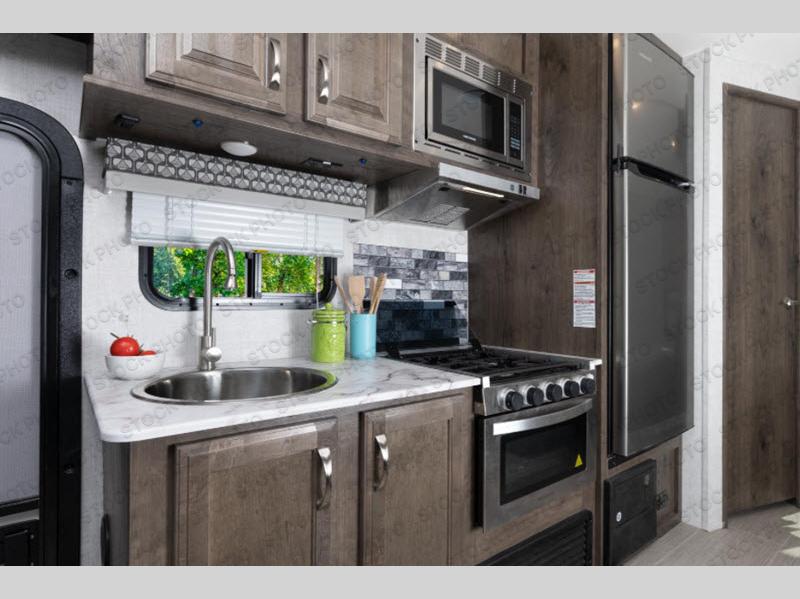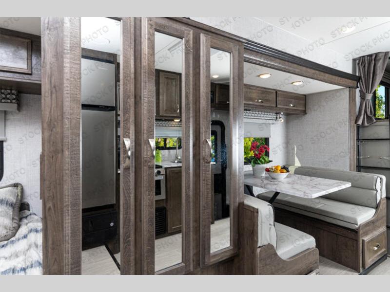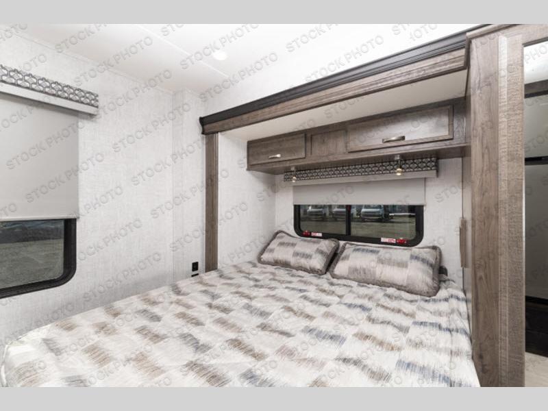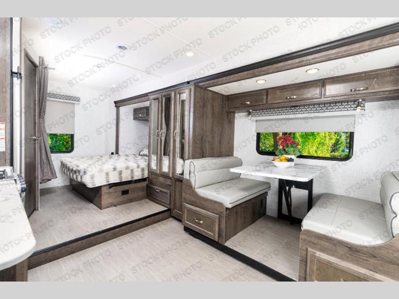 Imagine lots of floor space once the full-wall slide is set up in this Conquest Class C gas motorhome. You can easily walk from the front cab area with an overhead bunk to the rear corner bathroom or RV queen bed. The cook will love the kitchen amenities, like a pantry to store plenty of food, a three-burner range to cook your meals, and a double-door refrigerator to store any leftovers. You can probably imagine dining inside on those rainy days at the booth dinette and staying outside under the electric awning in your camp chairs the rest of the time.