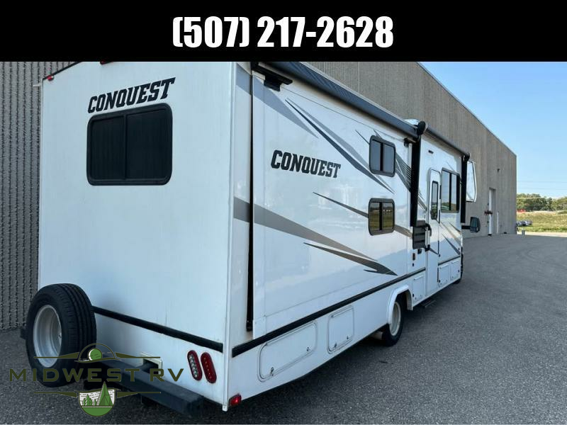 Looking for space for everyone and everything on your next road trip? With this Conquest Class C gas motorhome, you will find exterior and interior storage throughout including a bedroom wardrobe, overhead cabinets, and exterior basement storage. You will find sleeping space on the RV queen bed in the private bedroom, the set of bunk beds across from the bathroom, and the bunk over the cab. Additional sleeping space can be created when you maneuver the jackknife sofa and booth dinette into place. If you enjoy cooking, the kitchen has what you need with its flip-up countertop for more prep space and its three-burner range for sautéing your stir fry.