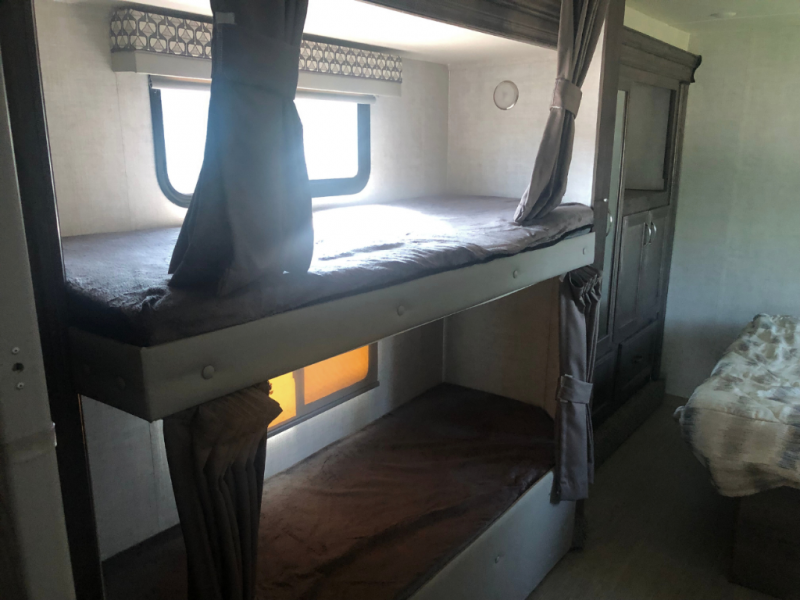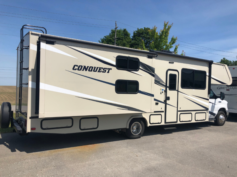 Looking for space for everyone and everything on your next road trip? With this Conquest Class C gas motorhome, you will find exterior and interior storage throughout including a bedroom wardrobe, overhead cabinets, and exterior basement storage. You will find sleeping space on the RV queen bed in the private bedroom, the set of bunk beds across from the bathroom, and the bunk over the cab. Additional sleeping space can be created when you maneuver the jackknife sofa and booth dinette into place. If you enjoy cooking, the kitchen has what you need with its flip-up countertop for more prep space and its three-burner range for sautéing your stir fry.