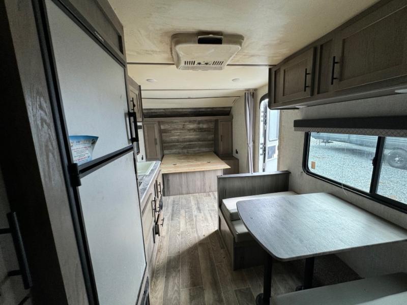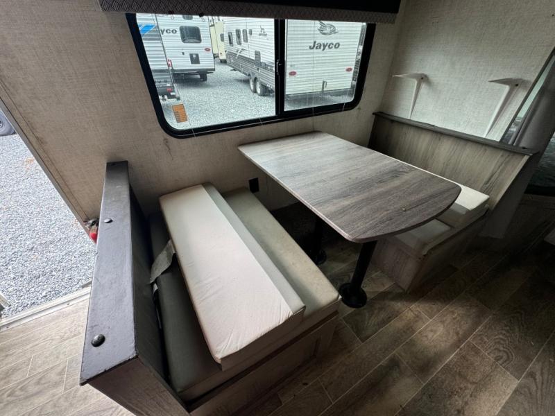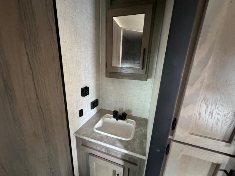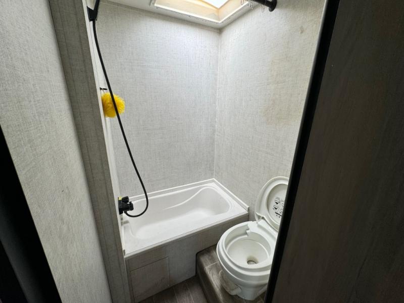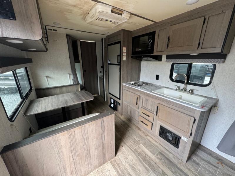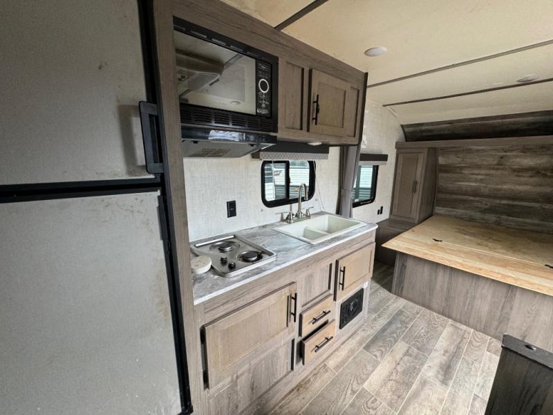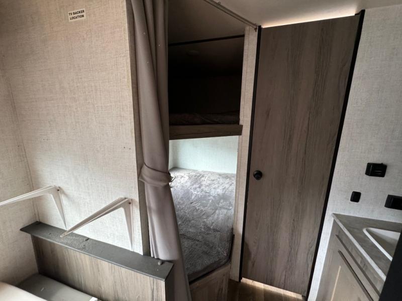 Make your reservations, start planning your menu, and load up your clothes, games, food and such for a fun weekend camping in this trailer! You will have a front private bedroom with a queen-size bed, closets and a TV shelf, while your family and friends can choose from the double-size bunks and furniture to sleep on. There is a convertible sofa and a booth dinette, plus a galley kitchen with a microwave oven, sink, plus overhead storage for pots, pans and dry goods. The rear corner full bathroom offers a tub/shower, toilet and a sink to be able to get cleaned up in after hiking or relaxing by a fire. And there are options to add such as a 6 cu. ft. double door refrigerator, a three-burner range with Super-burner and oven, radial tires, and/or a diamond plate lower front, plus more.