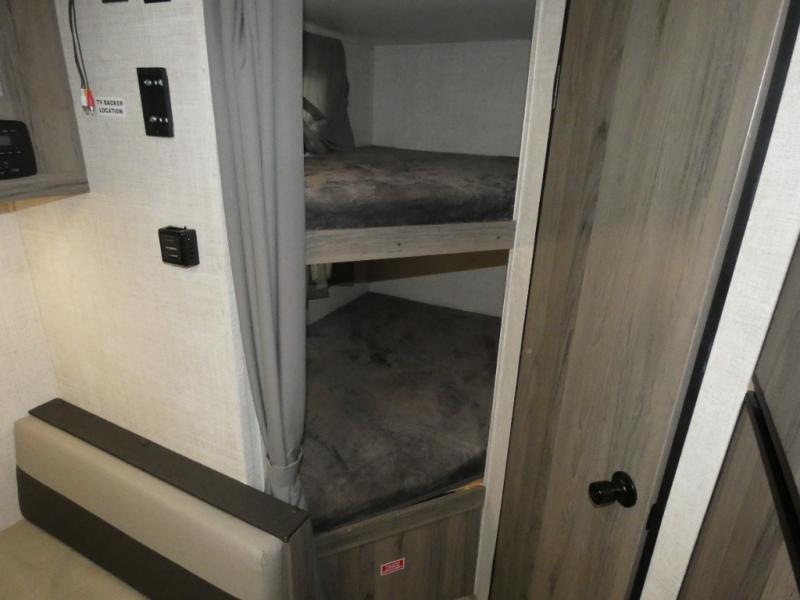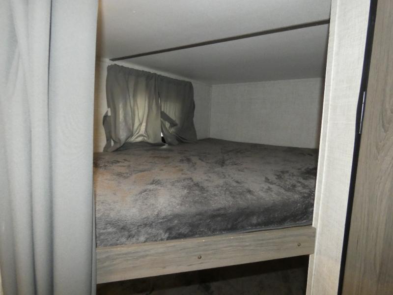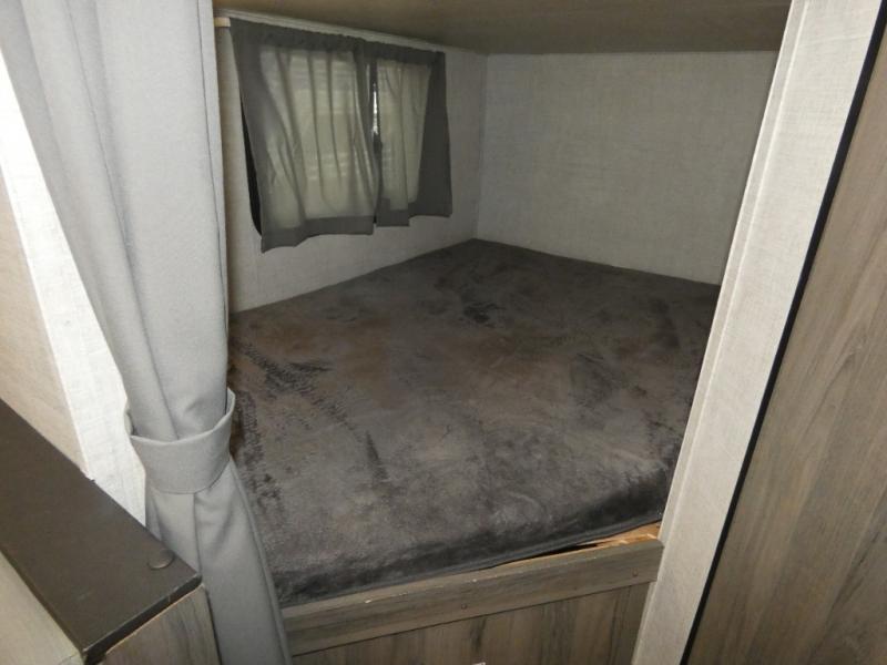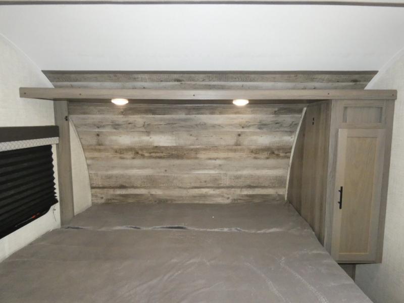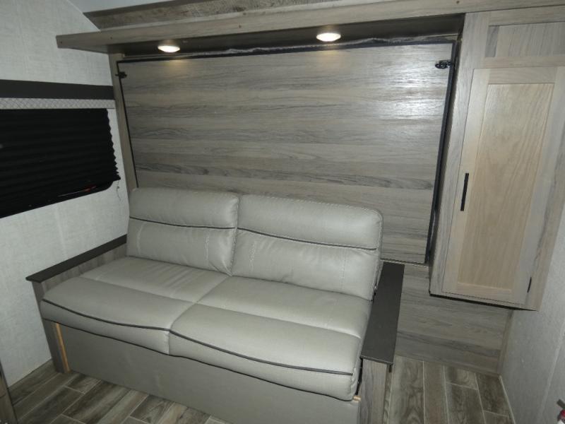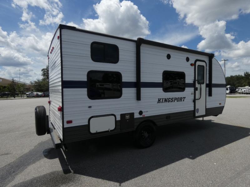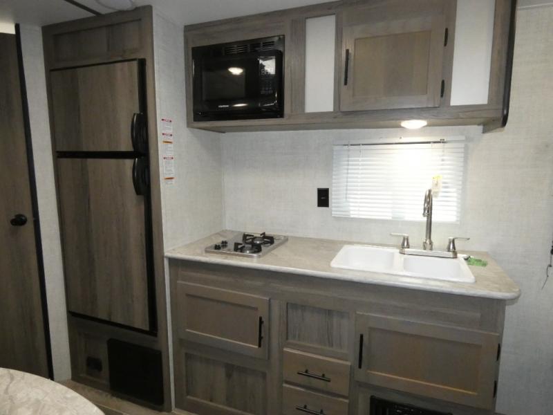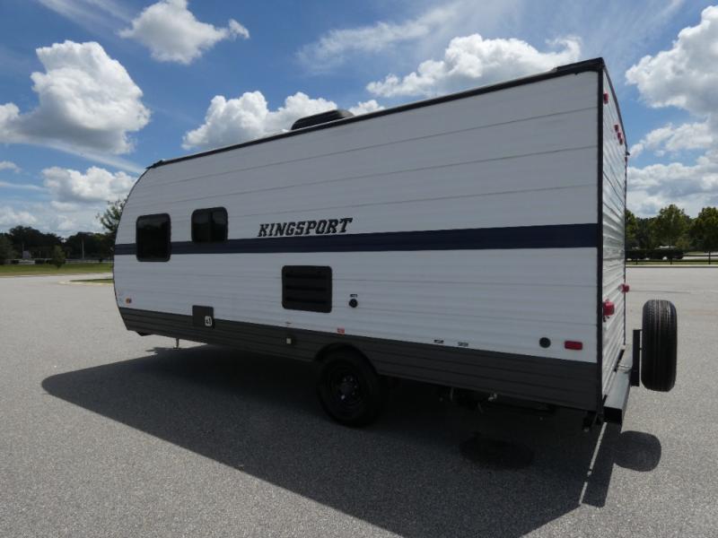 You will undoubtedly want to take another adventure after you take your first trip in this Kingsport Super Lite travel trailer! There is a flexible seating/sleeping area up front with the Murphy bed and sofa, and since there is a wardrobe located right next to the bed, you can keep your personal belongings stored away. You'll want to store any large gear outside in the exterior pass-through storage compartment, but back inside, you can keep other camping items all throughout in the overhead cabinets. The full bathroom is going to be a dream to have when you choose to camp away from any campsite facilities, and you can even bring along fresh produce in the double-door refrigerator.