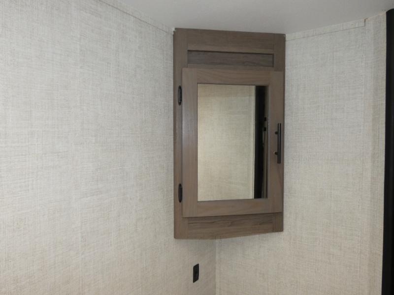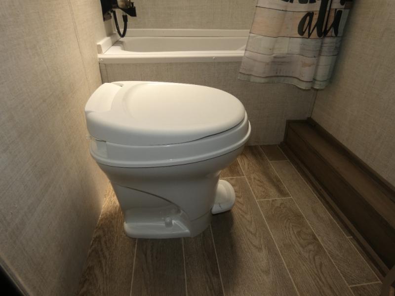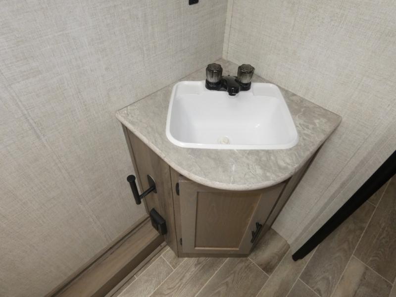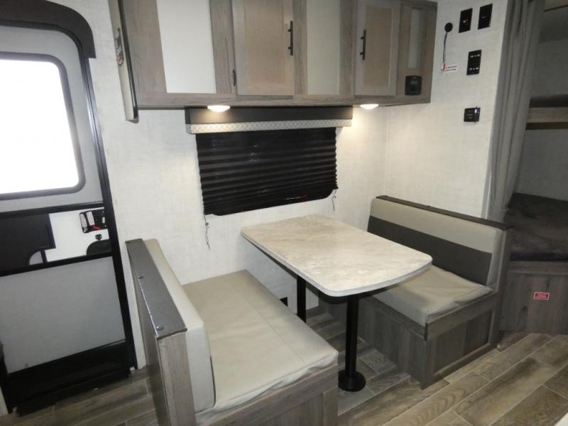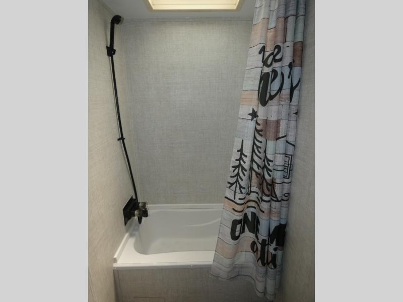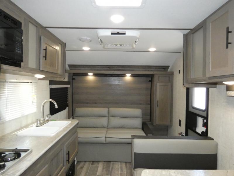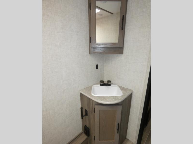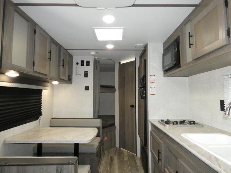 You will undoubtedly want to take another adventure after you take your first trip in this Kingsport Super Lite travel trailer! There is a flexible seating/sleeping area up front with the Murphy bed and sofa, and since there is a wardrobe located right next to the bed, you can keep your personal belongings stored away. You'll want to store any large gear outside in the exterior pass-through storage compartment, but back inside, you can keep other camping items all throughout in the overhead cabinets. The full bathroom is going to be a dream to have when you choose to camp away from any campsite facilities, and you can even bring along fresh produce in the double-door refrigerator.
