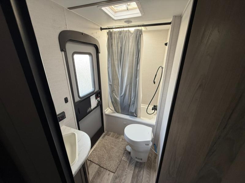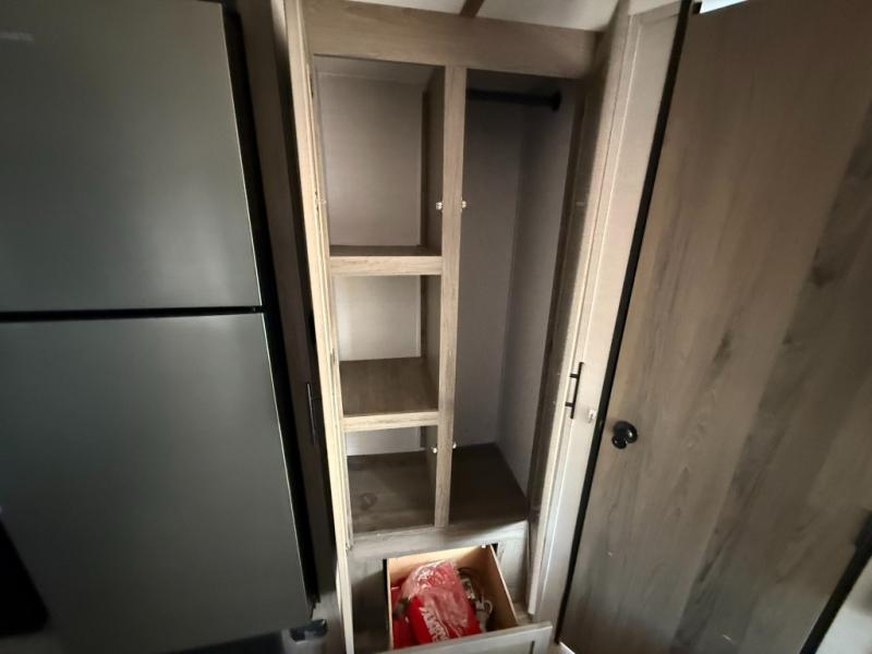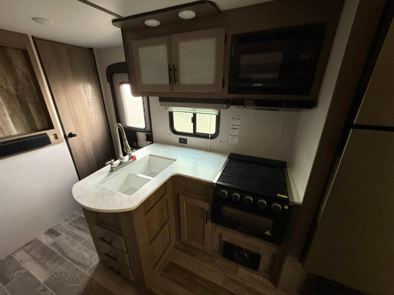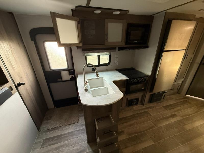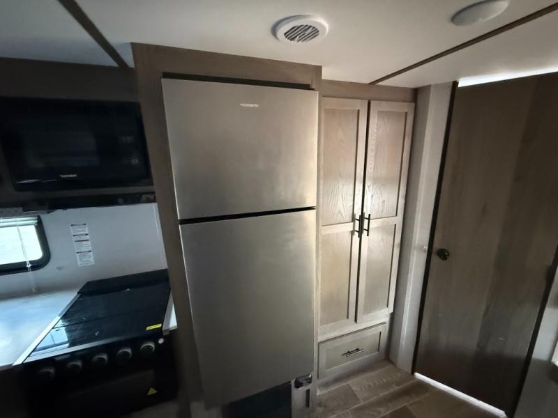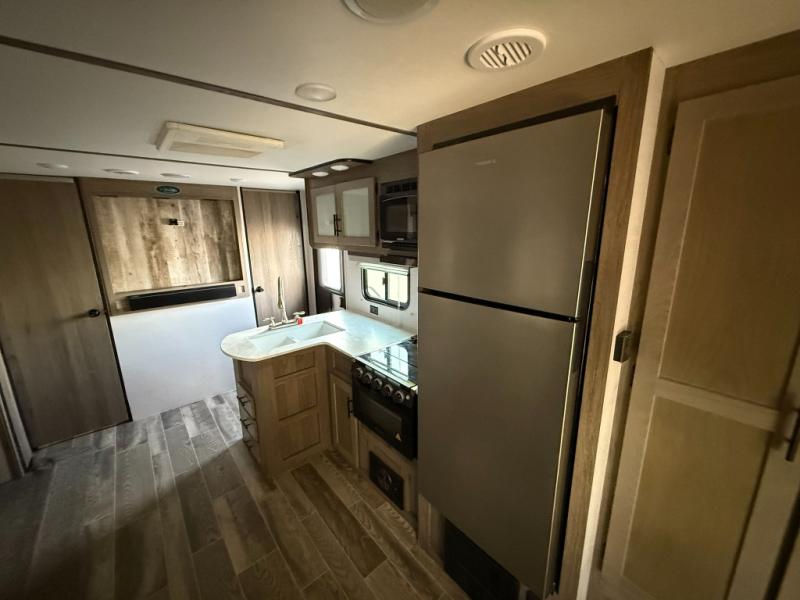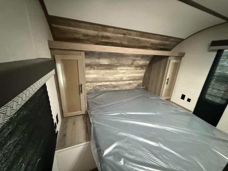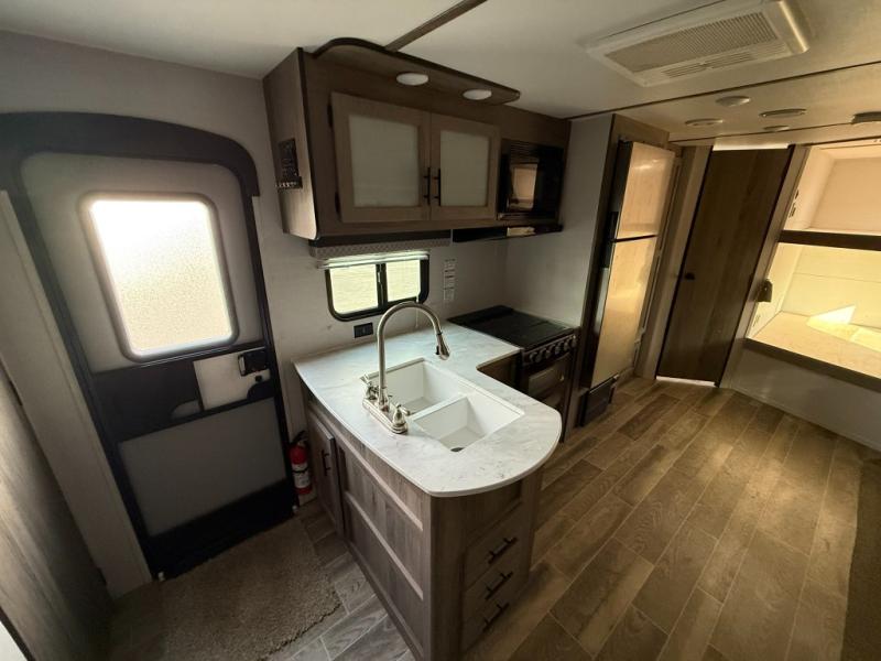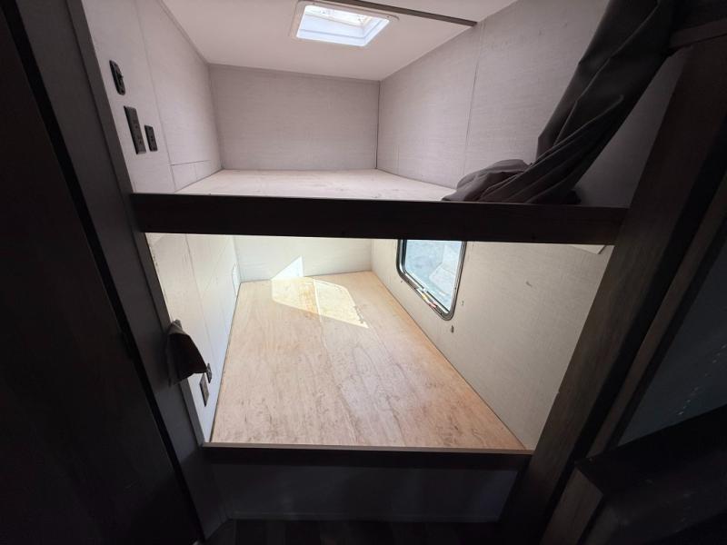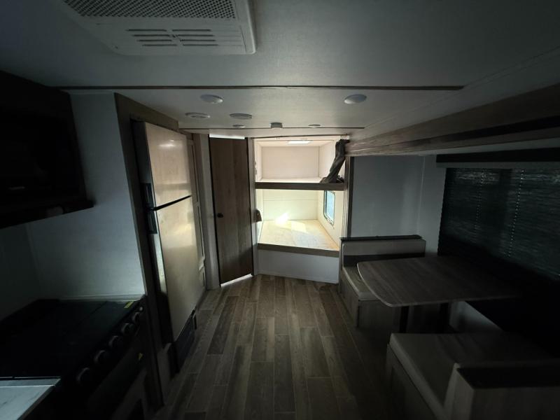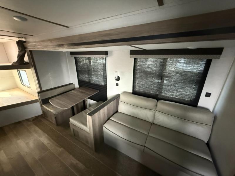 Get ready for comfort and fun at the campgrounds with this trailer thanks to all the amenities and space provided! Beginning with dual entry doors allowing you to easily access the main living and kitchen area and/or the full bathroom for quick entry and exit when having fun outside. Your guests or kids will love the double-size bunk beds to call their own while you have privacy in the front bedroom. The queen-size bed, the two wardrobes and the overhead shelf will provide you a comfortable place to sleep and plenty of space for your belongings. If you decide to invite more friends, they can sleep on the booth dinette and the sofa within the large slide out which gives this area more interior space for all. And the cook will love the L-shaped counter, the appliances, and the storage.