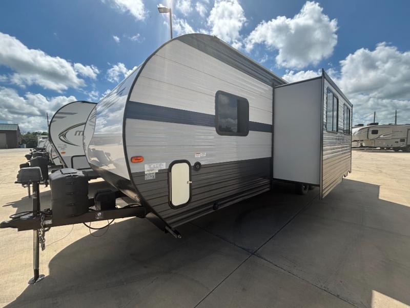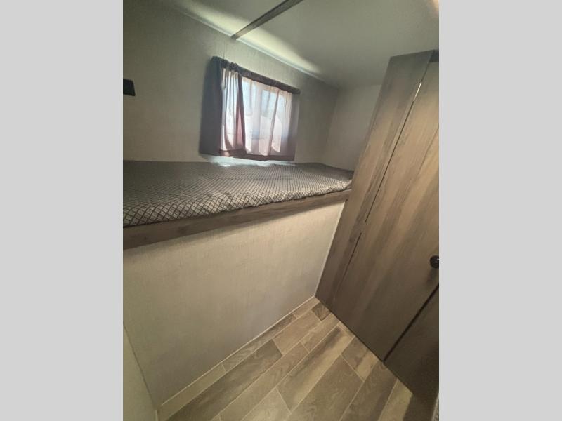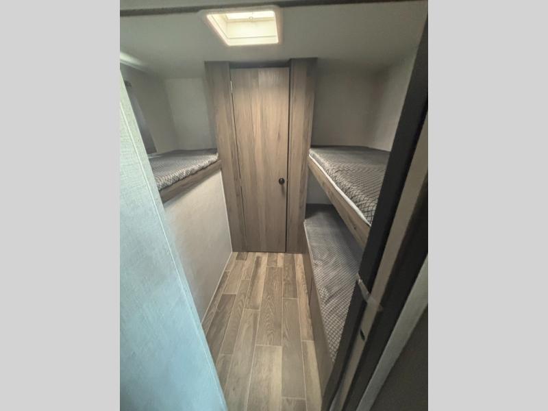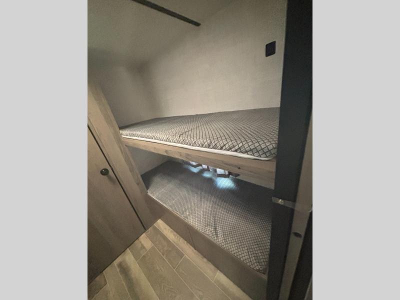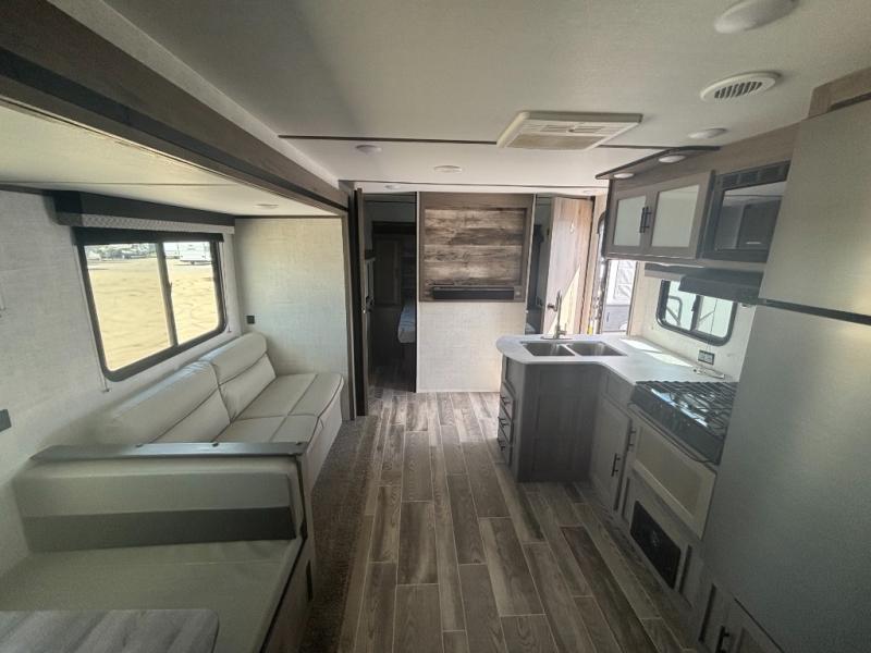 Calling all groups that need sleeping space for nine and outdoor fun! This trailer is perfect for a bigger group of friends or a larger family thanks to rear private bunkhouse with four bunks, a furniture slide out with a booth dinette and sofa, plus a private bedroom with a queen-size bed. Even on a rainy day, everyone will have their own space in one of the rooms. The chef will have full amenities to make meals, plus you might like to add the optional outside kitchen for more choices at meal time. The outside also offers a pass-through compartment for larger items and more gear, and the electric awning with LED lights provides an outdoor living area to enjoy.