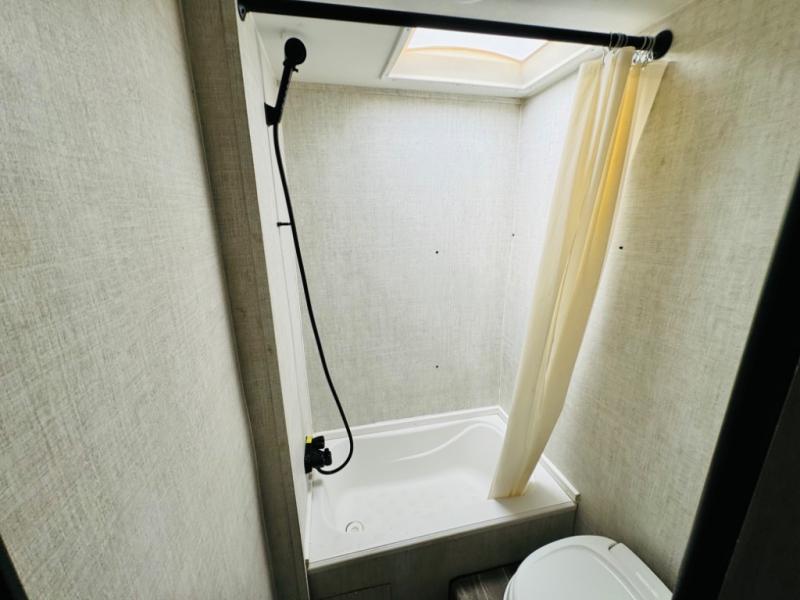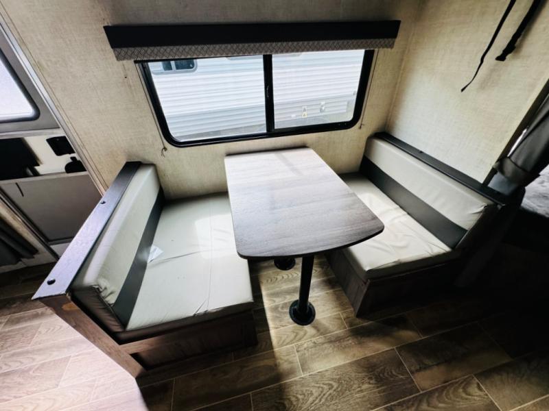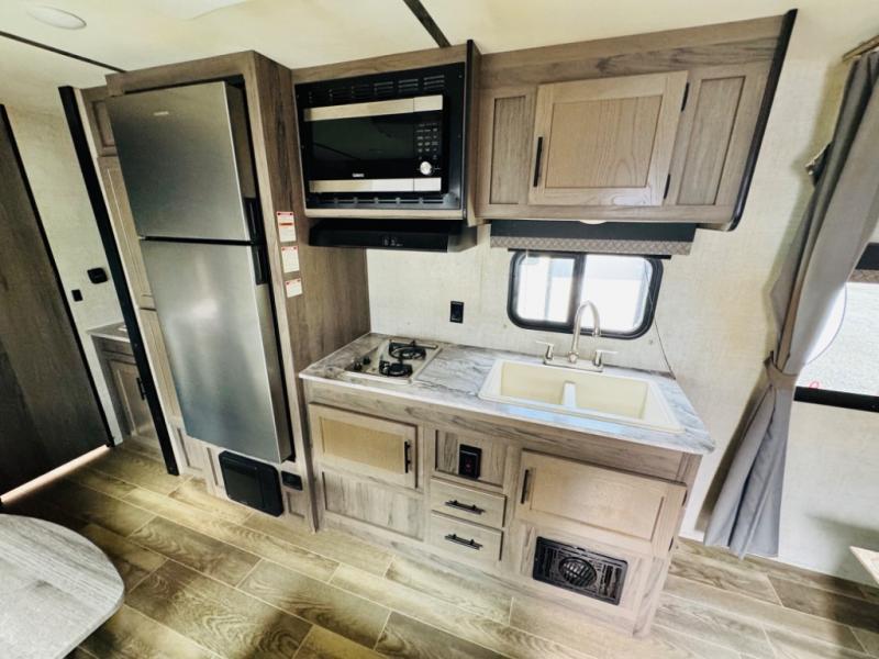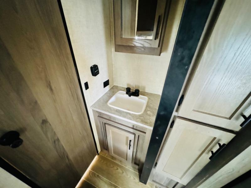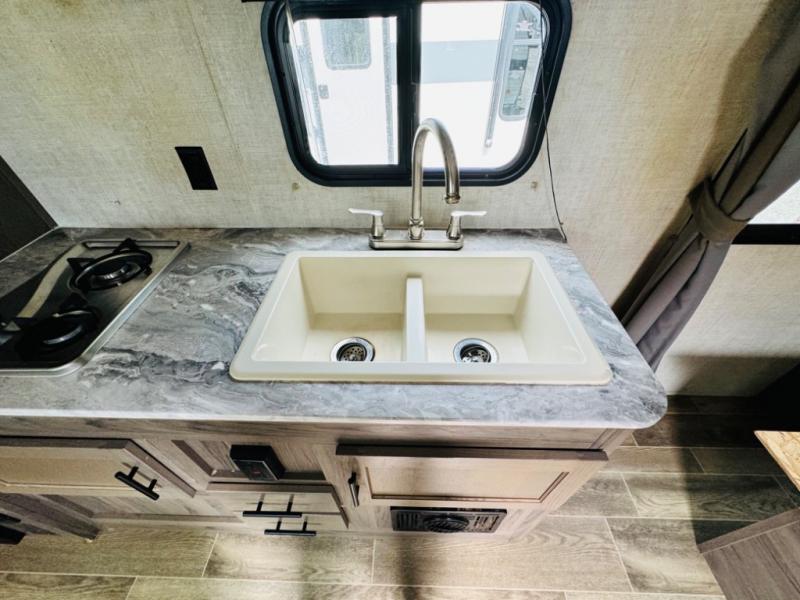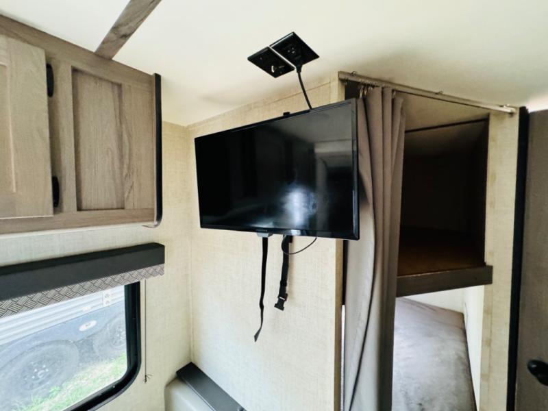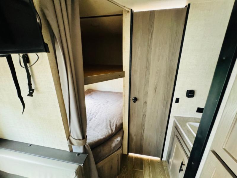 The kids will be begging to go camping every other weekend in this bunkhouse model. The double size bunks allow them to invite their cousins along, and you and your spouse will enjoy the queen bed up front. If you are needing more seating space during the day, just choose the optional Murphy bed in place of the queen bed! Making breakfast will be a snap on the three burner cooktop, and the pancake mix and syrup can be stored in the pantry.