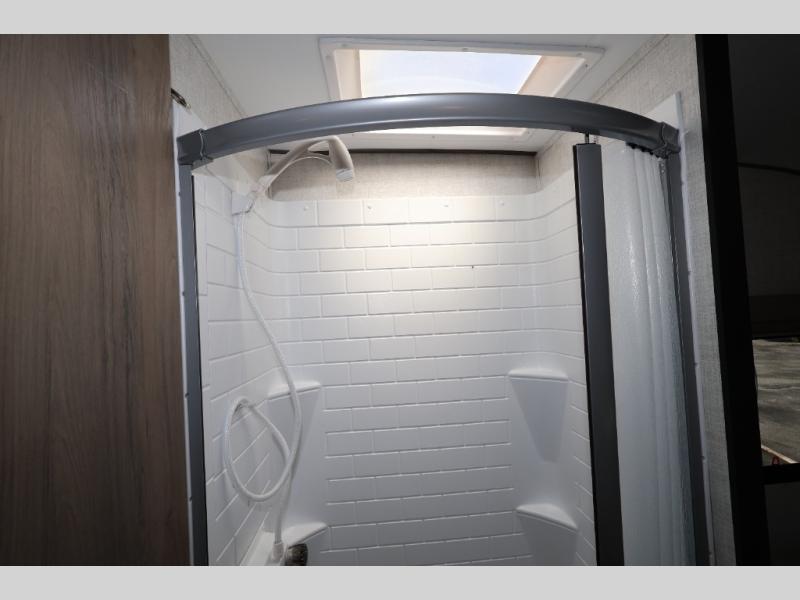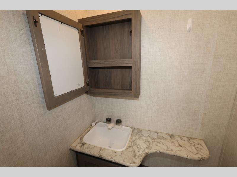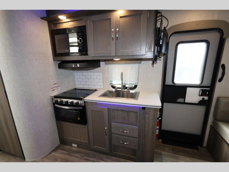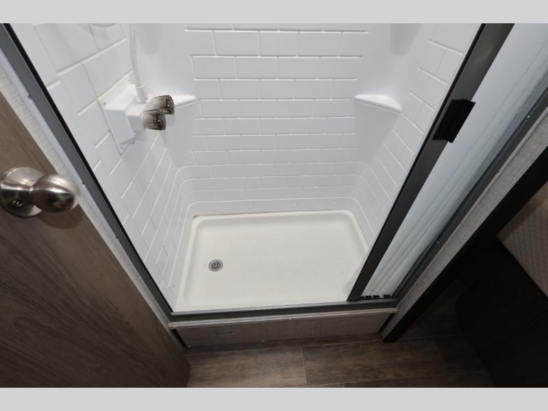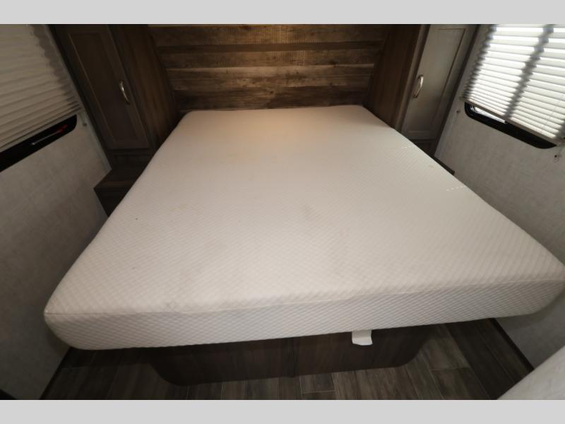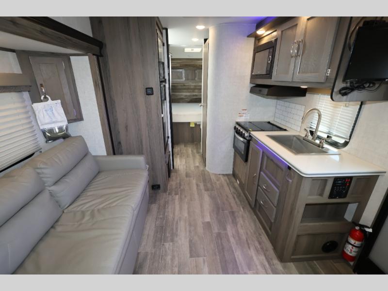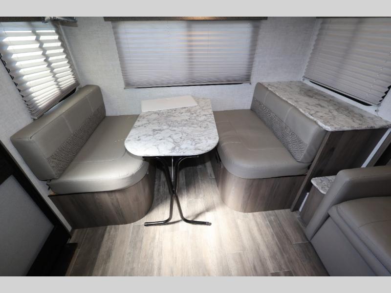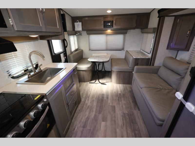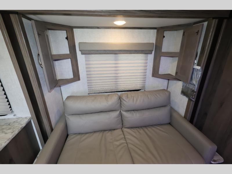 Book your favorite campsite and head to a great weekend getaway with your spouse and a guest or two in this travel trailer! There is a front 60" x 74" bed with shirt closets on either side for you to sleep on, and your guests can sleep on the sofa bed slide with end tables, as well as the rear booth dinette once they are converted. Whip up your best meals for everyone in the fully equipped kitchen that even has a microwave to pop a bag of popcorn at night. With a separated bathroom, everyone will be able to start their mornings feeling squeaky clean!