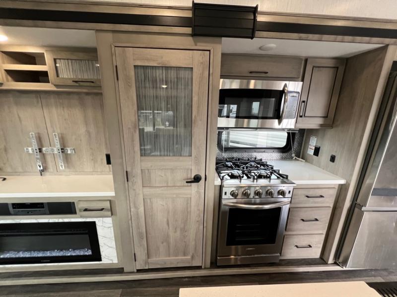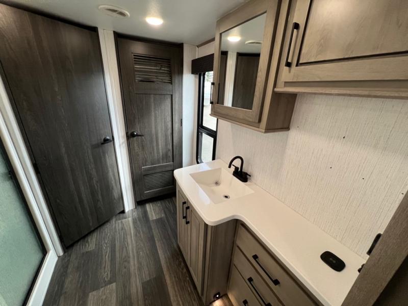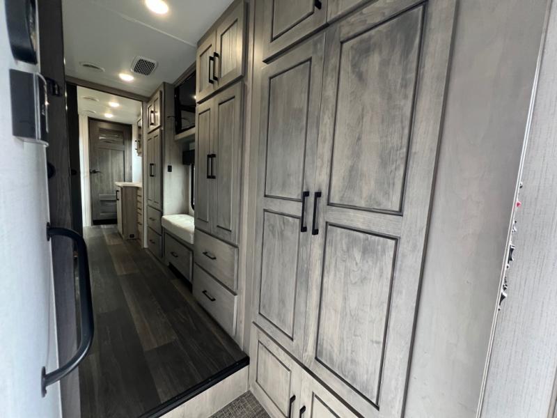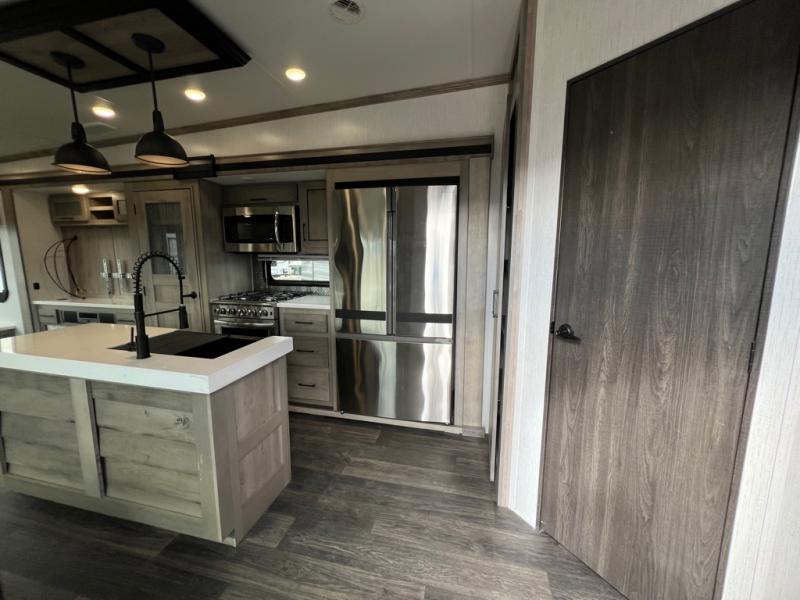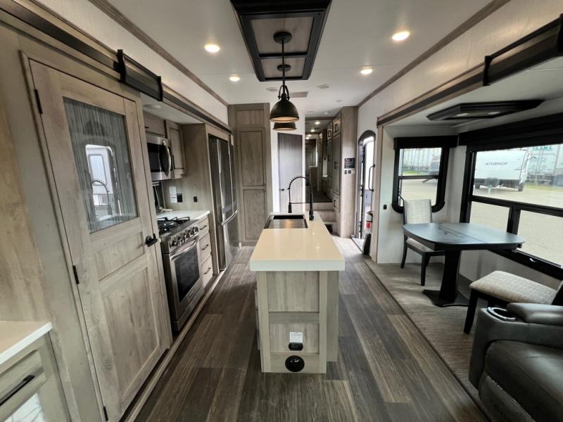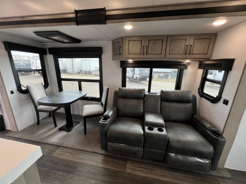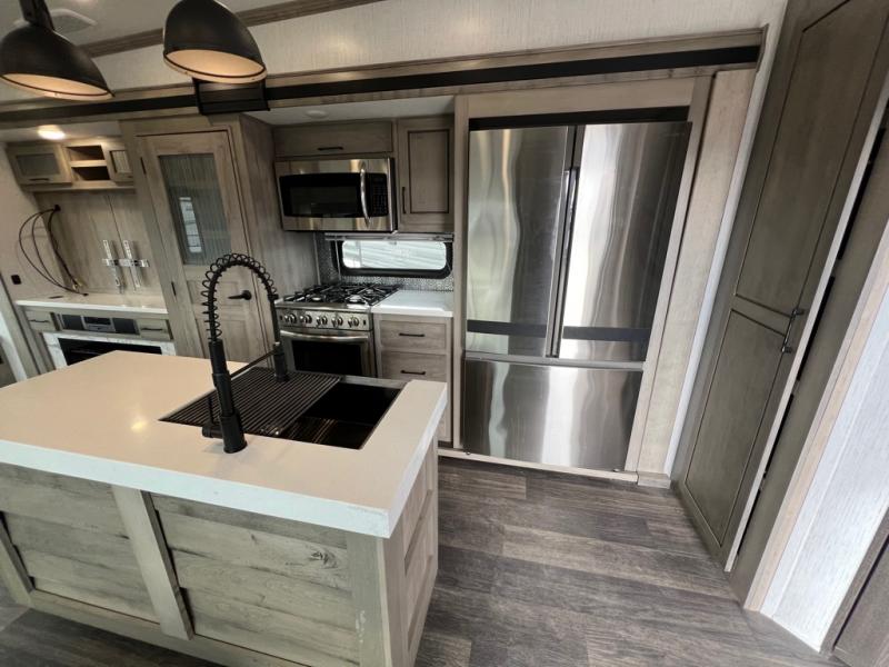 As you decide where you want to go next with this fifth wheel in tow, you can start loading up the stainless steel refrigerator, the full-size pantry, the bathroom wardrobes and the exterior pass-through storage with three points of access making loading and unloading easy. Once at your destination, you can setup the three slide outs, the awning, and start cooking in the spacious kitchen with an island including a farm style sink, a three burner cooktop, and convection oven. The free-standing table with four chairs is a great place to dine and you can eat while relaxing on the tri-fold sofa sleeper in the rear and the theater seats with heat and massage. The handy half bath is convenient, and the master suites provides a king bed slide and storage, as well as space saving sliding doors, and the front large full bathroom offers even more storage.