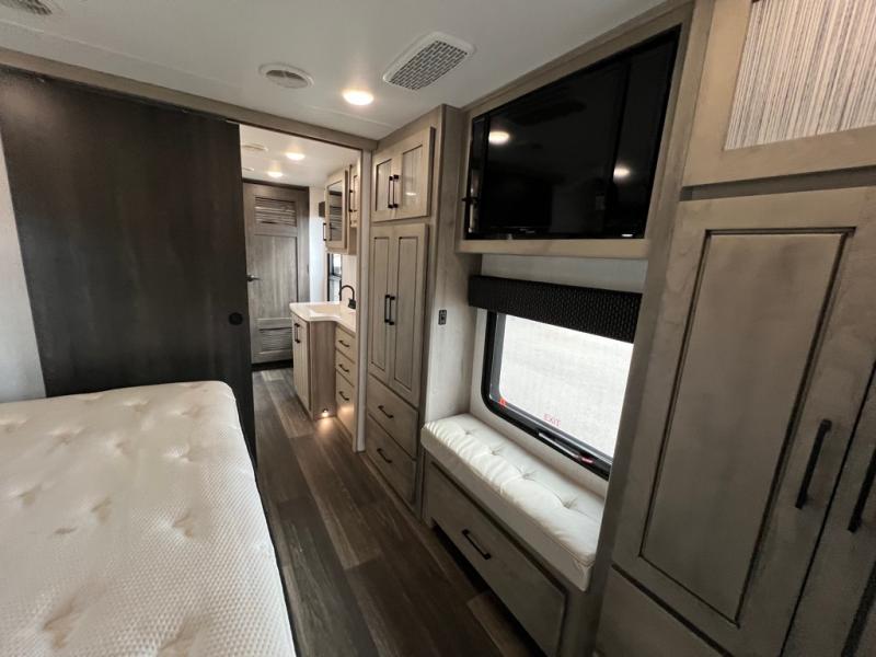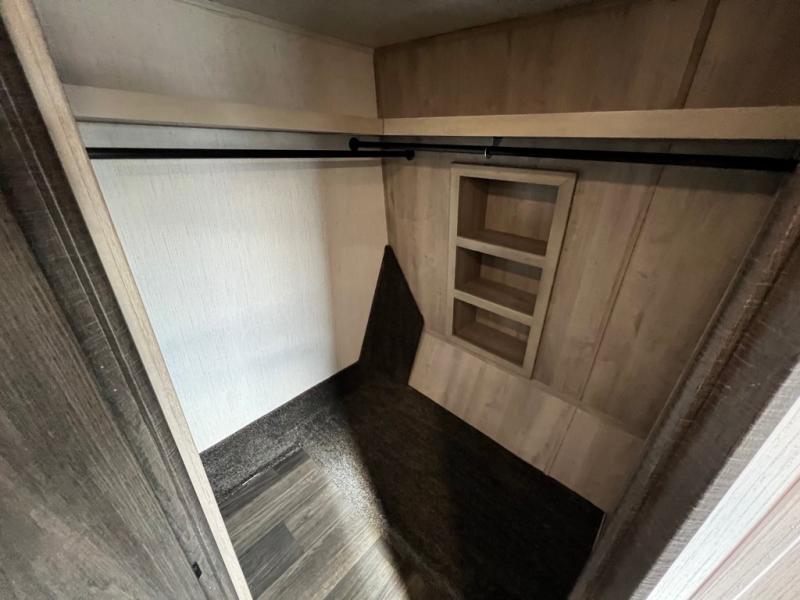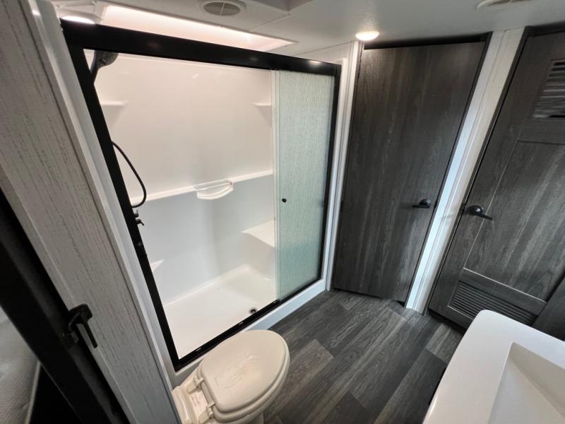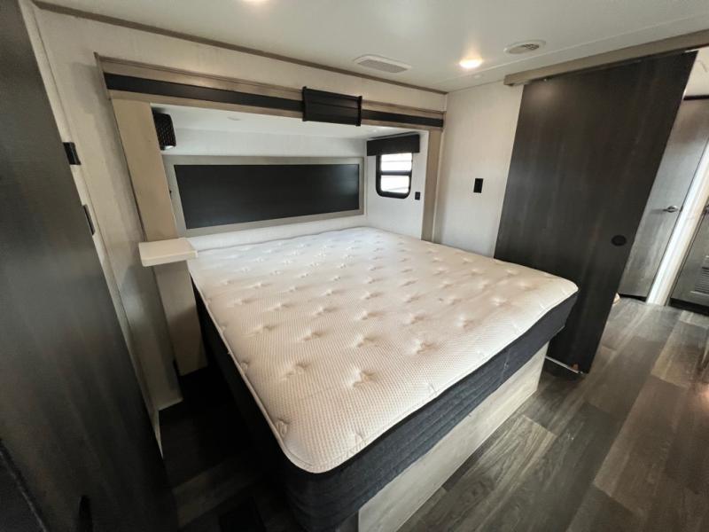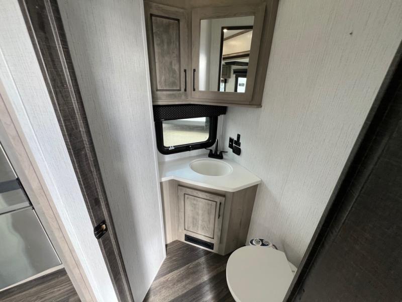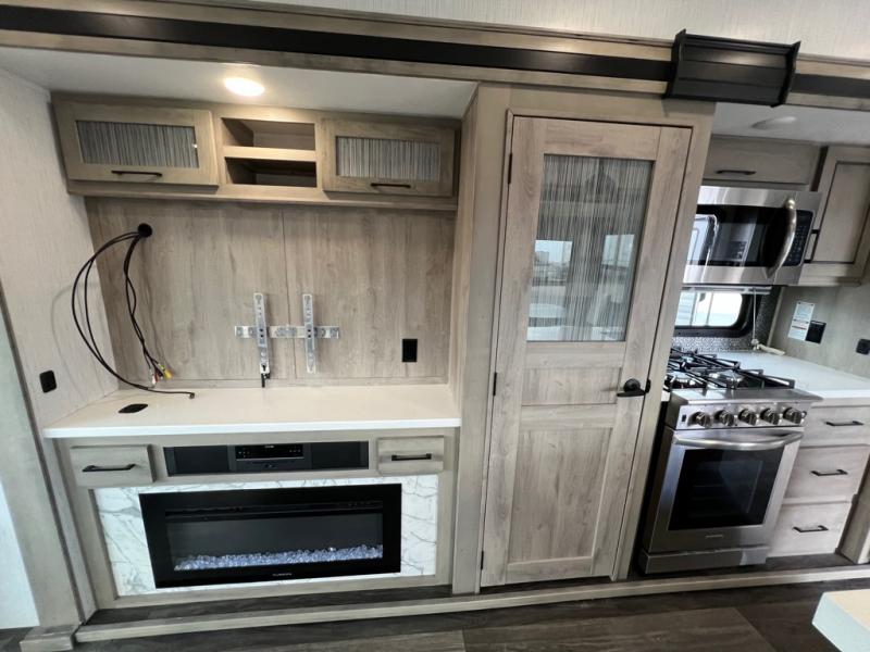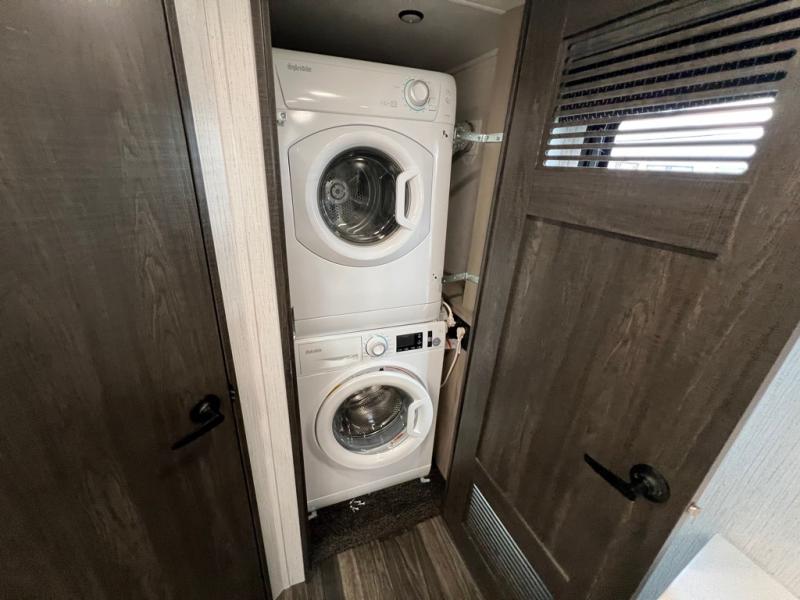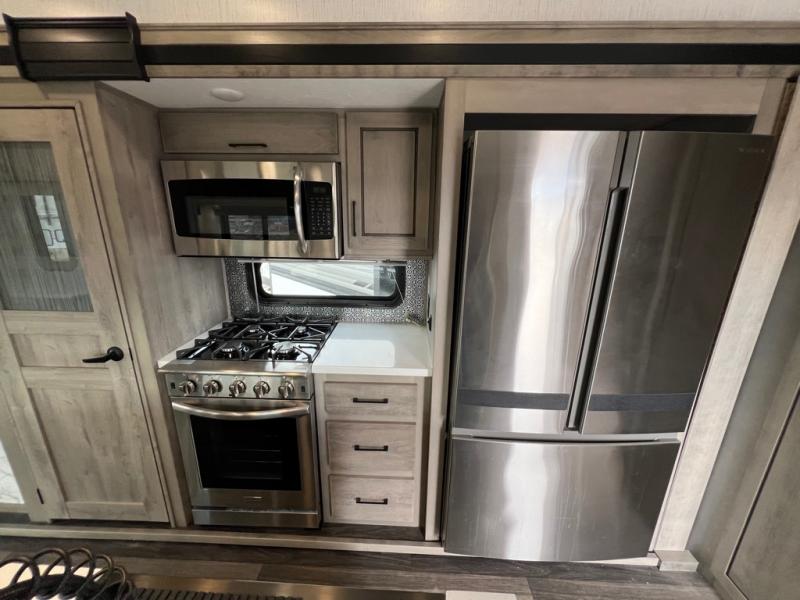 As you decide where you want to go next with this fifth wheel in tow, you can start loading up the stainless steel refrigerator, the full-size pantry, the bathroom wardrobes and the exterior pass-through storage with three points of access making loading and unloading easy. Once at your destination, you can setup the three slide outs, the awning, and start cooking in the spacious kitchen with an island including a farm style sink, a three burner cooktop, and convection oven. The free-standing table with four chairs is a great place to dine and you can eat while relaxing on the tri-fold sofa sleeper in the rear and the theater seats with heat and massage. The handy half bath is convenient, and the master suites provides a king bed slide and storage, as well as space saving sliding doors, and the front large full bathroom offers even more storage.