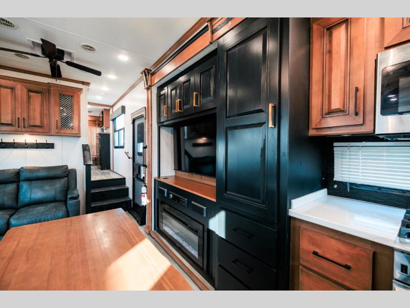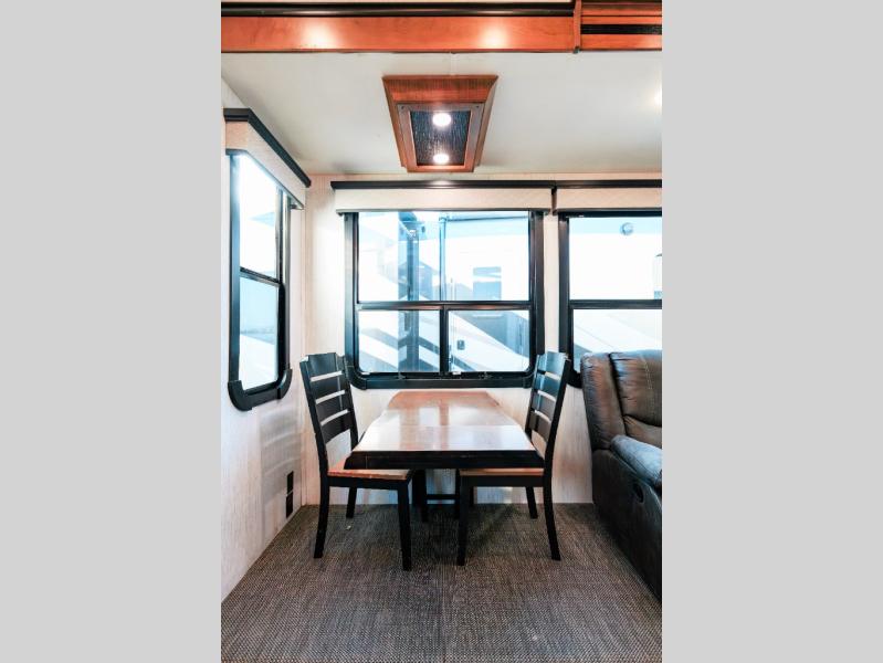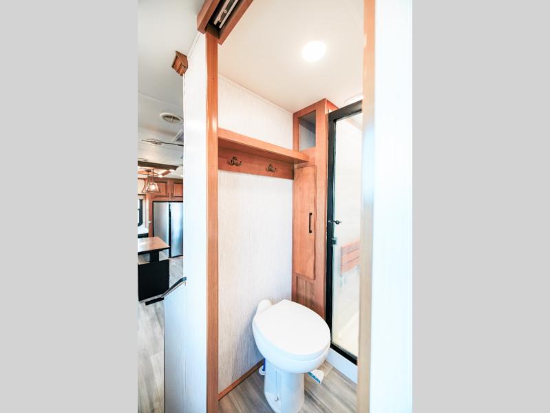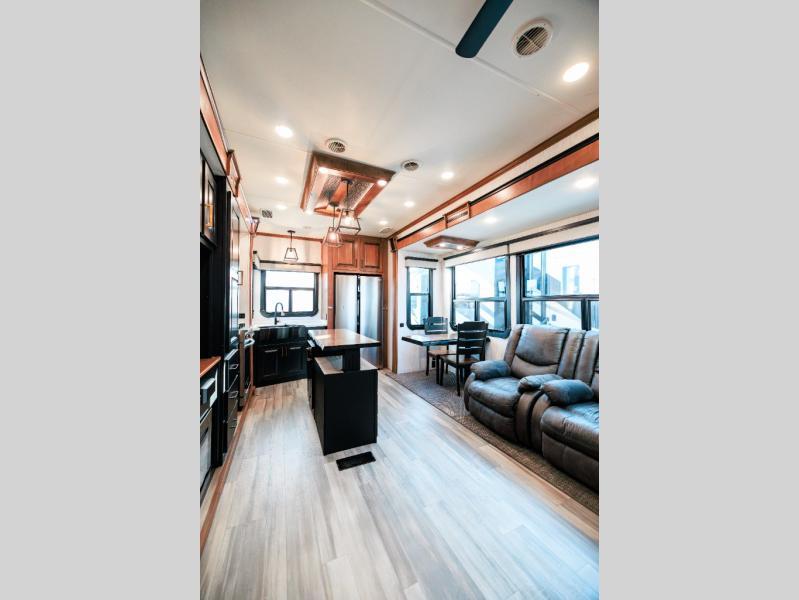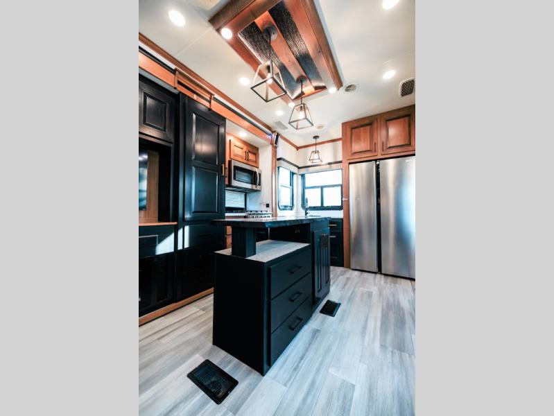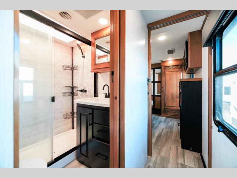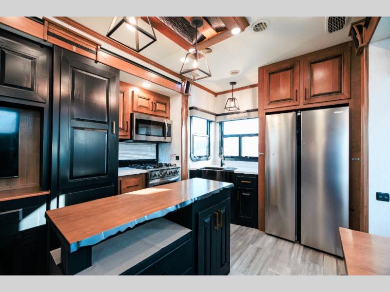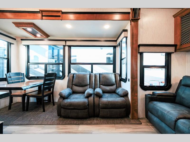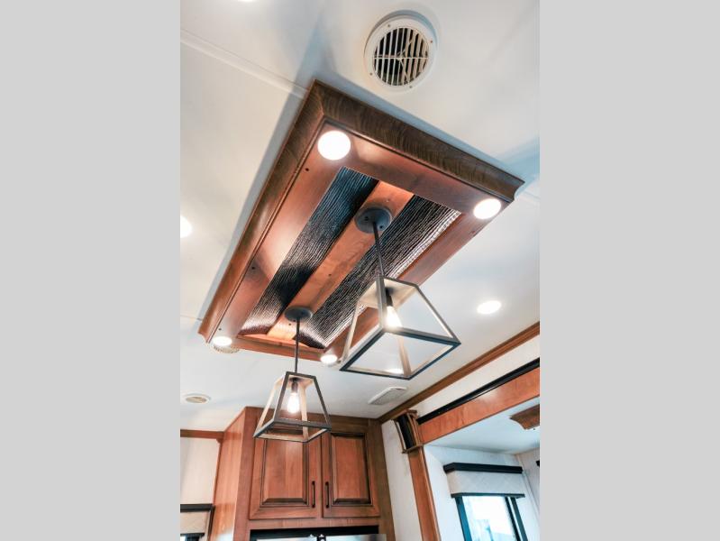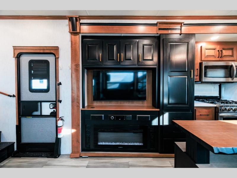 Looking for choices when you dine in your next RV? You have just that with the center island with stools or the live edge dinette table with two standard chairs and two folding chairs. You could work from these locations as well if needed. The rear kitchen offers windows for natural lighting and great views of your campsite, plus an 18 cu. ft. refrigerator, and a sink to keep everything clean. You will love your kitchen appliances nearby to make warm meals, plus there is a pantry. Everyone can gather to watch the 55" LED TV with recessed fireplace below while sitting on the two sofas. The bathroom offers a teak wood seat for maximum comfort when getting cleaned up, and the front bedroom gives you your own space to relax and watch the 32" LED TV, wash a load of clothes if you added the washer/dryer option, and enjoy the views out of all the windows.