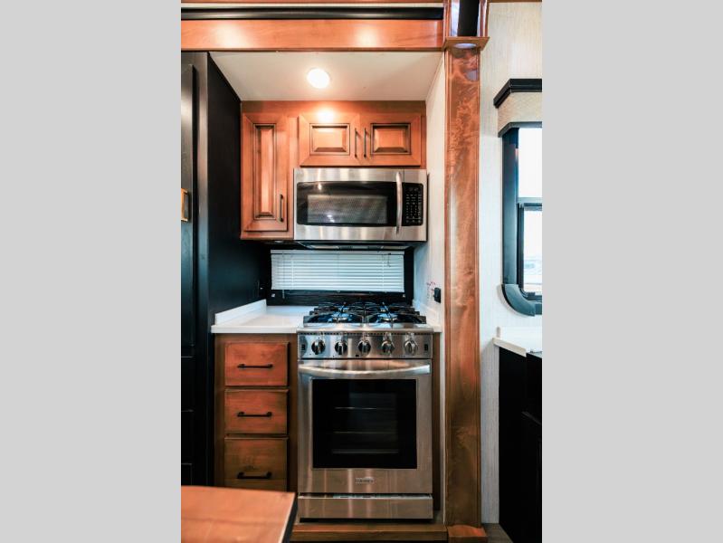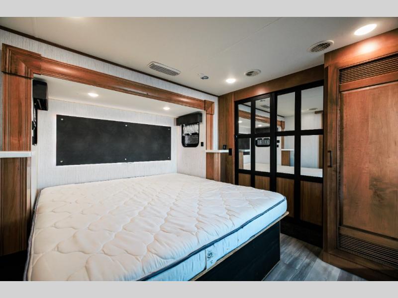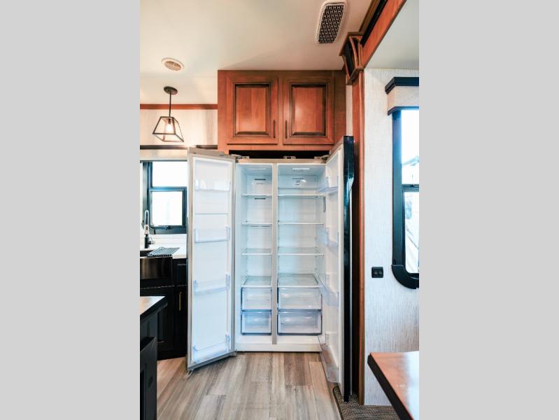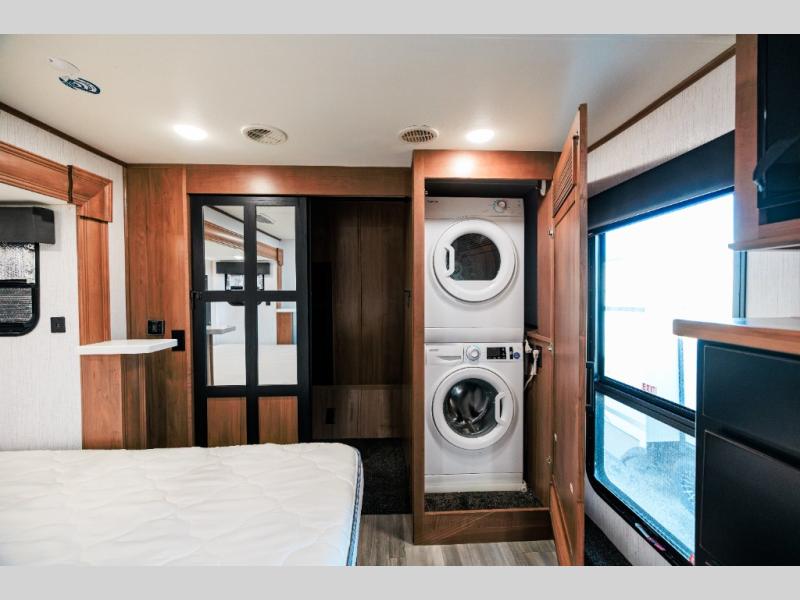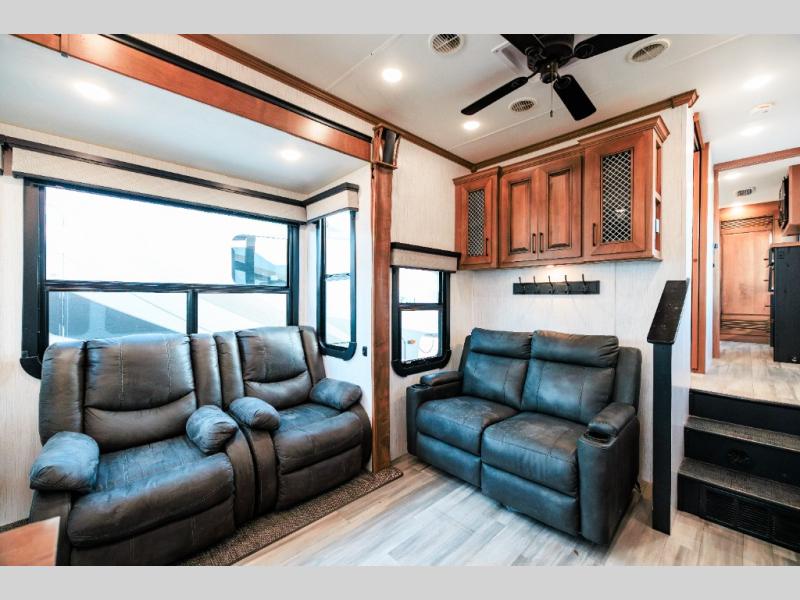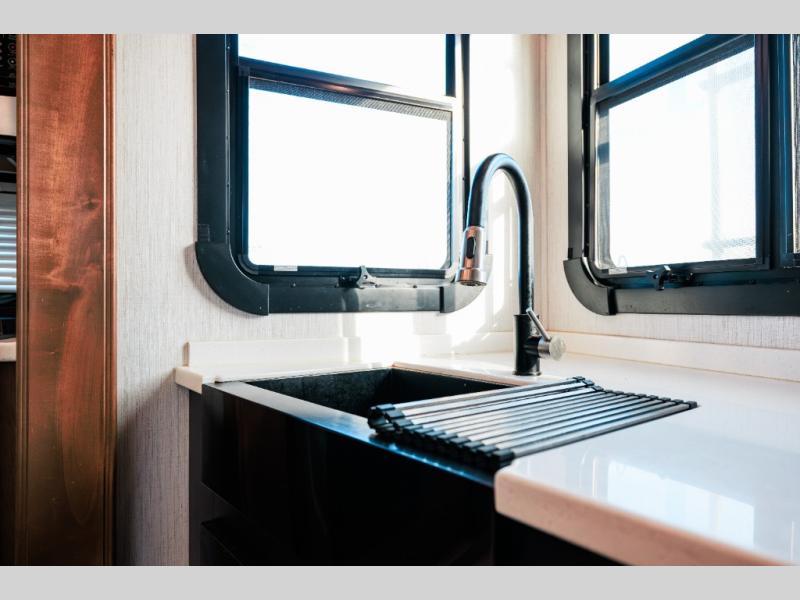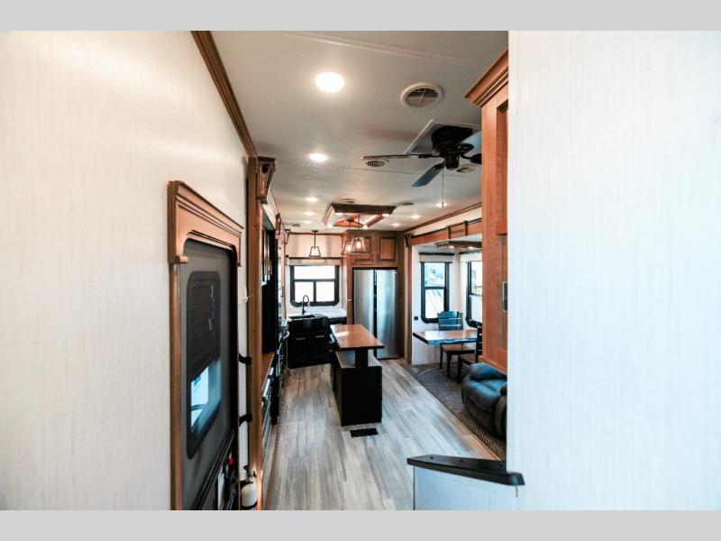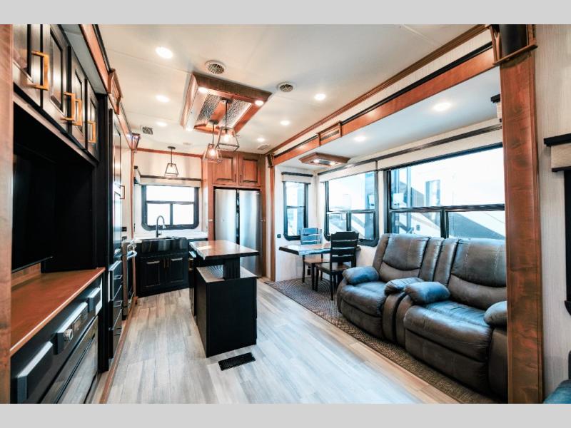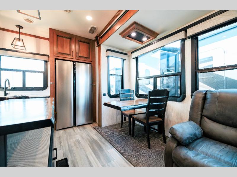 Looking for choices when you dine in your next RV? You have just that with the center island with stools or the live edge dinette table with two standard chairs and two folding chairs. You could work from these locations as well if needed. The rear kitchen offers windows for natural lighting and great views of your campsite, plus an 18 cu. ft. refrigerator, and a sink to keep everything clean. You will love your kitchen appliances nearby to make warm meals, plus there is a pantry. Everyone can gather to watch the 55" LED TV with recessed fireplace below while sitting on the two sofas. The bathroom offers a teak wood seat for maximum comfort when getting cleaned up, and the front bedroom gives you your own space to relax and watch the 32" LED TV, wash a load of clothes if you added the washer/dryer option, and enjoy the views out of all the windows.
