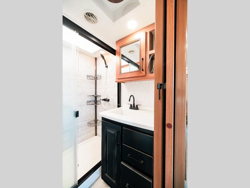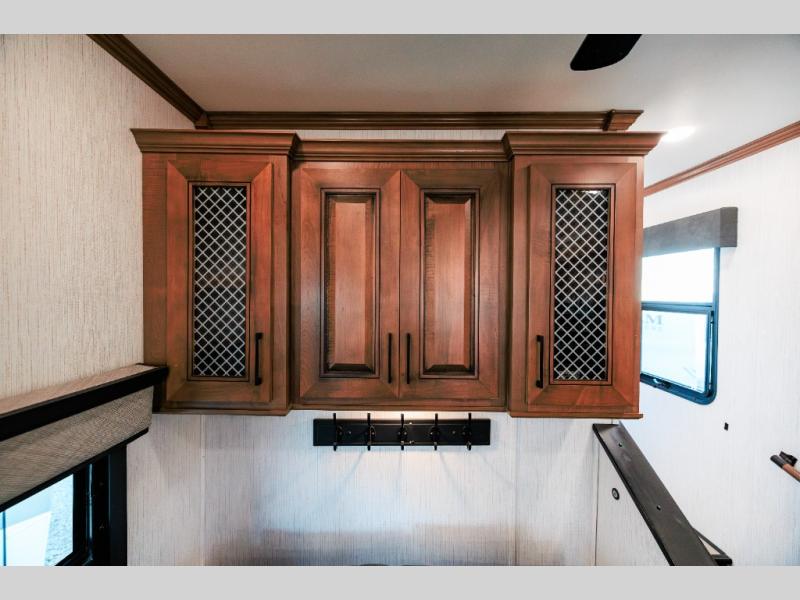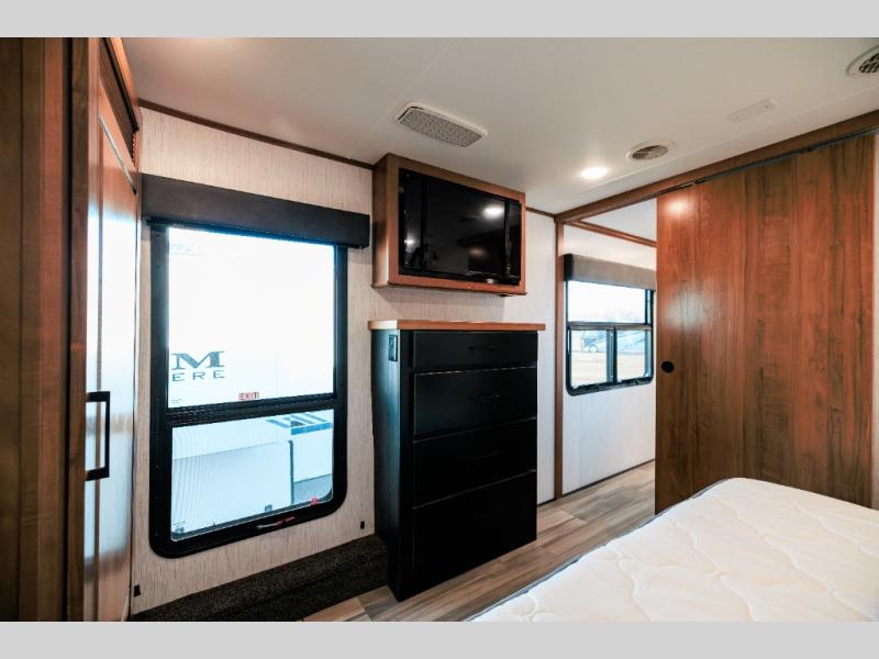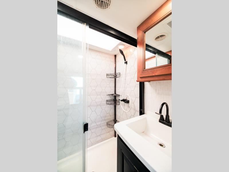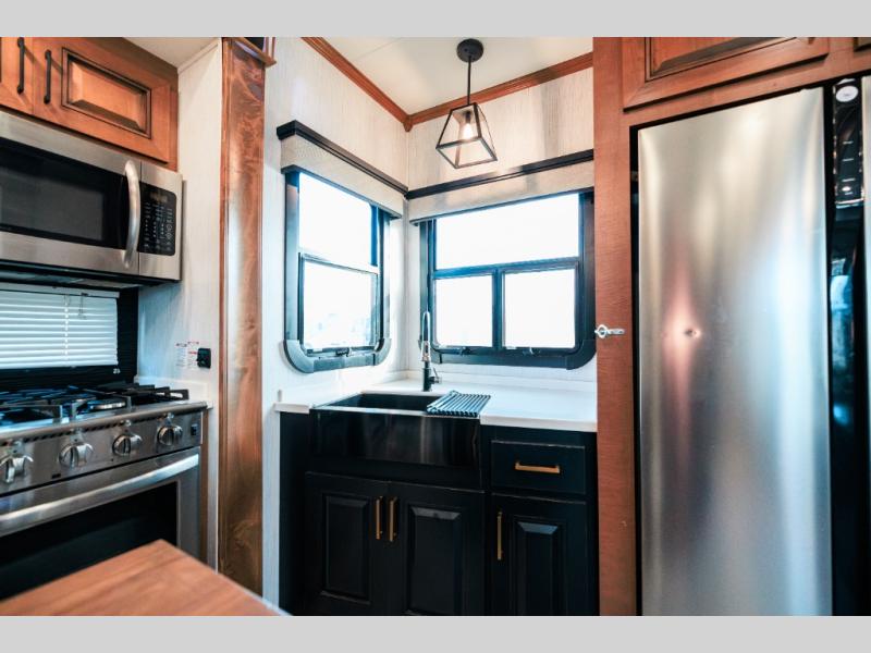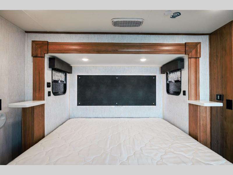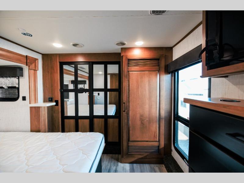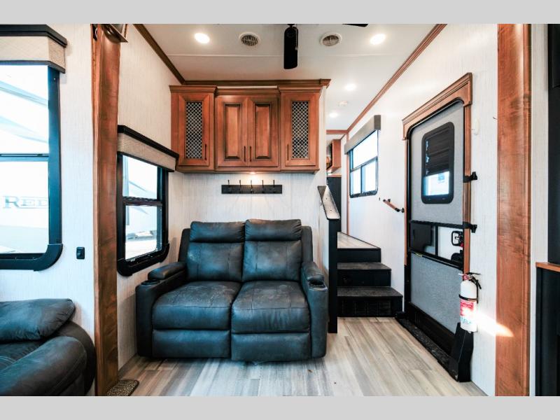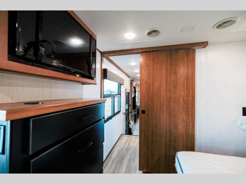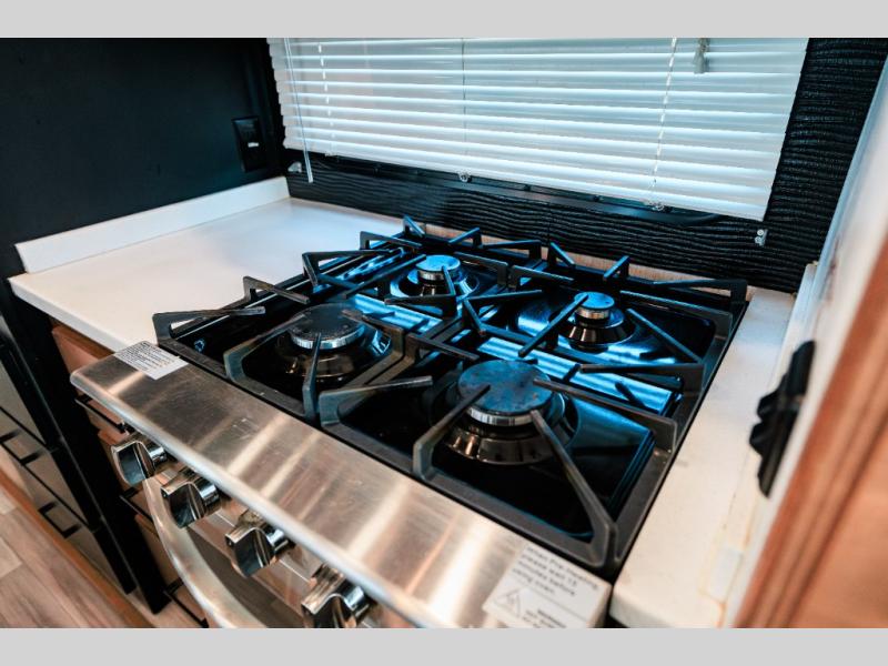 Looking for choices when you dine in your next RV? You have just that with the center island with stools or the live edge dinette table with two standard chairs and two folding chairs. You could work from these locations as well if needed. The rear kitchen offers windows for natural lighting and great views of your campsite, plus an 18 cu. ft. refrigerator, and a sink to keep everything clean. You will love your kitchen appliances nearby to make warm meals, plus there is a pantry. Everyone can gather to watch the 55" LED TV with recessed fireplace below while sitting on the two sofas. The bathroom offers a teak wood seat for maximum comfort when getting cleaned up, and the front bedroom gives you your own space to relax and watch the 32" LED TV, wash a load of clothes if you added the washer/dryer option, and enjoy the views out of all the windows.