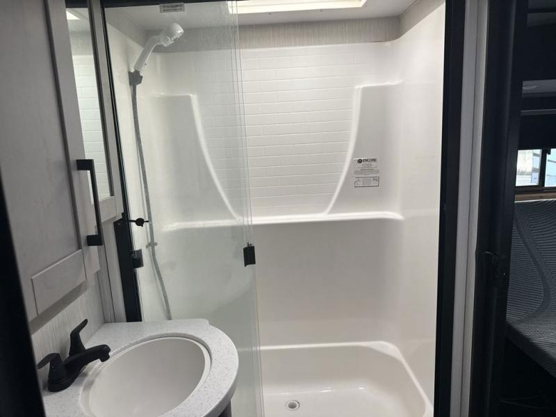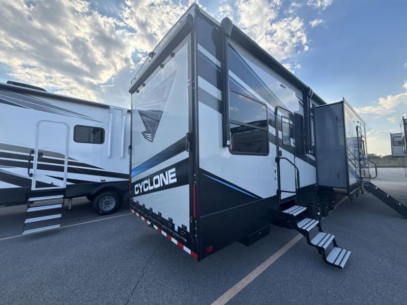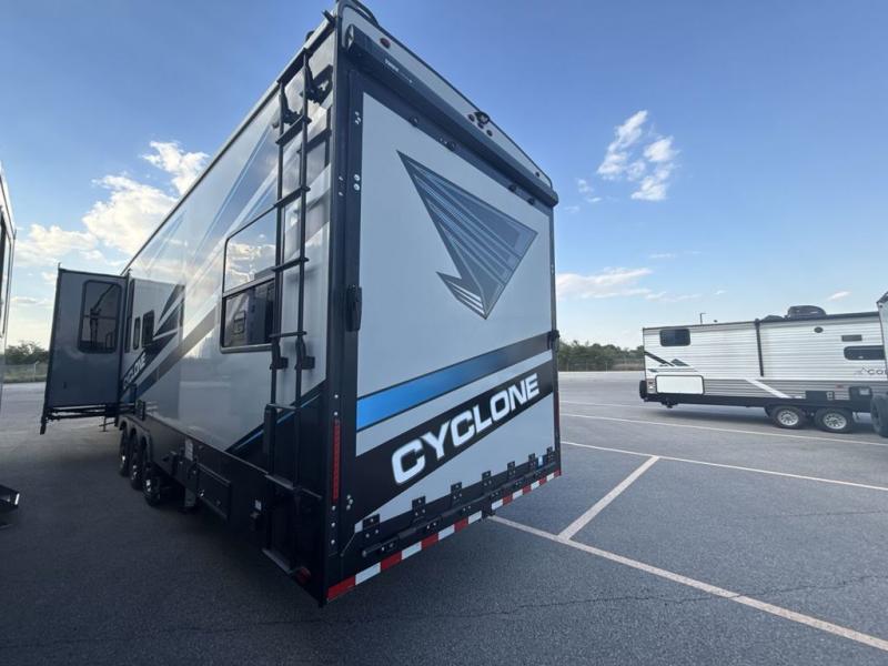 Satisfy your wanderlust with a Heartland Cyclone fifth wheel toy hauler! You won't have to sacrifice any luxury either with indulgent features like the king bedroom suite with a "swift space" work station that pulls out from the dresser, a Stor-Mor three-sided access to the basement with 30% more storage capacity, and Step Caddy folding patio step for better stability as you enter or exit the patio. The industry first Grill and Go 25" residential pull out 3 burner griddle combo comes on models with an exterior kitchen for an easier cooking experience. Full height shaker cabinetry provides 25% more storage space so you can bring more camping necessities with you. If you like to dry camp longer then you will appreciate the industry's largest 150 gallons fresh water tanks. Come find the perfect model for you today!