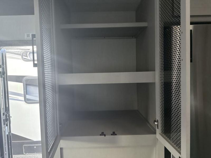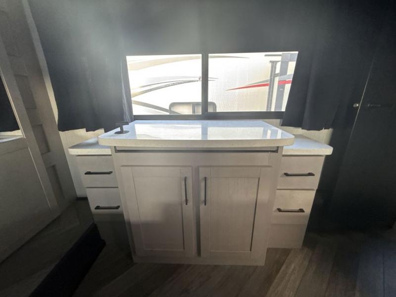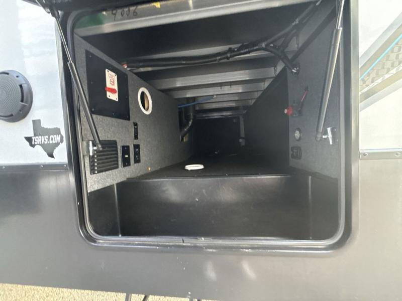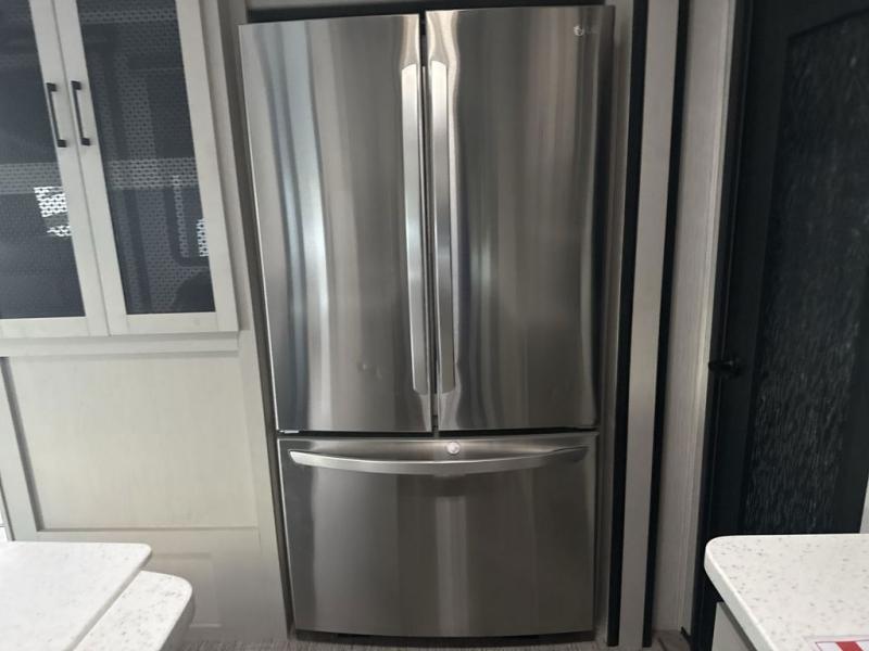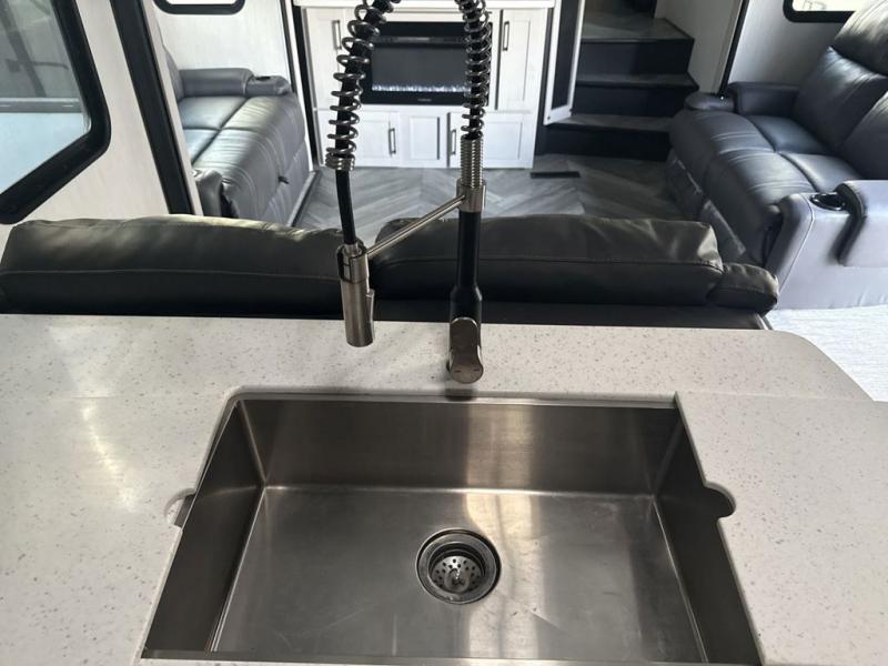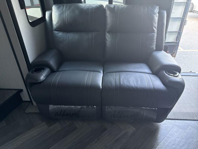 Everyone will have a comfortable place to sit in this toy hauler with the dual opposing theater seating slides and the third theater seating across from the 50" LCD HDTV! The 3,000 lb. weather resistant 8' ramp door makes it easy to load your toys into the 13' garage and then unload them once you have arrived and set up the electric queen bed above the split bench seating, the loft, the half bathroom, and there is even an area prepped to add an optional washer and dryer. There is plenty of countertop space in the U-shaped kitchen to prepare your best home cooked meals, and you even have an outside refrigerator to enjoy a cold beverage underneath the two awnings!