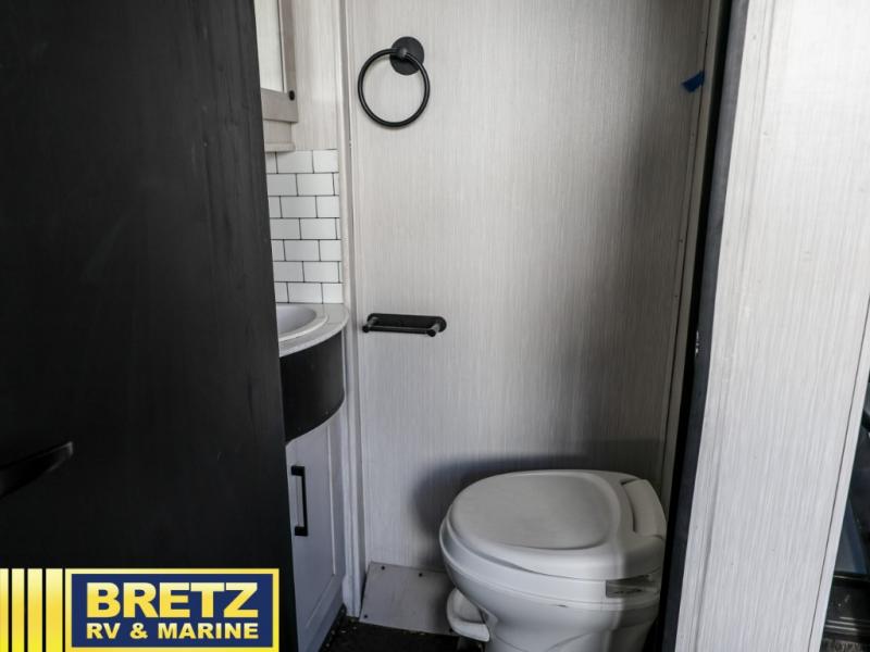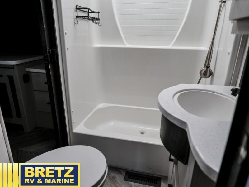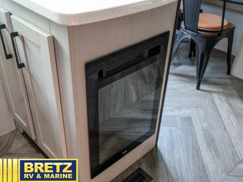 With a 13' garage, you can bring your favorite off-road toys with you to the campground in this toy hauler! You might not want to leave the front master suite once you experience all of the comforts it has to offer like the double slide tilting king bed, the dresser with a fireplace and ability to turn into a "swift space" work station, and the front wardrobe which has an area prepped to add an optional washer and dryer, plus you even have access to the dual entry bathroom. Grab some eggs from the 18 cu. ft. refrigerator, fry them up on the three burner cooktop in the U-shaped kitchen, and then enjoy them at the one sided booth dinette. At night, you can either relax on the high quality over stuffed four person sofa or head to the garage area and play some games at the split bench seating below the electric queen bed. The garage also has a half bathroom, a loft, and one of the dual entry doors!