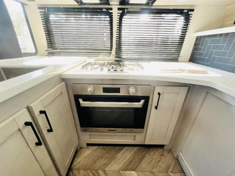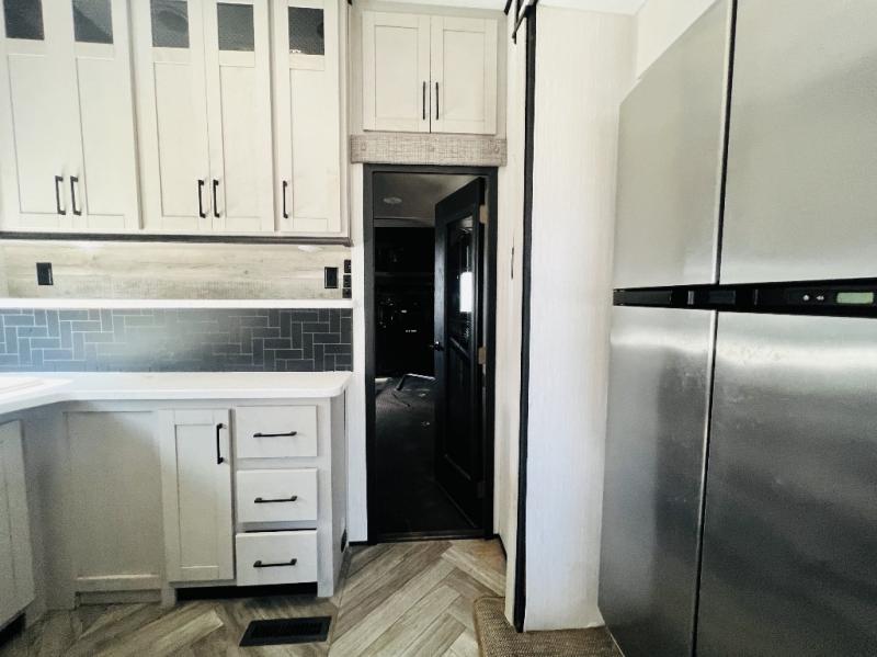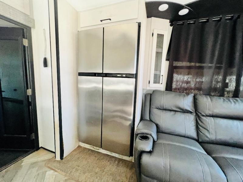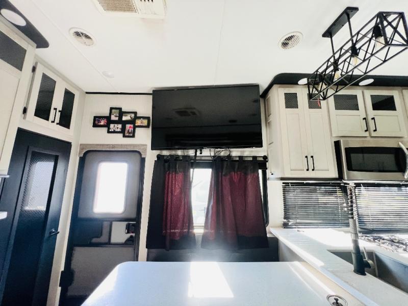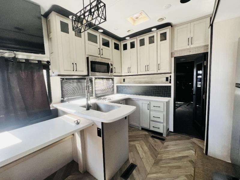 With the convenience of two kitchens (one inside and one outside) who wouldn’t want this 4115 Cyclone toy hauler fifth wheel by Heartland RV? The outside kitchen lets you breathe in some fresh air and watch the kids playing while you cook dinner. With the large garage (15’1”) you can easily bring along your favorite off-road toys whether that is a few dirt bikes or a four wheeler. At night this area offers an electric queen bed and during the day the split bench seat is below so you can relax and unwind after a fun outdoors on the toys. And someone can retire in the comfortable front bedroom where you will find a tilting king bed, and plenty of storage with the wardrobe slide and cabinet that stretches into the hallway!