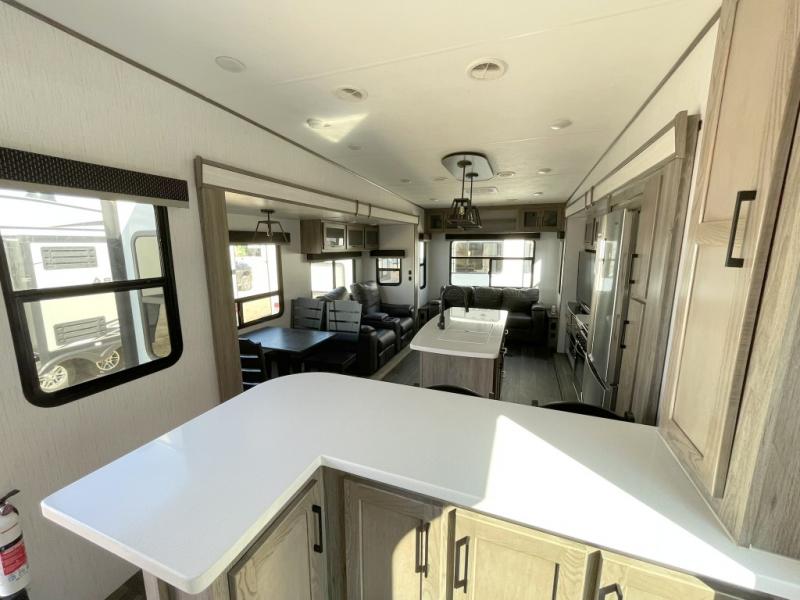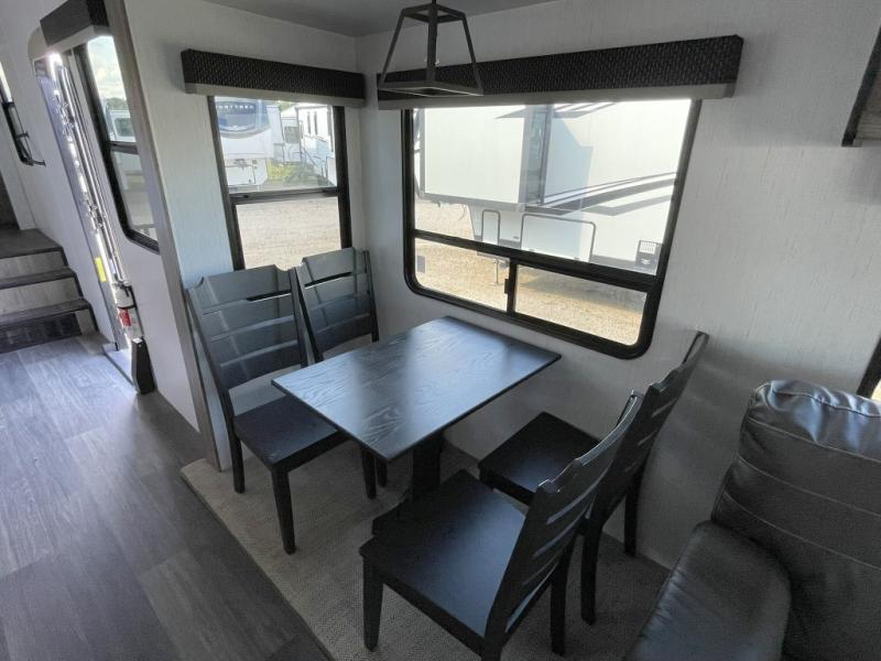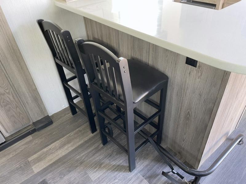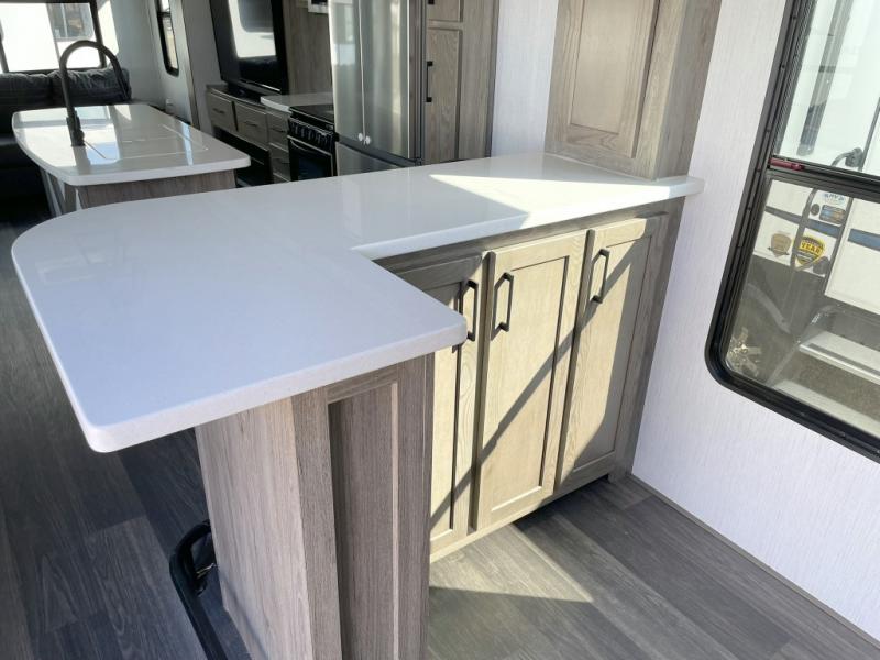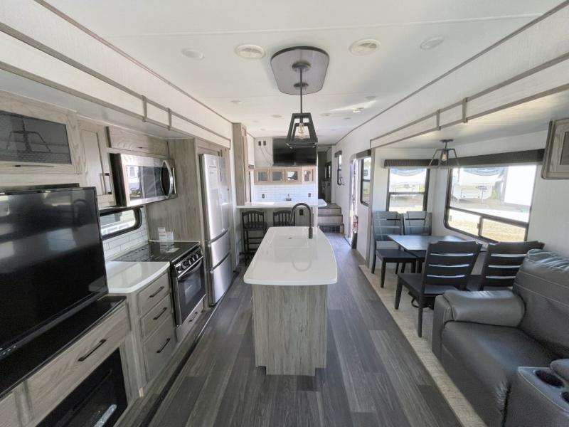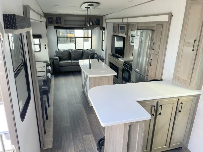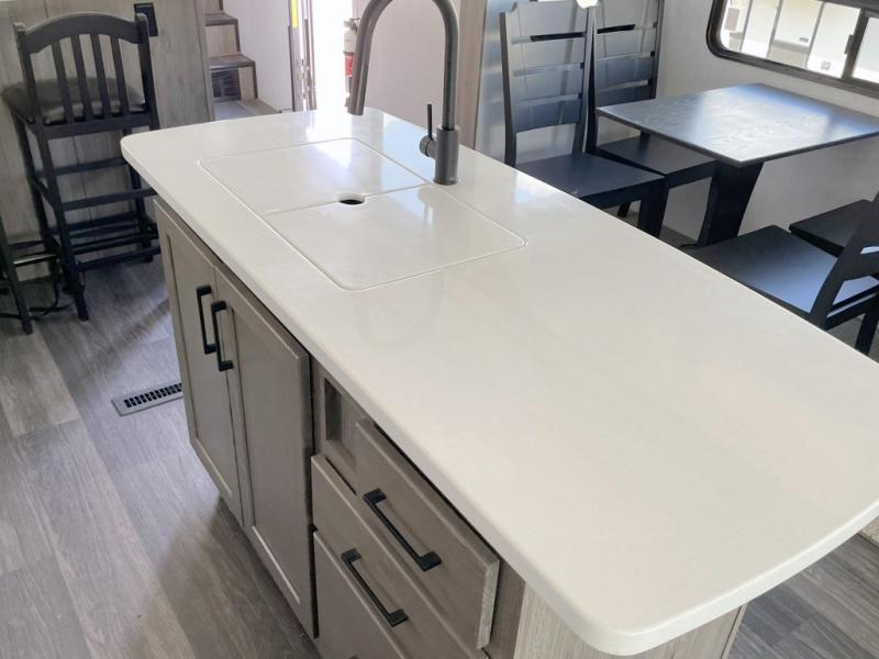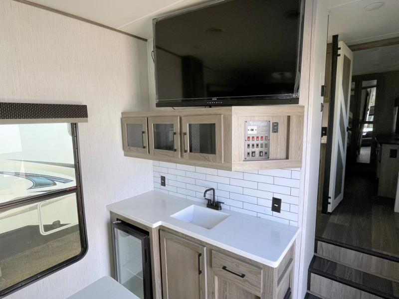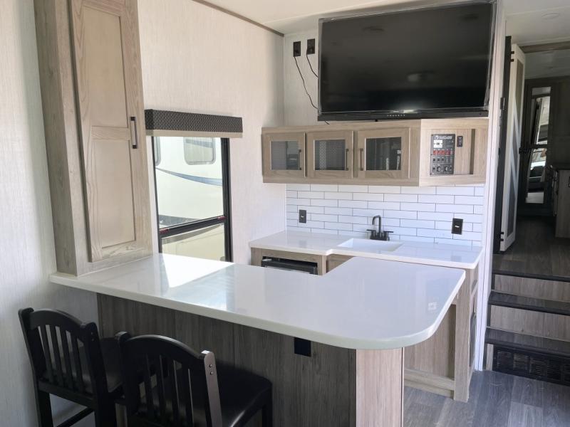 Your family will love camping in this fifth wheel or making it your full-time RV. Once you arrive at your destination, prepare a cold drink at the bar area. Here, you'll appreciate a counter with stools, a sink to wash up, and a mini fridge to keep your beverages cold. There is also a free-standing dinette table where the kids can play a game of cards at, and theater seating to kick your feet up. You and your spouse will love the front private bedroom, while the grandkids sleep on the sofa in the rear living area. In the morning, prepare breakfast on the three burner cooktop before heading out to find a trail or two!