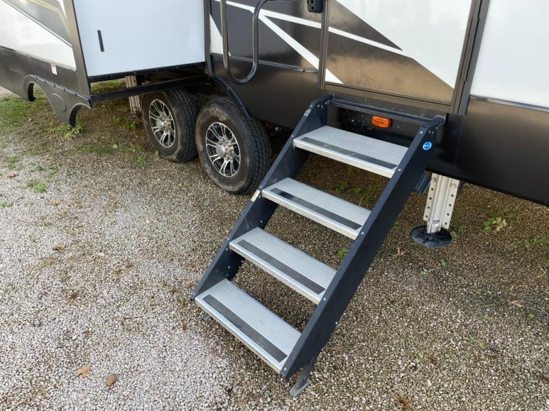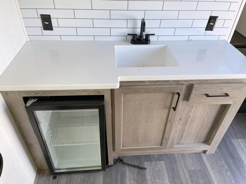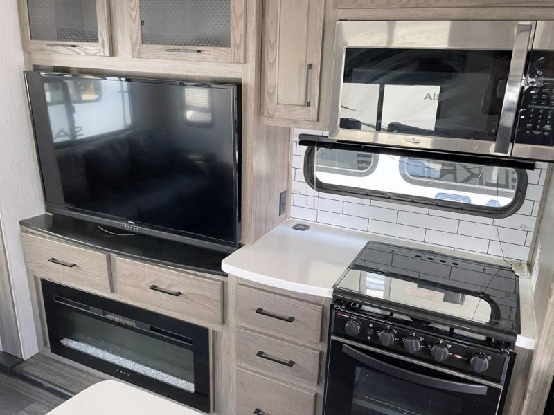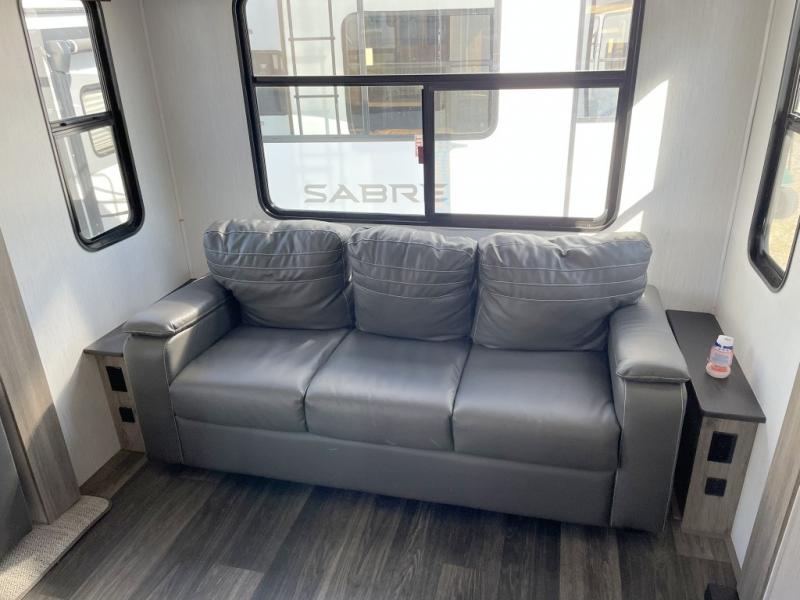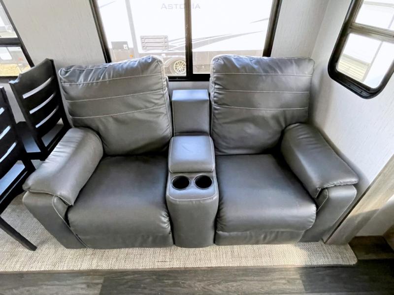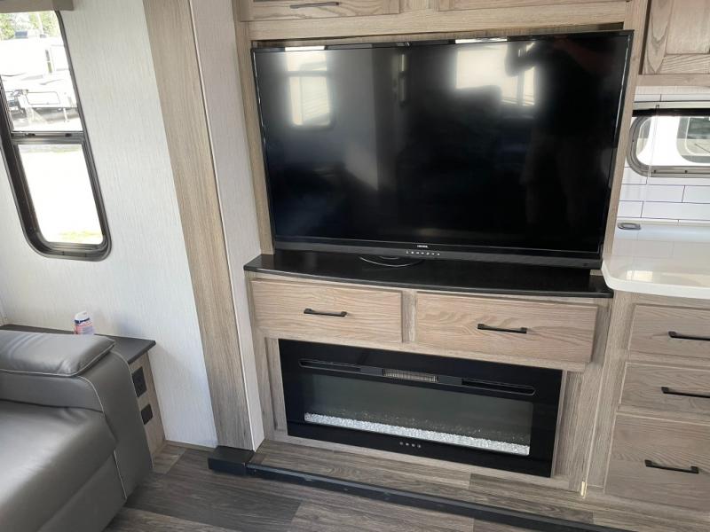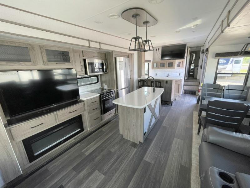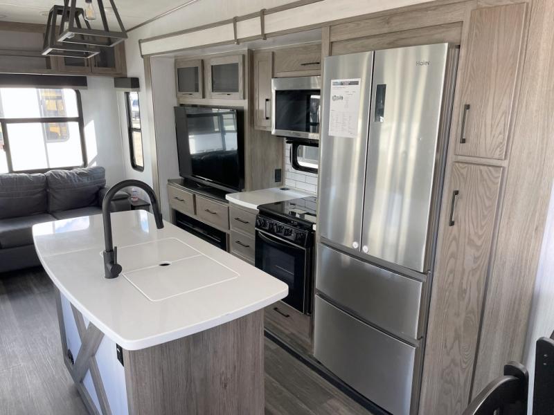 Your family will love camping in this fifth wheel or making it your full-time RV. Once you arrive at your destination, prepare a cold drink at the bar area. Here, you'll appreciate a counter with stools, a sink to wash up, and a mini fridge to keep your beverages cold. There is also a free-standing dinette table where the kids can play a game of cards at, and theater seating to kick your feet up. You and your spouse will love the front private bedroom, while the grandkids sleep on the sofa in the rear living area. In the morning, prepare breakfast on the three burner cooktop before heading out to find a trail or two!