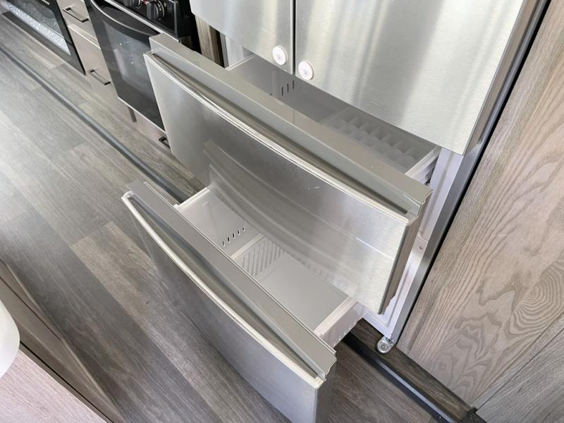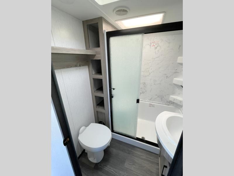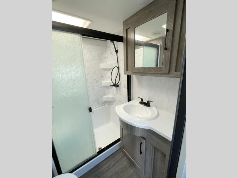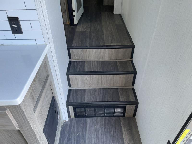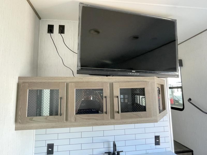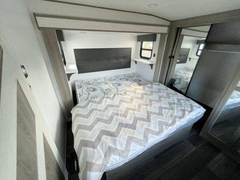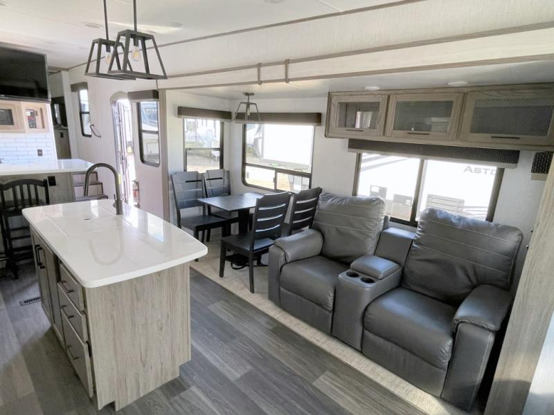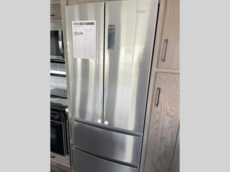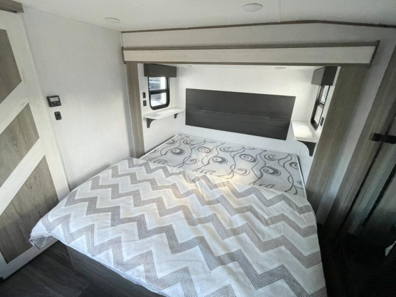 Your family will love camping in this fifth wheel or making it your full-time RV. Once you arrive at your destination, prepare a cold drink at the bar area. Here, you'll appreciate a counter with stools, a sink to wash up, and a mini fridge to keep your beverages cold. There is also a free-standing dinette table where the kids can play a game of cards at, and theater seating to kick your feet up. You and your spouse will love the front private bedroom, while the grandkids sleep on the sofa in the rear living area. In the morning, prepare breakfast on the three burner cooktop before heading out to find a trail or two!
