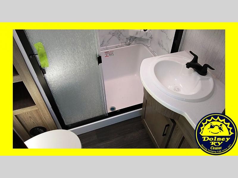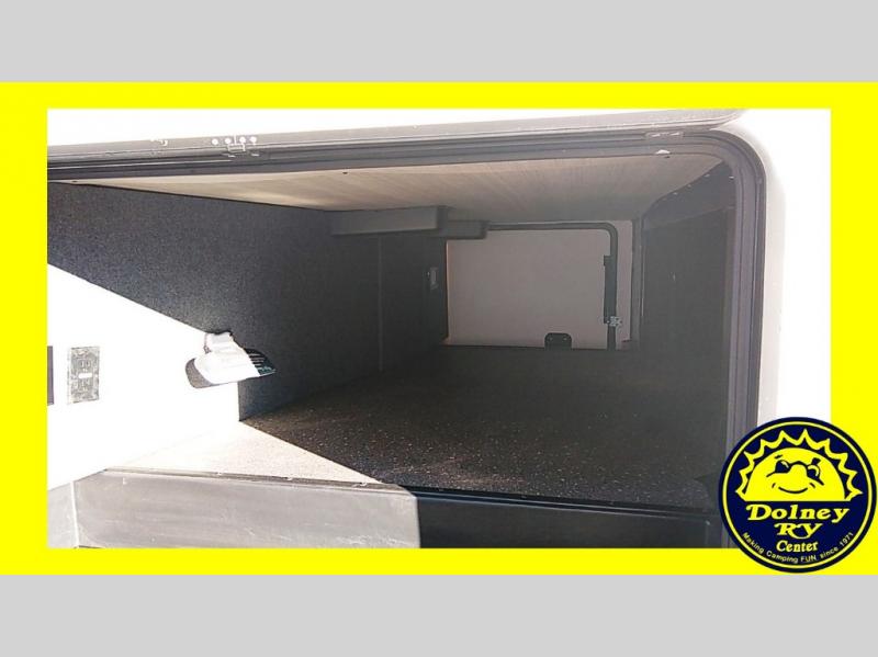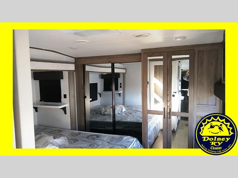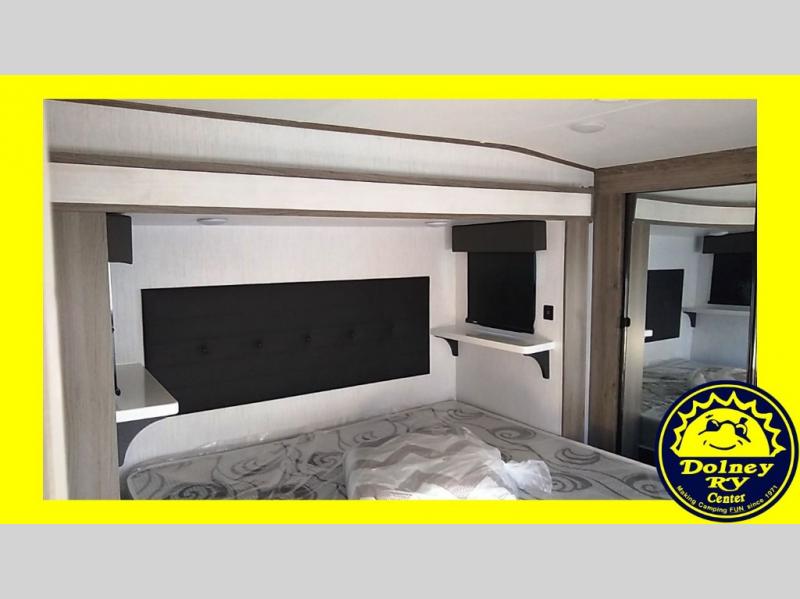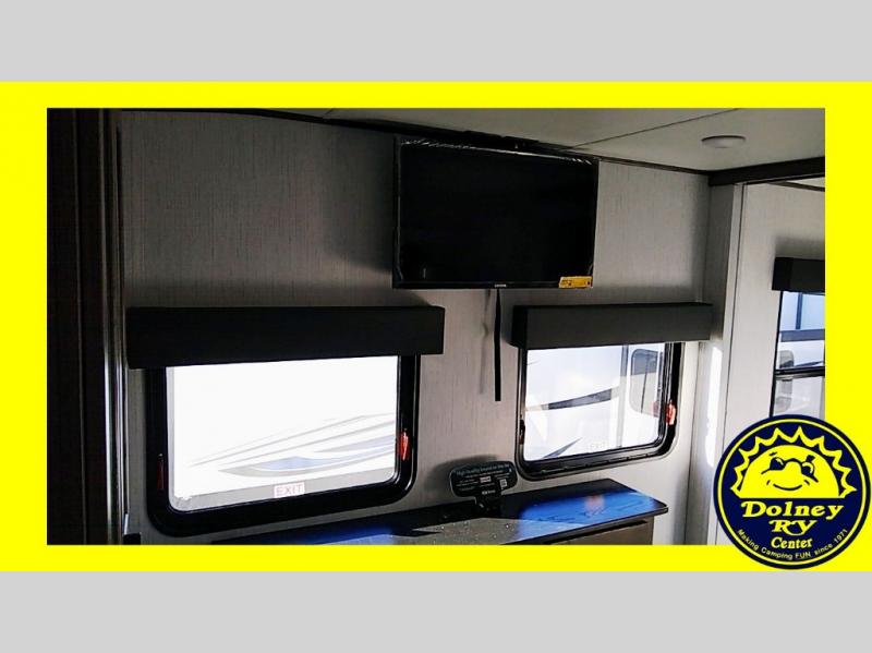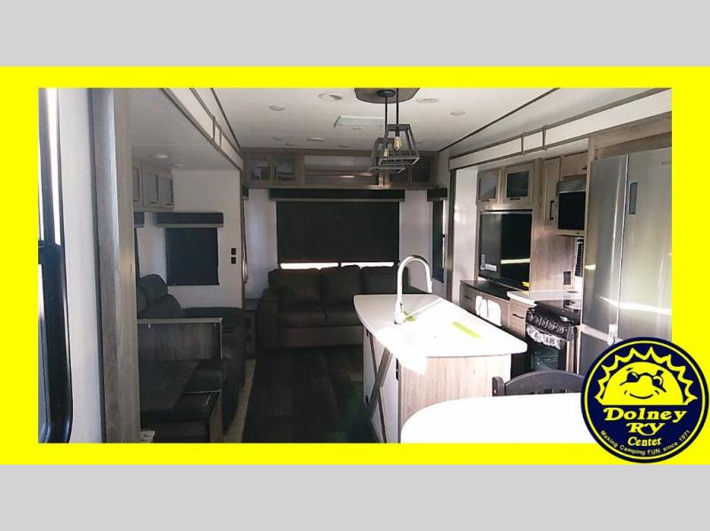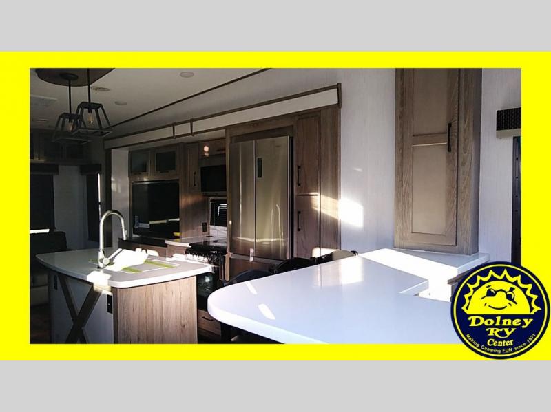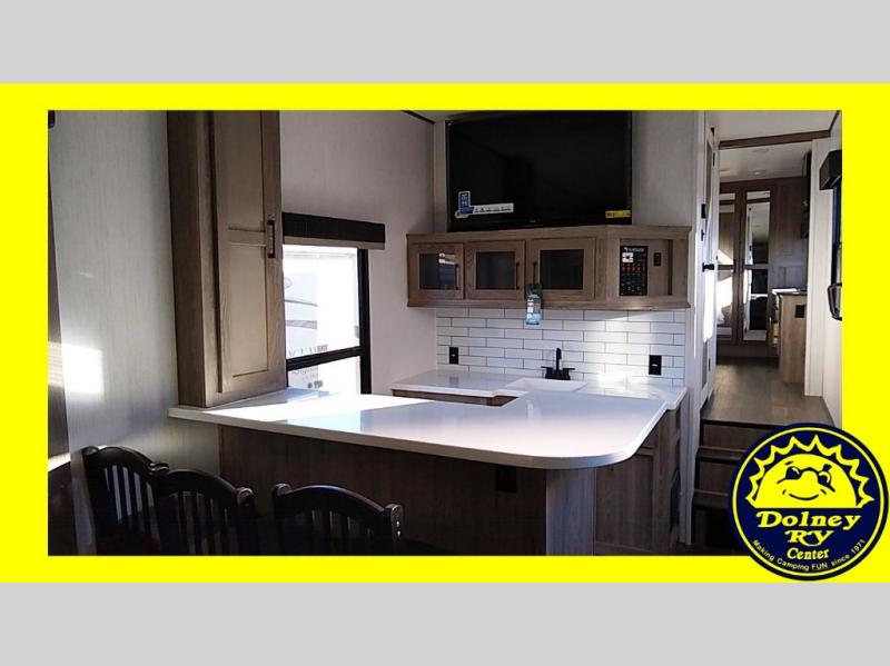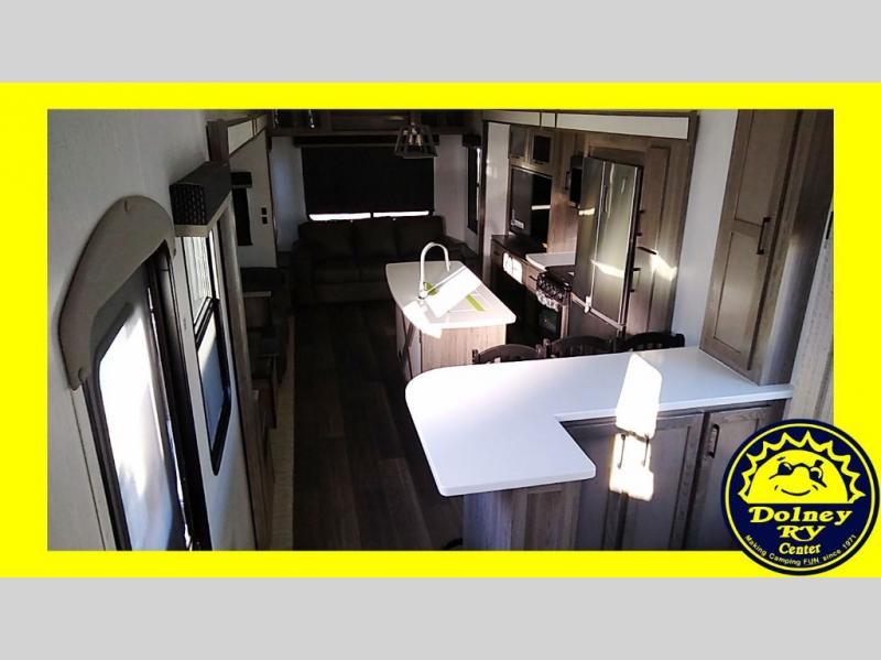 Your family will love camping in this fifth wheel or making it your full-time RV. Once you arrive at your destination, prepare a cold drink at the bar area. Here, you'll appreciate a counter with stools, a sink to wash up, and a mini fridge to keep your beverages cold. There is also a free-standing dinette table where the kids can play a game of cards at, and theater seating to kick your feet up. You and your spouse will love the front private bedroom, while the grandkids sleep on the sofa in the rear living area. In the morning, prepare breakfast on the three burner cooktop before heading out to find a trail or two!