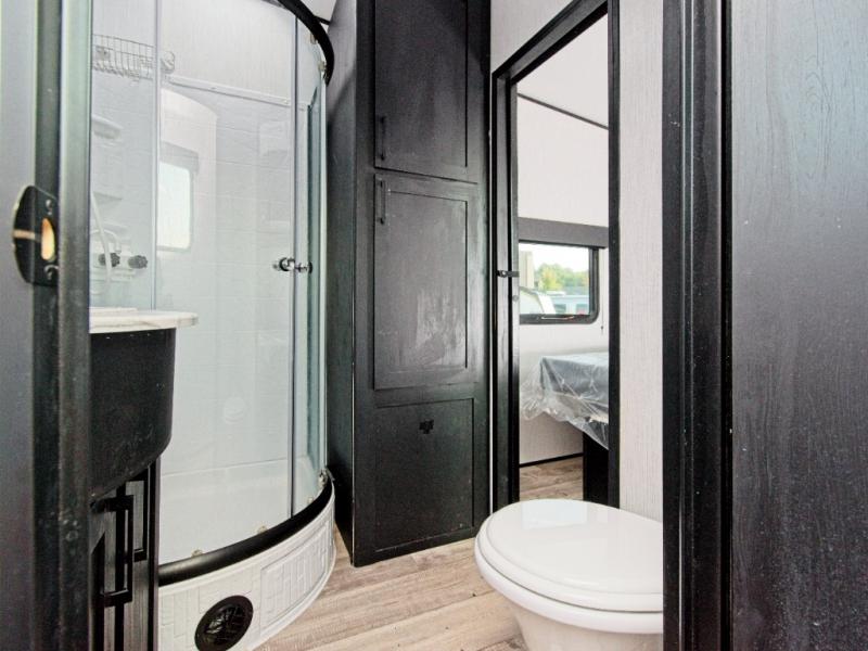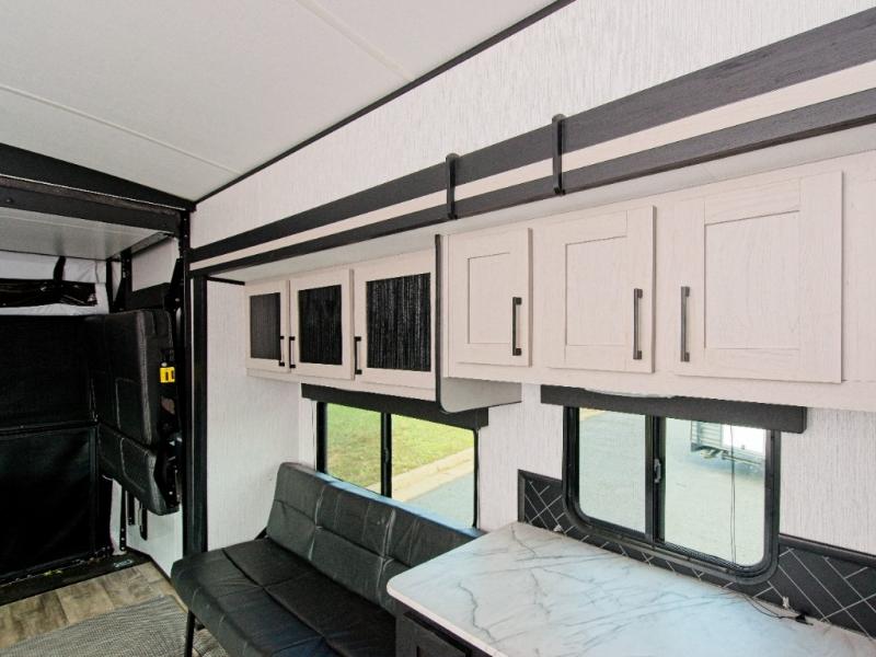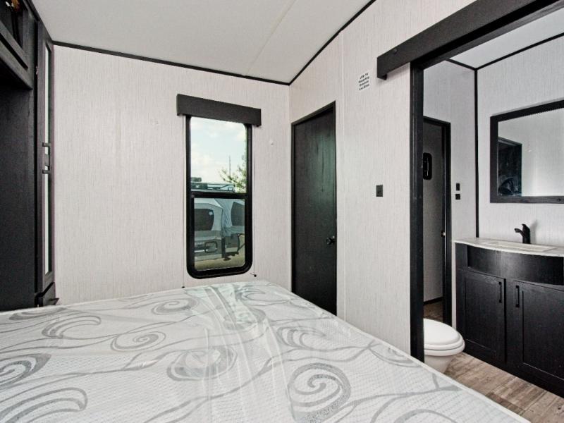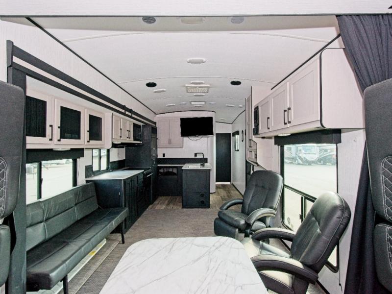 Enjoy meals at the sofa table or between the dual lounge chairs, and cook with ease using the three-burner range, microwave, and 8 cu. ft. refrigerator. The dual-entry bathroom adds privacy and convenience, accessible from both the hallway and the master suite.