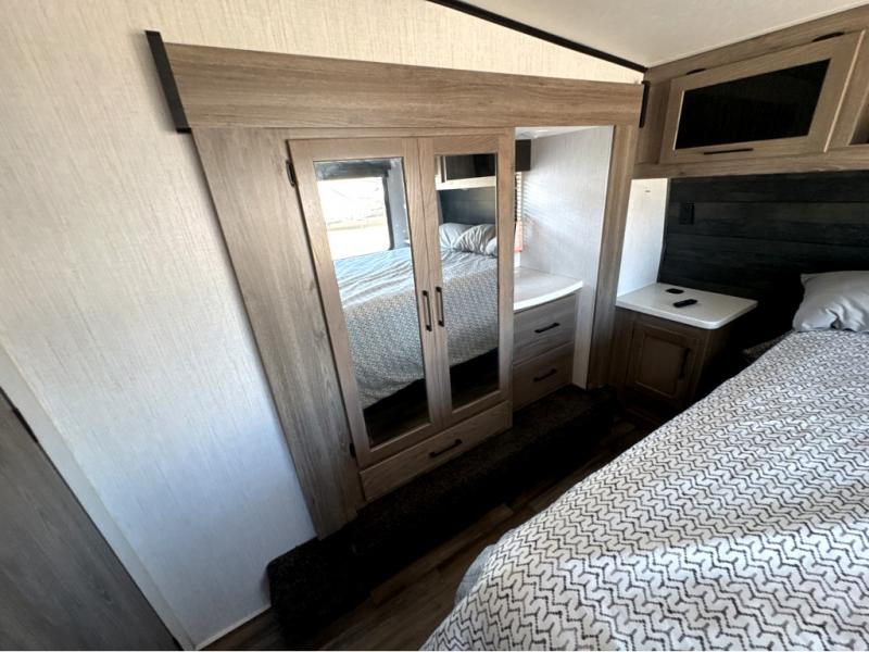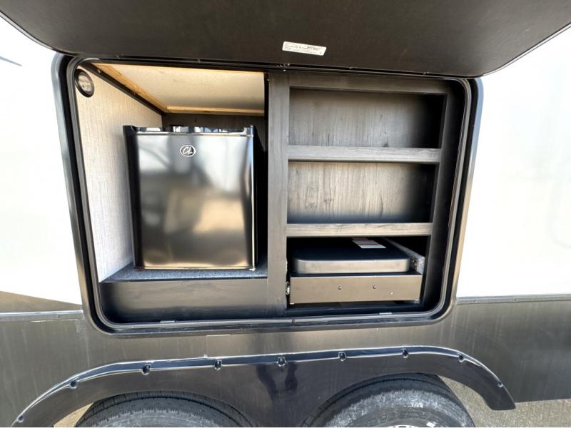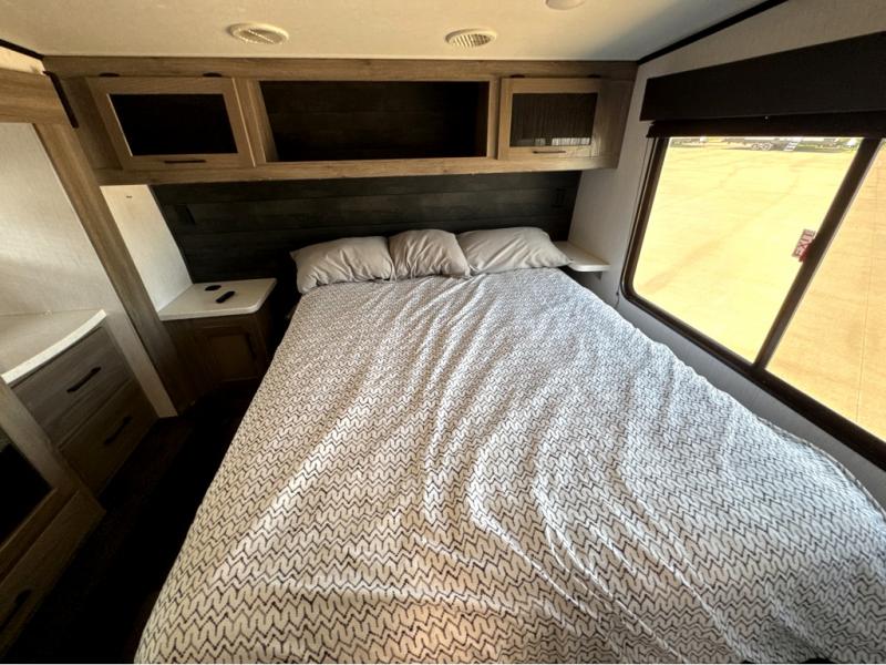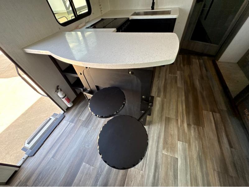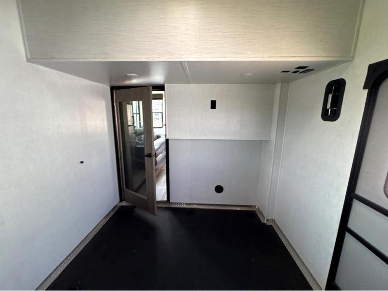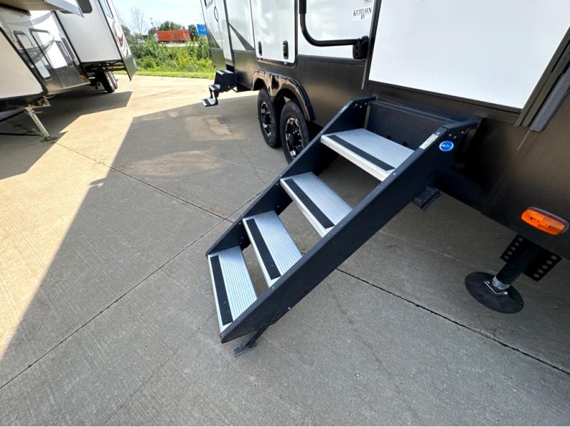 Whether you choose to bring along kayaks, dirt bikes, or a side-by-side, this toy hauler is equipped for all your adventures. Once you unload using the ramp door, you can relax on the convertible sofa while your teens climb in the loft area. The main living area is made spacious thanks to the slide out that includes reclining sofa seating with cup holders and USB ports. The chef of your group can prepare meals on the three burner cooktop, or use the microwave oven inside, and there is also an outdoor kitchen that is perfect when you want to cook and eat outdoors. There is a stainless steel refrigerator here, plus a counter with swing-out stools the all are sure to love. The dual entry bath includes a shower with a seat for convenience, and you'll love the front private bedroom with a king bed and a wardrobe slide for more space!