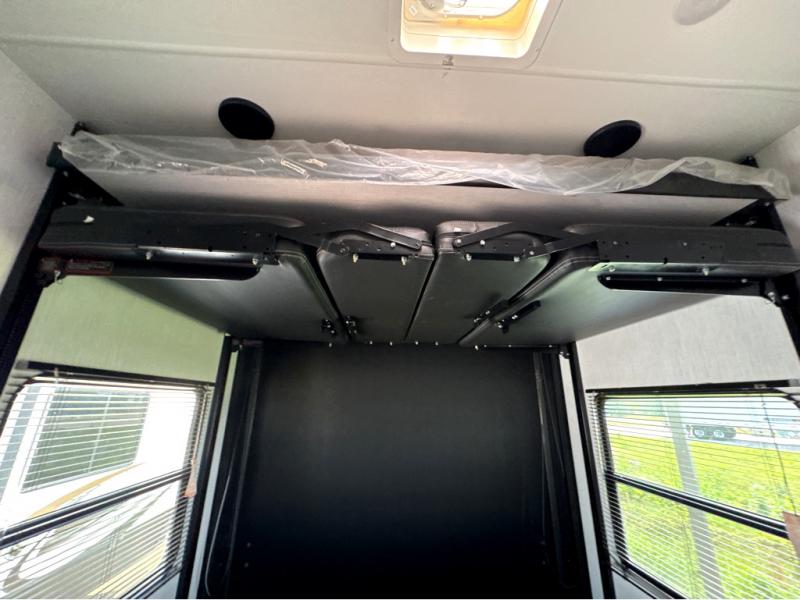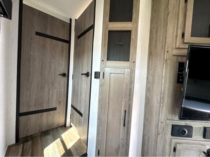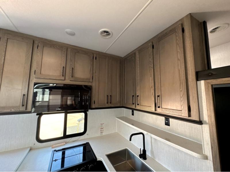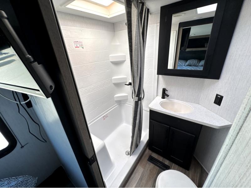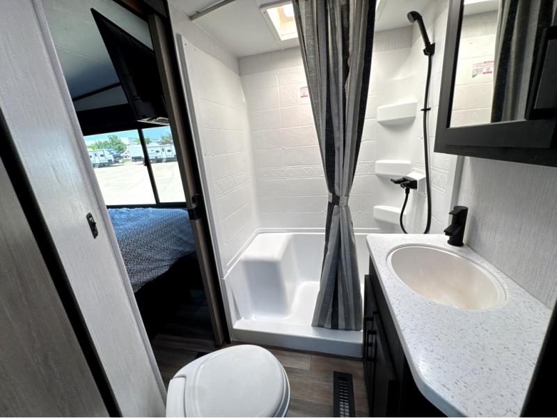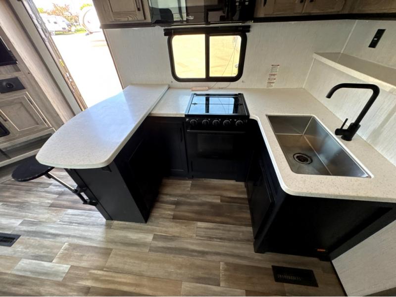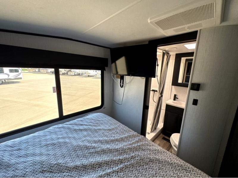 Whether you choose to bring along kayaks, dirt bikes, or a side-by-side, this toy hauler is equipped for all your adventures. Once you unload using the ramp door, you can relax on the convertible sofa while your teens climb in the loft area. The main living area is made spacious thanks to the slide out that includes reclining sofa seating with cup holders and USB ports. The chef of your group can prepare meals on the three burner cooktop, or use the microwave oven inside, and there is also an outdoor kitchen that is perfect when you want to cook and eat outdoors. There is a stainless steel refrigerator here, plus a counter with swing-out stools the all are sure to love. The dual entry bath includes a shower with a seat for convenience, and you'll love the front private bedroom with a king bed and a wardrobe slide for more space!