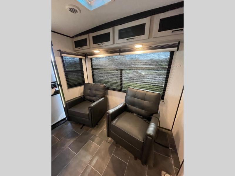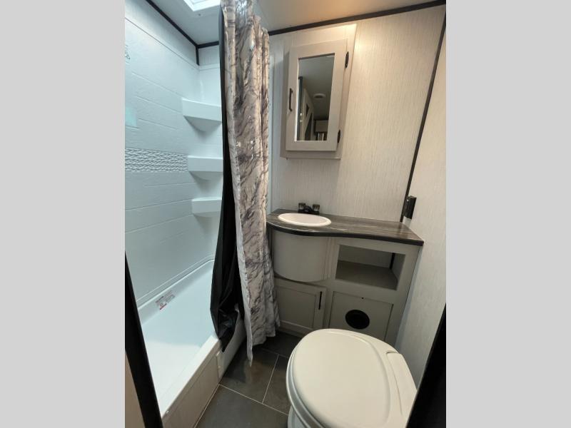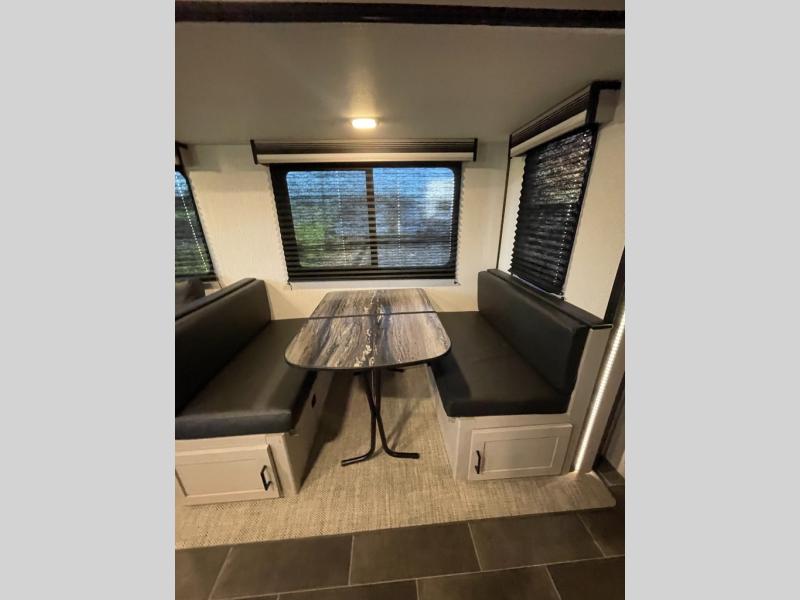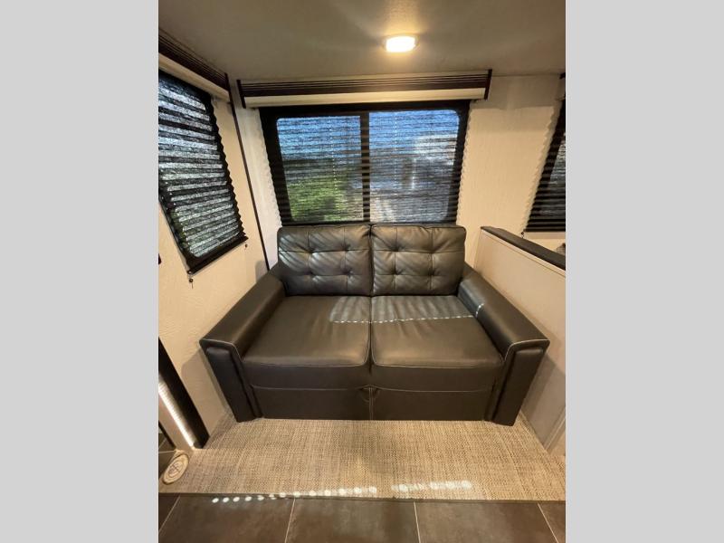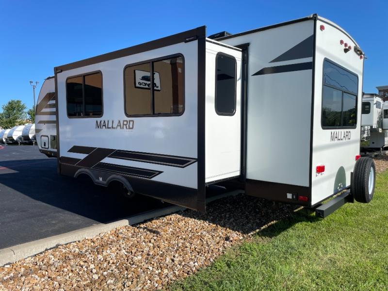 You won't ever want to leave the campground once you start camping in this dual-entry Mallard travel trailer! There is plenty of seating for everyone between the rear set of lounge chairs and the sofa next to the booth dinette, both of which can transform into extra sleeping space when needed. You will have no problem whipping up your favorite meals inside the complete kitchen, and the 8-cu. ft. double-door refrigerator is big enough to keep all of your perishables cold and fresh. What better way to wind down your night than to take a nice, hot shower in the full bathroom before heading into the front private bedroom to enjoy a good night's rest on the king bed.