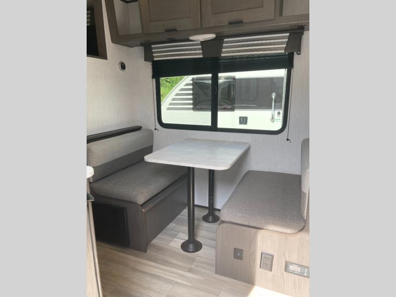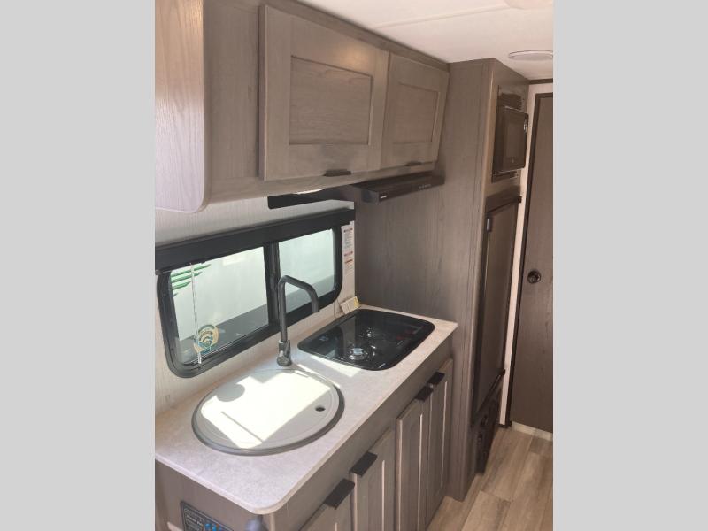 Have a fun family vacation in this travel trailer! The kids can sleep on the set of double bunk beds and you can sleep on the front queen bed which has drawers underneath for your camping essentials. You could even transform the booth dinette into an extra sleeping space if needed. Prepare your best home cooked meals with the two burner cooktop and the 5 cu. ft. refrigerator. Everyone can stay squeaky clean in the rear corner bathroom with the shower/tub surround with a skylight above for added natural lighting as you get ready. There is even an exterior full pas-through storage area to bring all of your favorite outdoor gear!