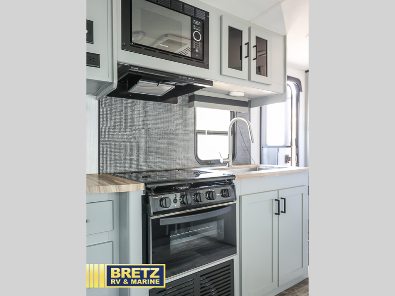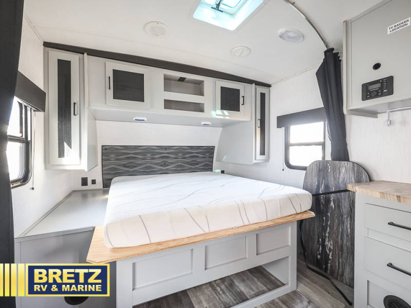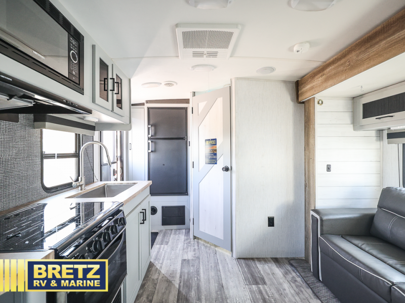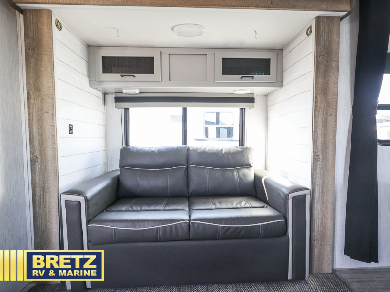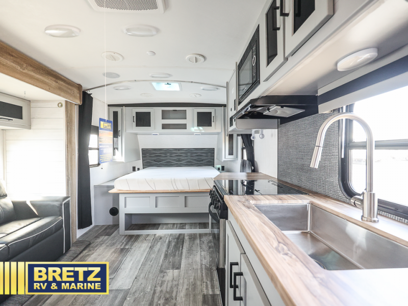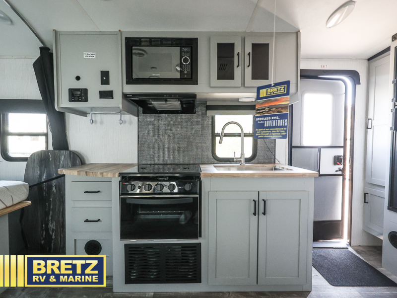 This is the perfect couple's trailer for your weekend excursions. You will love having your own king bed up front that also includes a privacy curtain. The sofa with a table will provide a place to dine at each day, and an overnight guest can sleep here as well. You'll find a three burner cooktop and a microwave oven in the kitchen, as well as a stainless steel sink and a pantry for snacks. After dinner, head outdoors to relax under the 12' power awning LED lights before turning in for the night.