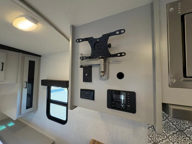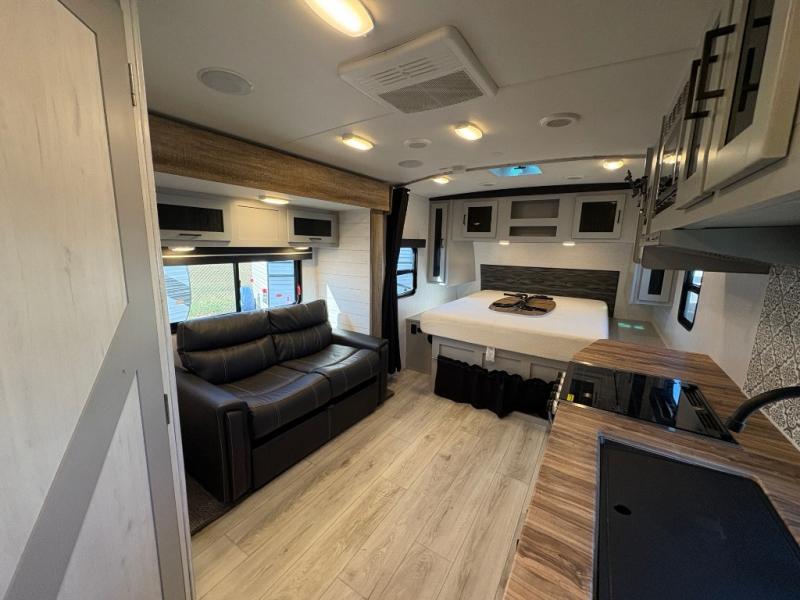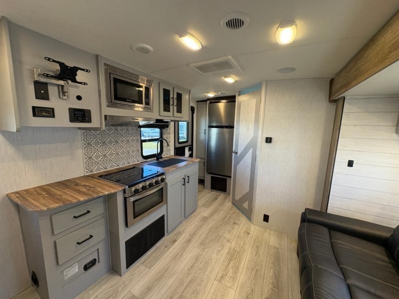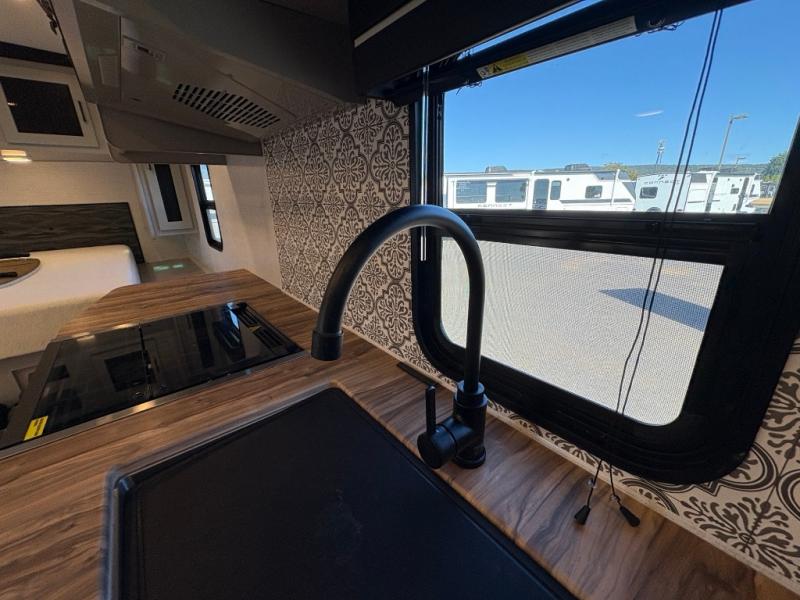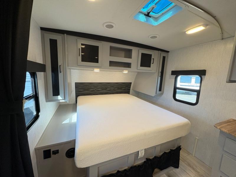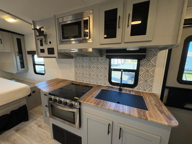 This is the perfect couple's trailer for your weekend excursions. You will love having your own king bed up front that also includes a privacy curtain. The sofa with a table will provide a place to dine at each day, and an overnight guest can sleep here as well. You'll find a three burner cooktop and a microwave oven in the kitchen, as well as a stainless steel sink and a pantry for snacks. After dinner, head outdoors to relax under the 12' power awning LED lights before turning in for the night.