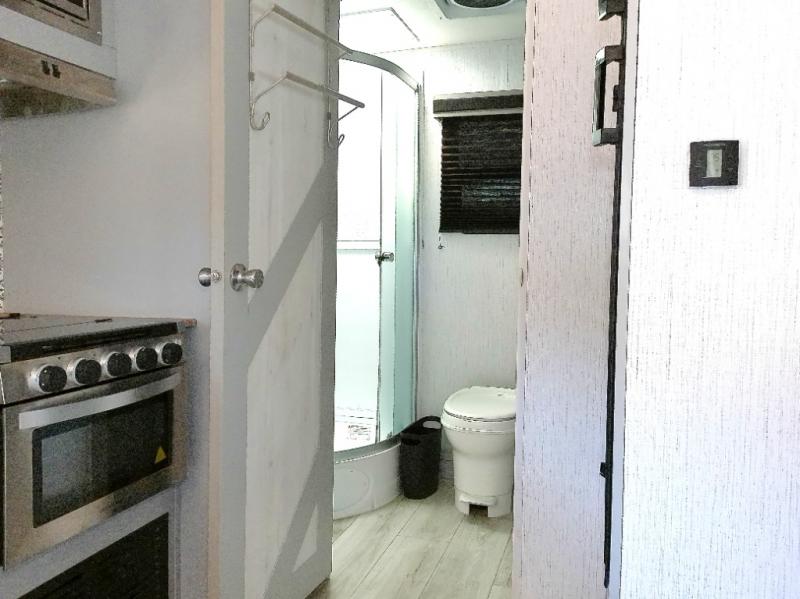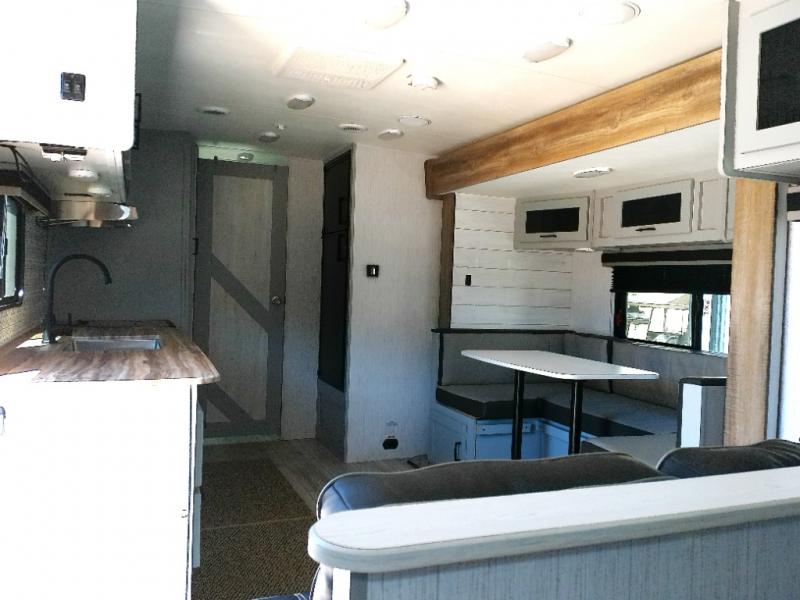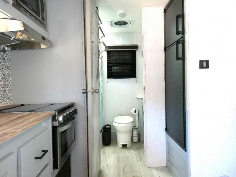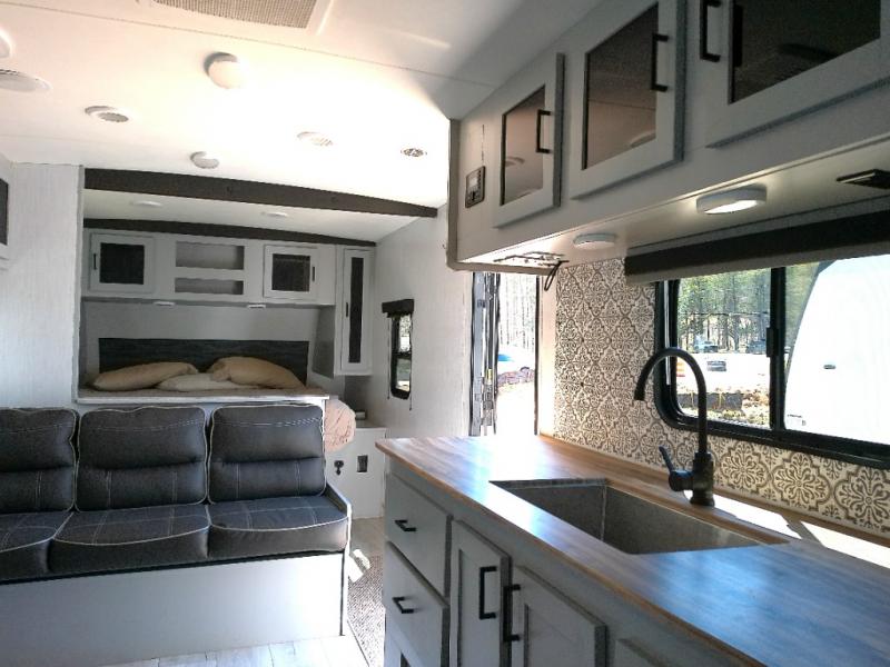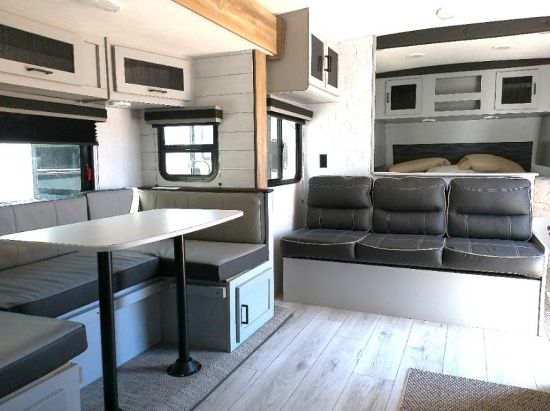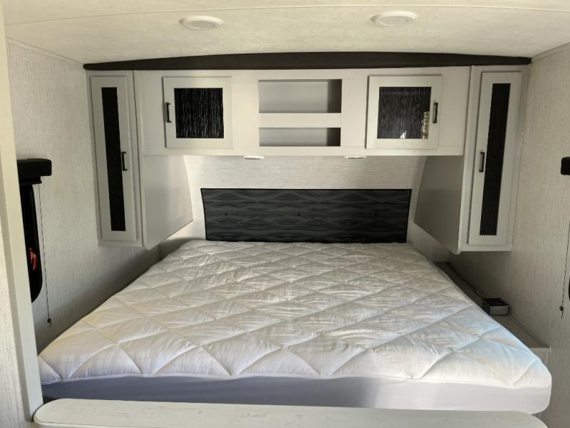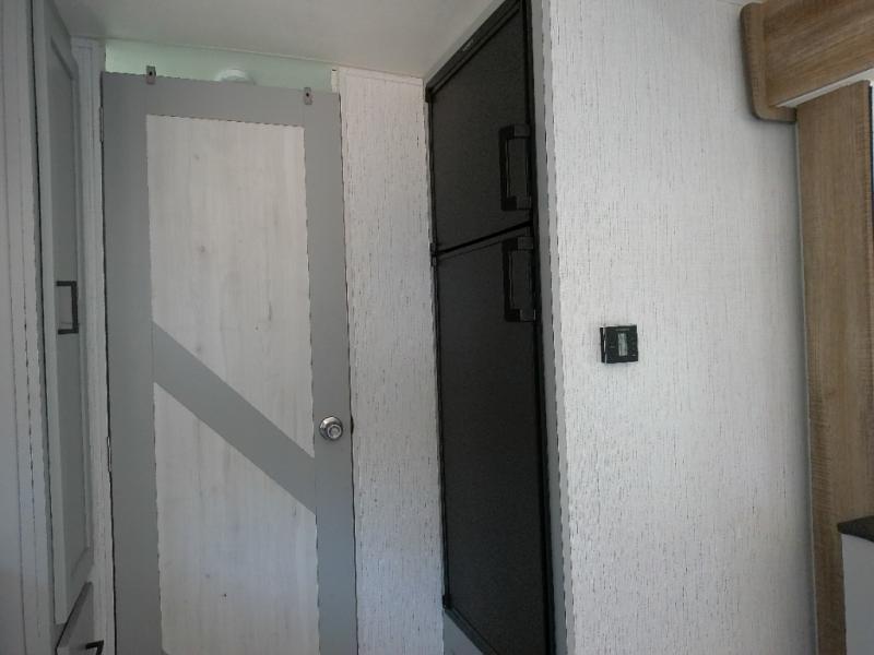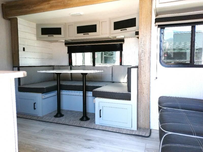 This travel trailer is both spacious and comfortable for all your camping needs. The U-shaped dinette within the slide out will be perfect to dine around each day, plus there is a sofa here as well to relax with a good book. The full rear bath has a convenient pantry to store clean towels and toiletries, and there is also a kitchen pantry for snacks. You will enjoy your own bedroom up front with a Comfort Select gel-infused king bed and a privacy curtain. It will be a snap to prepare breakfast each morning on the three burner range, and the milk can go back in the 8 cu. ft. refrigerator!