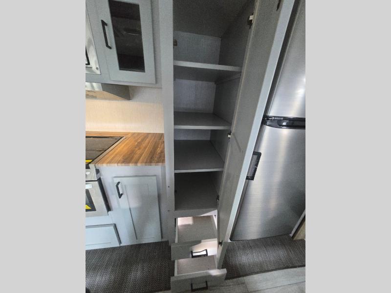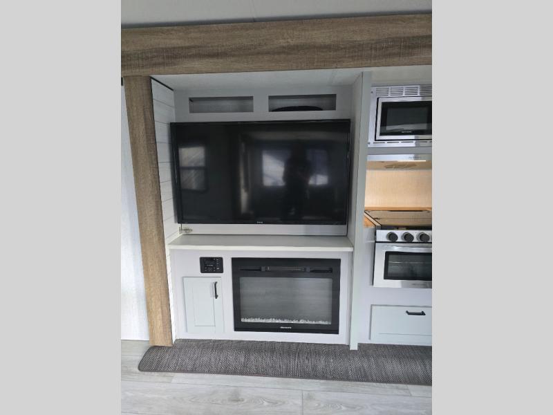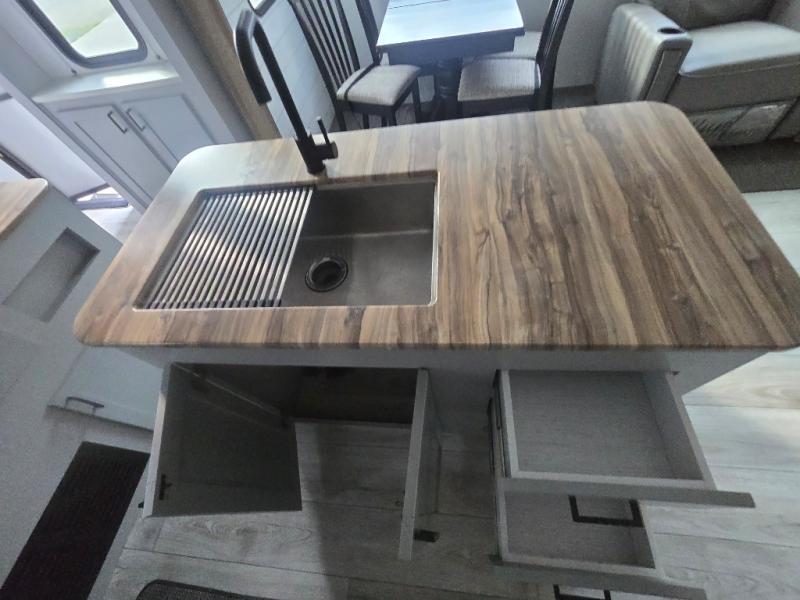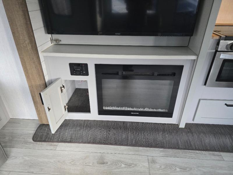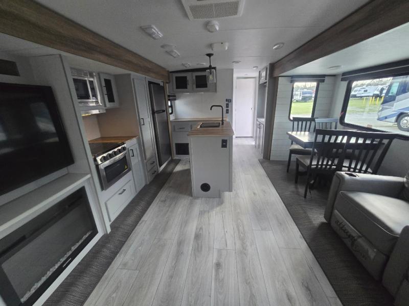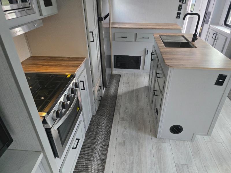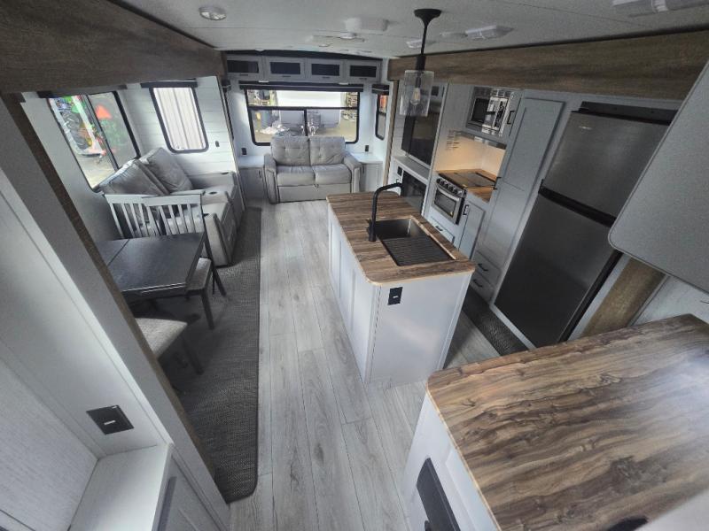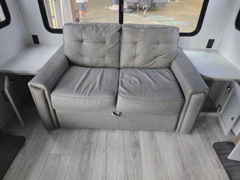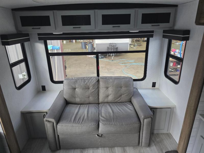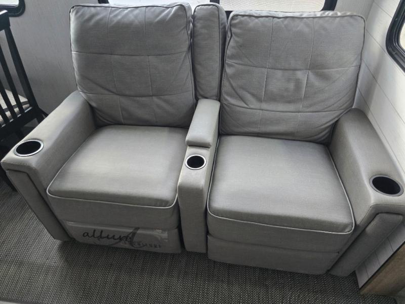 You'll feel right at home in this spacious travel trailer. Once you arrive at your destination, set up the 14' power awning, and enjoy a cold drink before unpacking. The rear living area includes a sofa with end tables, a table with chairs, plus theater seats right across from the entertainment center. The chef of your group will appreciate the extra counter space provided by the kitchen island, plus there is a hutch with even more storage and counter space. Meals can be prepared on the three burner range, and snacks can be stored in the large pantry. This model also includes a dual entry bath that will create a front master bedroom you are sure to love. Here, you'll find a slide out king bed, a dresser with overhead cabinets, plus a walk-in closet that also includes washer and dryer prep. Going full-time has never been easier than in this travel trailer!