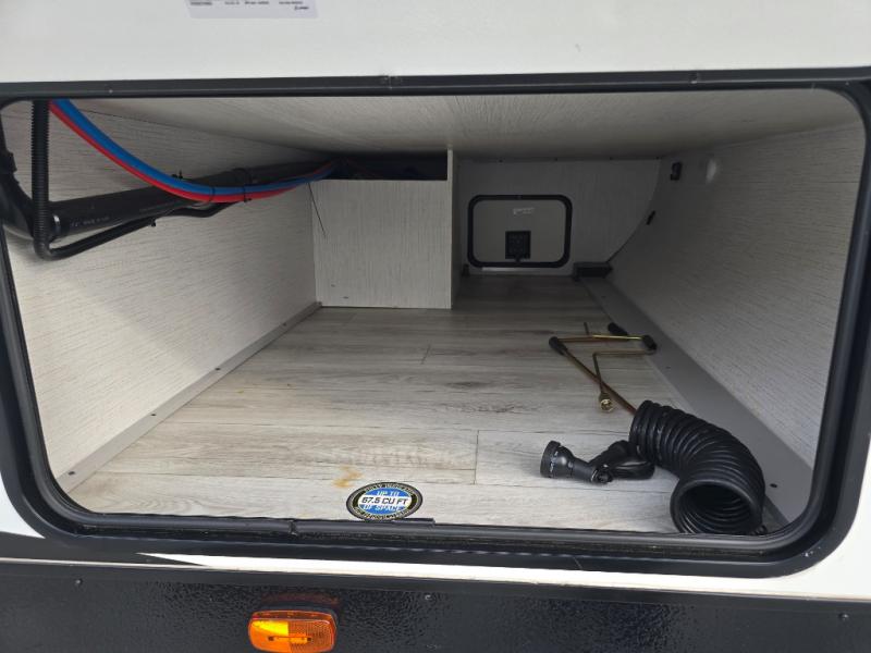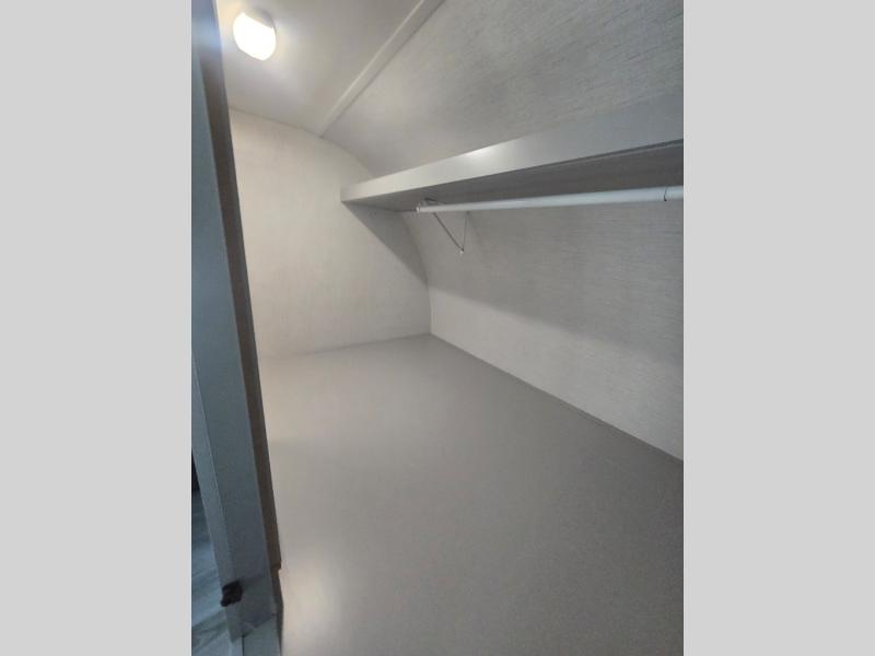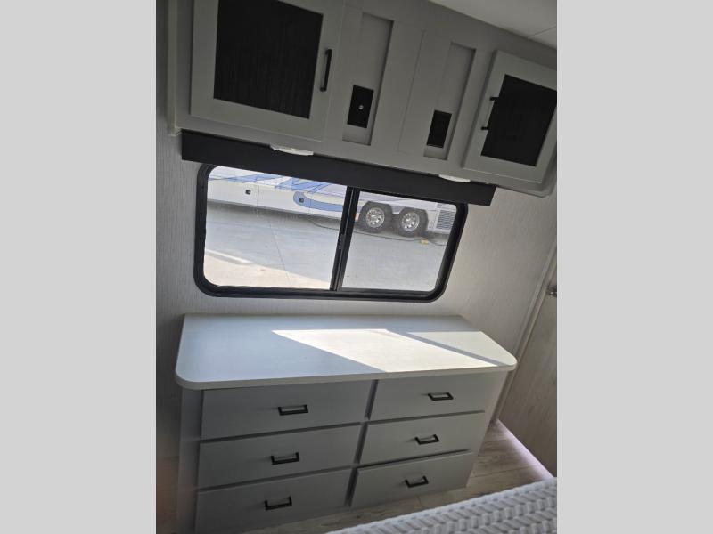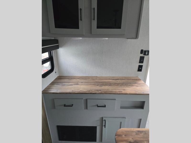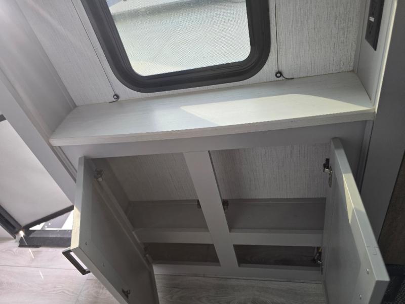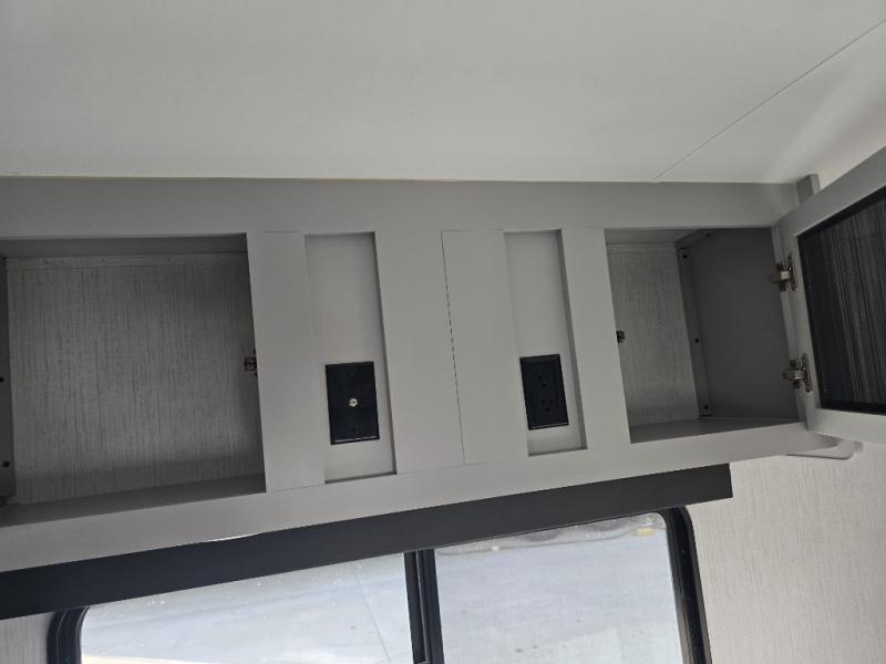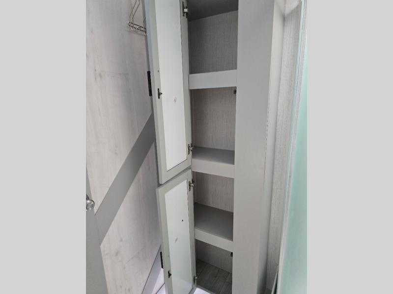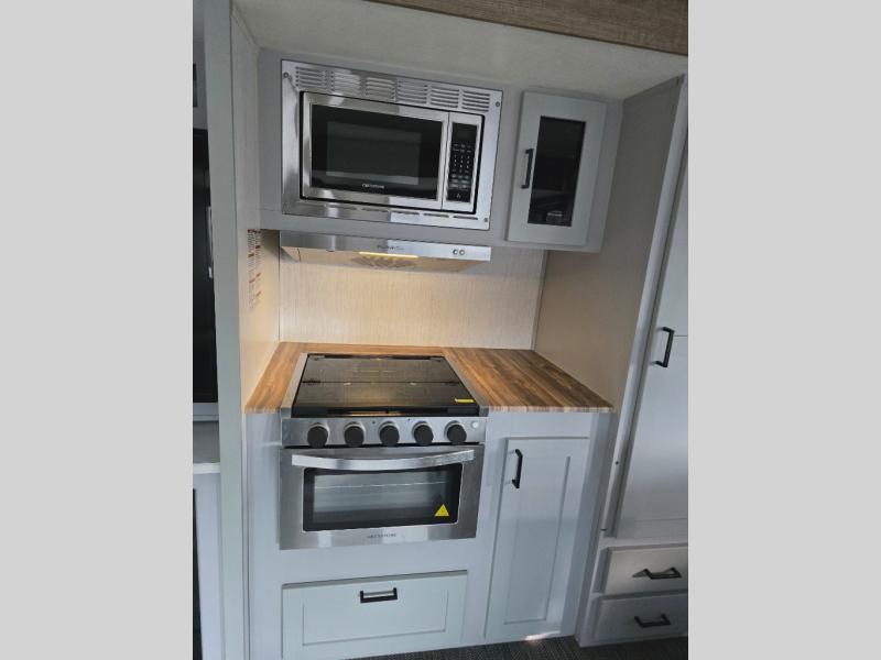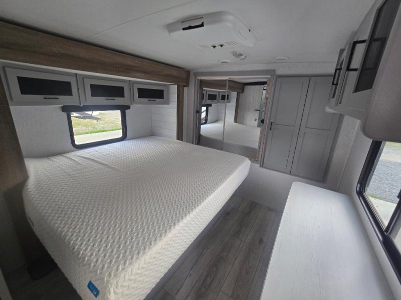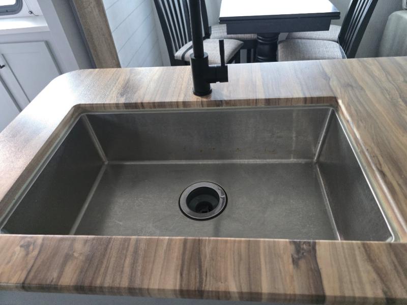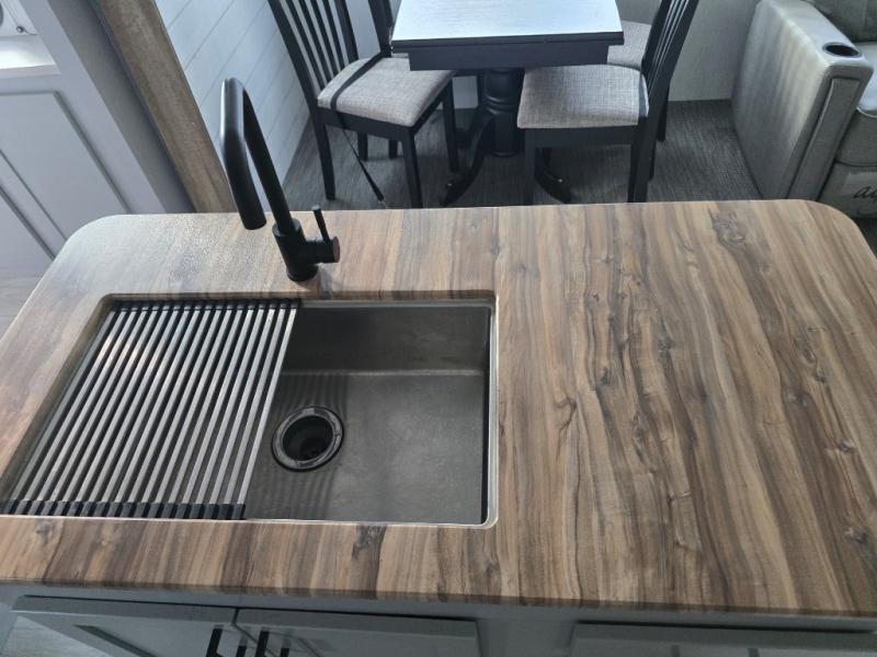 You'll feel right at home in this spacious travel trailer. Once you arrive at your destination, set up the 14' power awning, and enjoy a cold drink before unpacking. The rear living area includes a sofa with end tables, a table with chairs, plus theater seats right across from the entertainment center. The chef of your group will appreciate the extra counter space provided by the kitchen island, plus there is a hutch with even more storage and counter space. Meals can be prepared on the three burner range, and snacks can be stored in the large pantry. This model also includes a dual entry bath that will create a front master bedroom you are sure to love. Here, you'll find a slide out king bed, a dresser with overhead cabinets, plus a walk-in closet that also includes washer and dryer prep. Going full-time has never been easier than in this travel trailer!