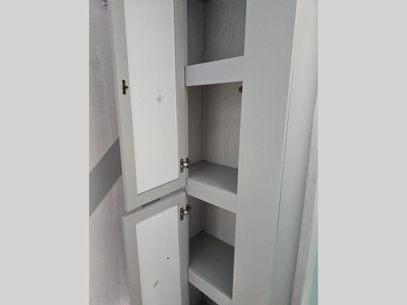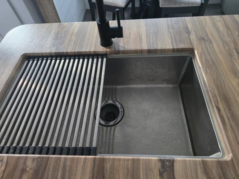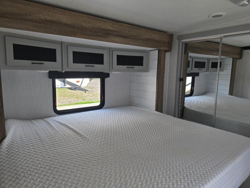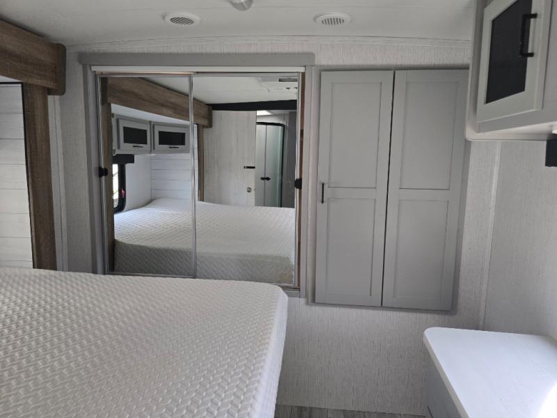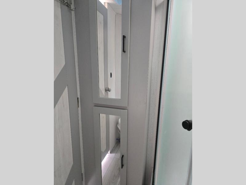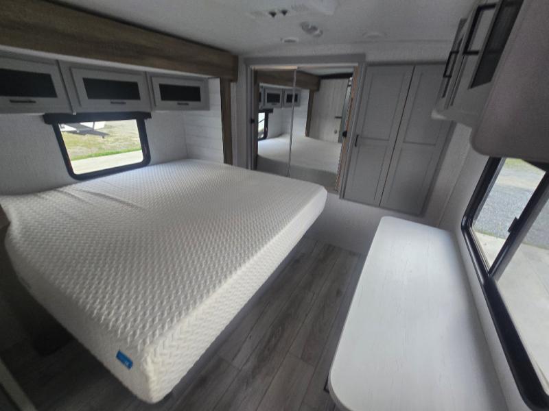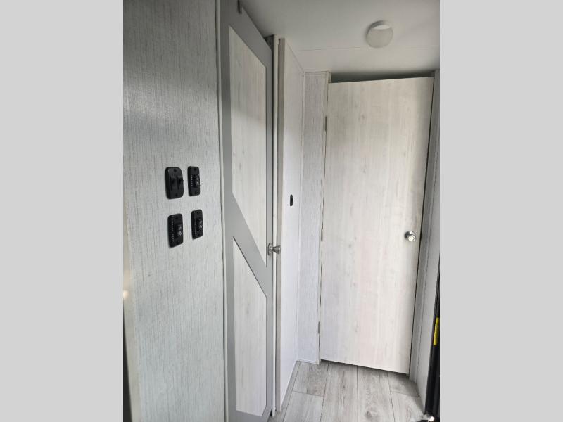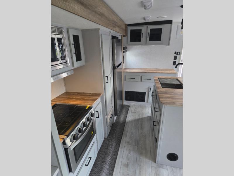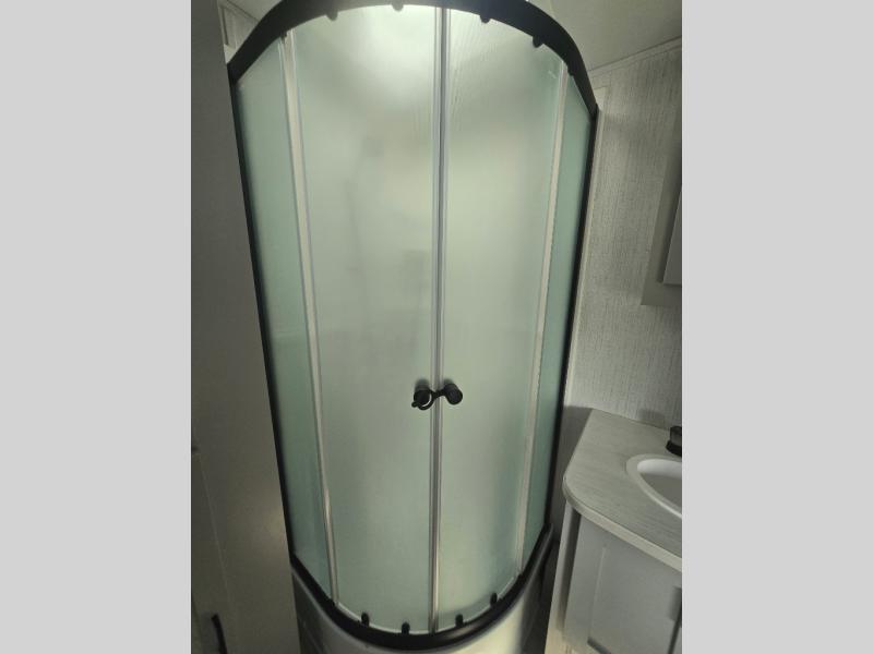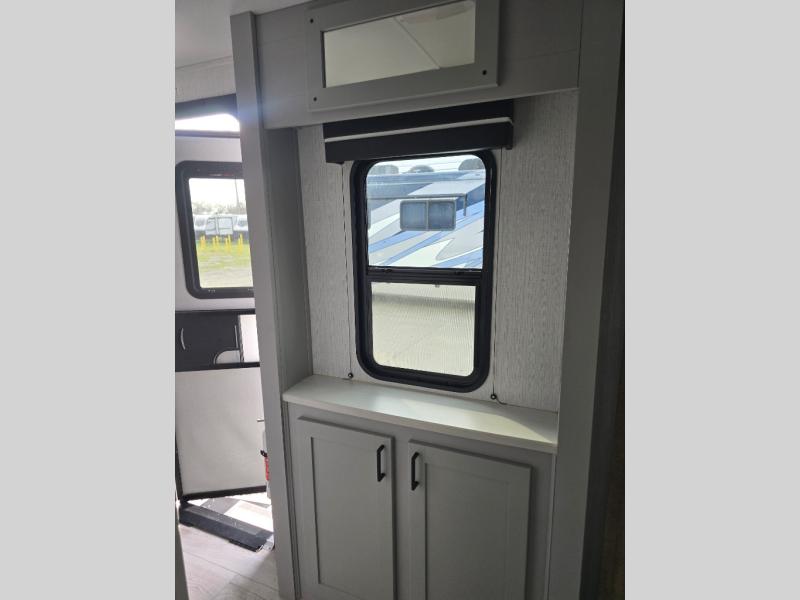 You'll feel right at home in this spacious travel trailer. Once you arrive at your destination, set up the 14' power awning, and enjoy a cold drink before unpacking. The rear living area includes a sofa with end tables, a table with chairs, plus theater seats right across from the entertainment center. The chef of your group will appreciate the extra counter space provided by the kitchen island, plus there is a hutch with even more storage and counter space. Meals can be prepared on the three burner range, and snacks can be stored in the large pantry. This model also includes a dual entry bath that will create a front master bedroom you are sure to love. Here, you'll find a slide out king bed, a dresser with overhead cabinets, plus a walk-in closet that also includes washer and dryer prep. Going full-time has never been easier than in this travel trailer!