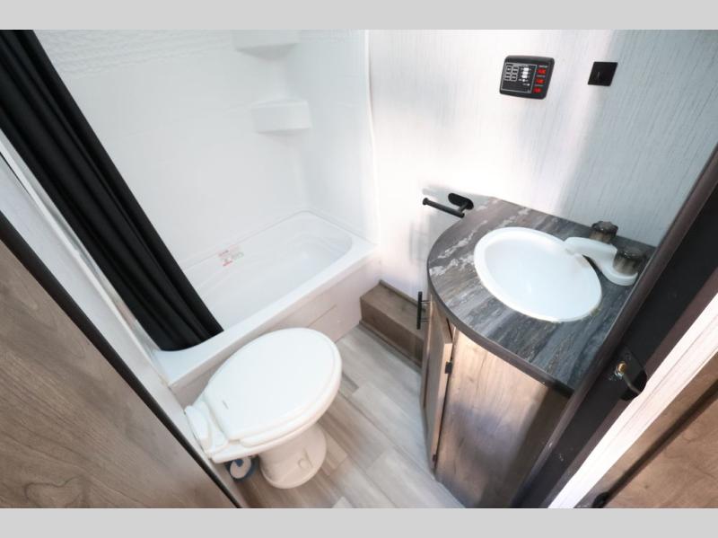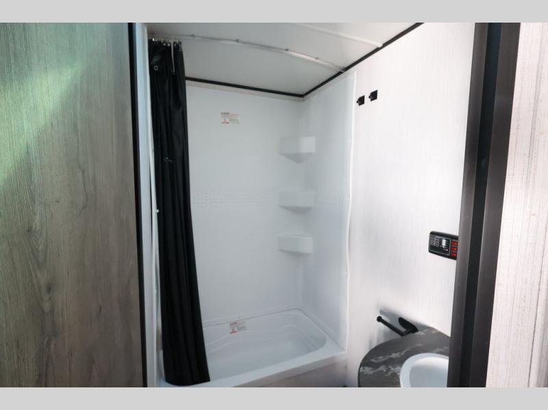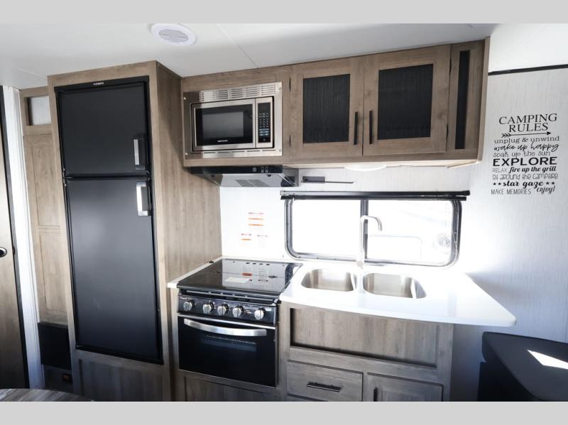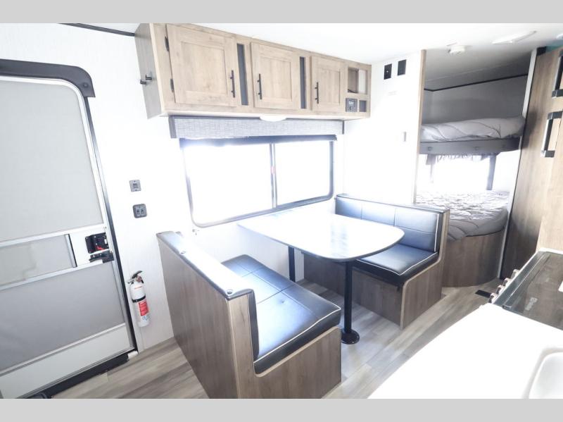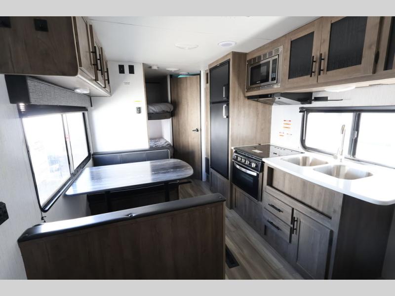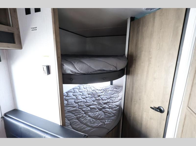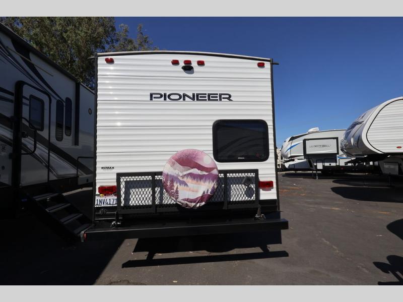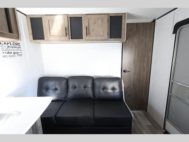 This Pioneer allows the kids their own space on the double-size bunks while you have your own space in the front private bedroom with a queen bed and storage. There is seating in the main living and kitchen area on the sofa and booth dinette, plus both of these furnishings provide sleeping space when needed. The cook will have a three-burner cooktop and a microwave to make warm meals, and an 8 cu. ft. refrigerator to store lots of cold food and drinks. You will find overhead cabinets and more storage throughout for your games, snacks, and such, plus there is a full bathroom to keep everyone clean.